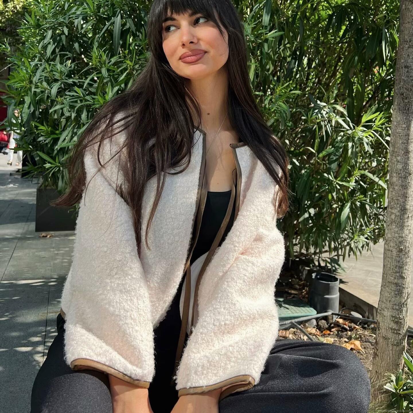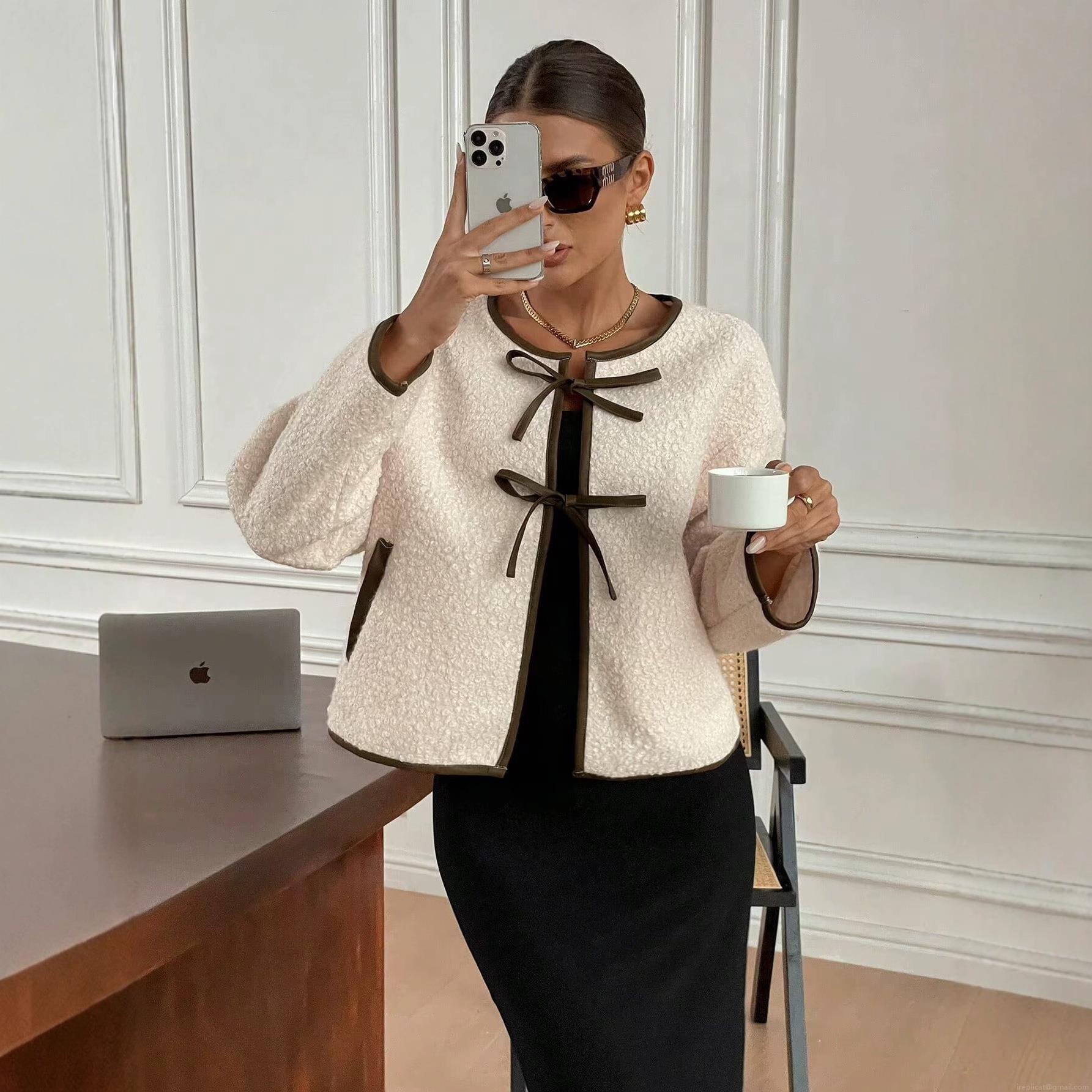 • Women's Lamb Wool Coat Contrast Leather Piping Bow Tie Round Neck Loose Short Jacket For Winter Autumn Elegant Commute Sweet Lady Outerwear