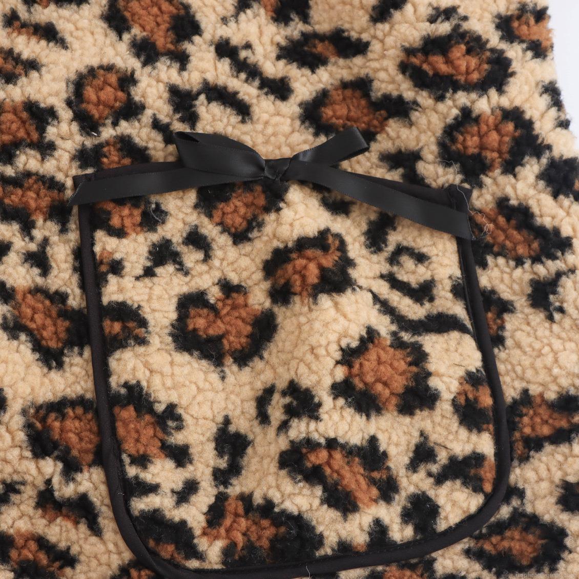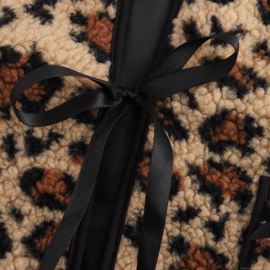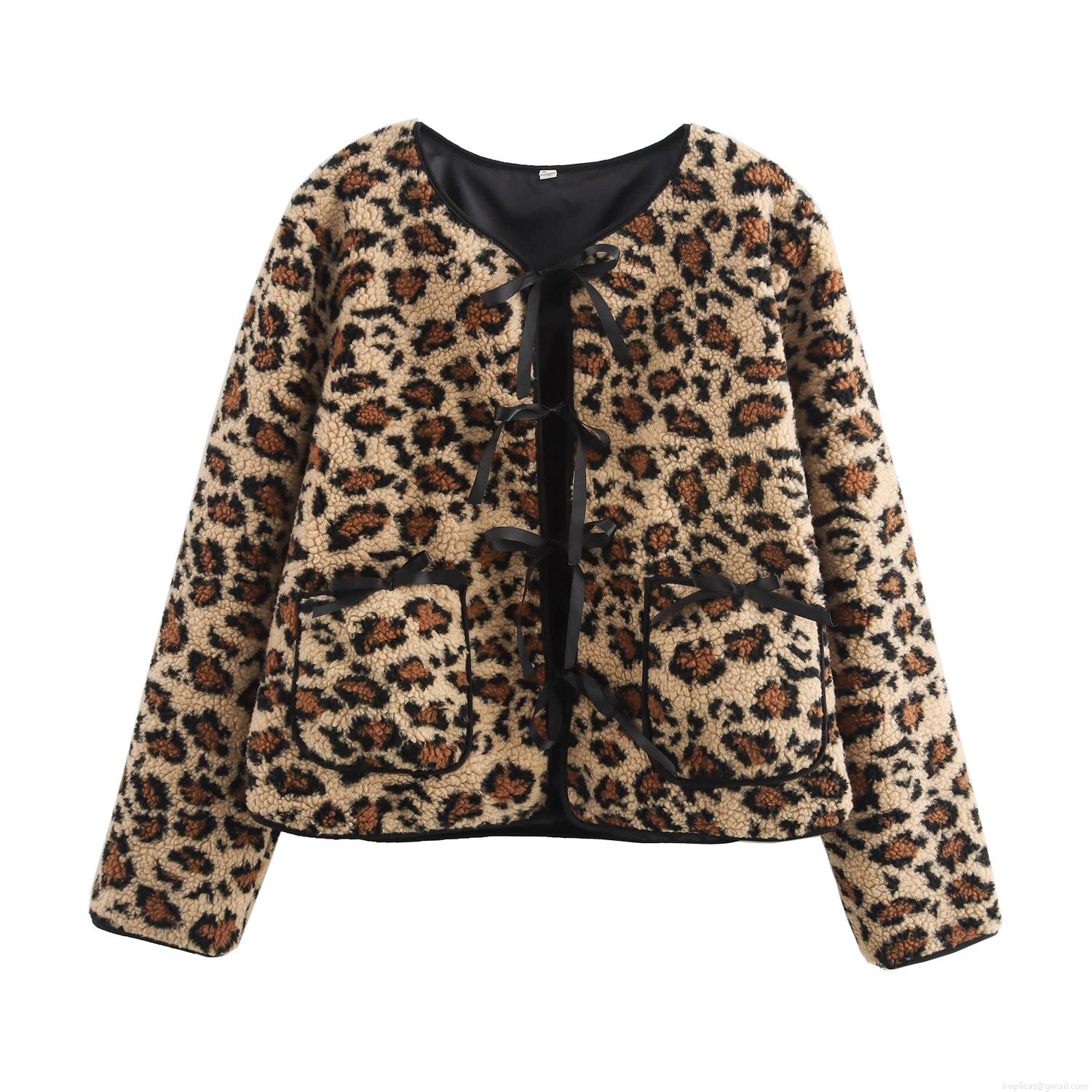 • Women's Leopard Print Faux Sherpa Fleece Jacket American Retro Loose Fit Bow Tie Closure Outerwear Casual Warm Fall Long Sleeve Coat for Ladies