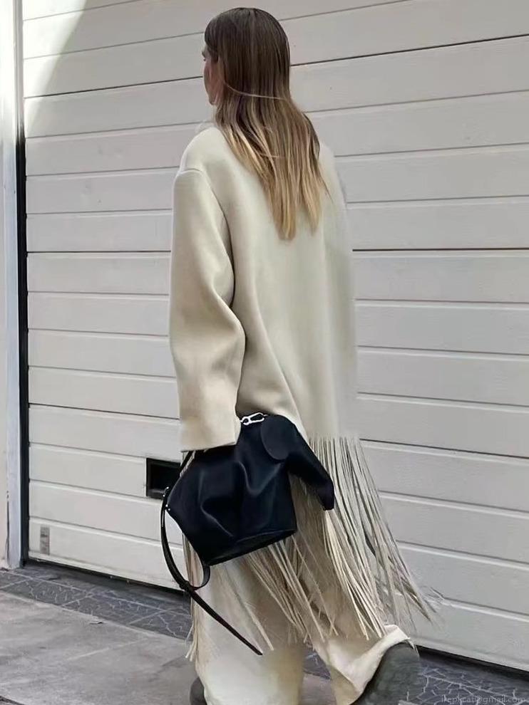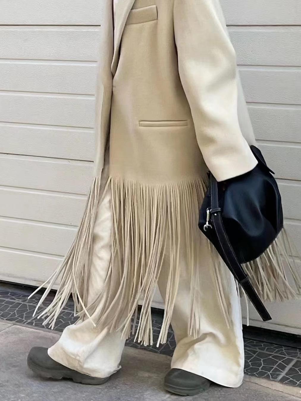 Women's Long Fringe Hem Wool Blend Coat Chic Lapel Single Button Solid Color Streetwear Outerwear For Autumn Winter Ladies