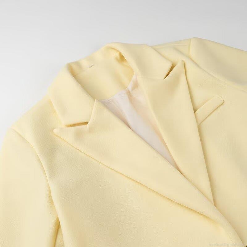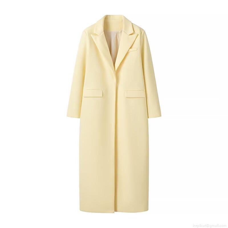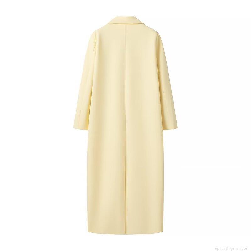 Women's Long Woolen Coat Elegant Loose Fit Polyester Blend Notched Lapel Solid Pale Yellow Overcoat Casual Autumn Winter Jacket For Women