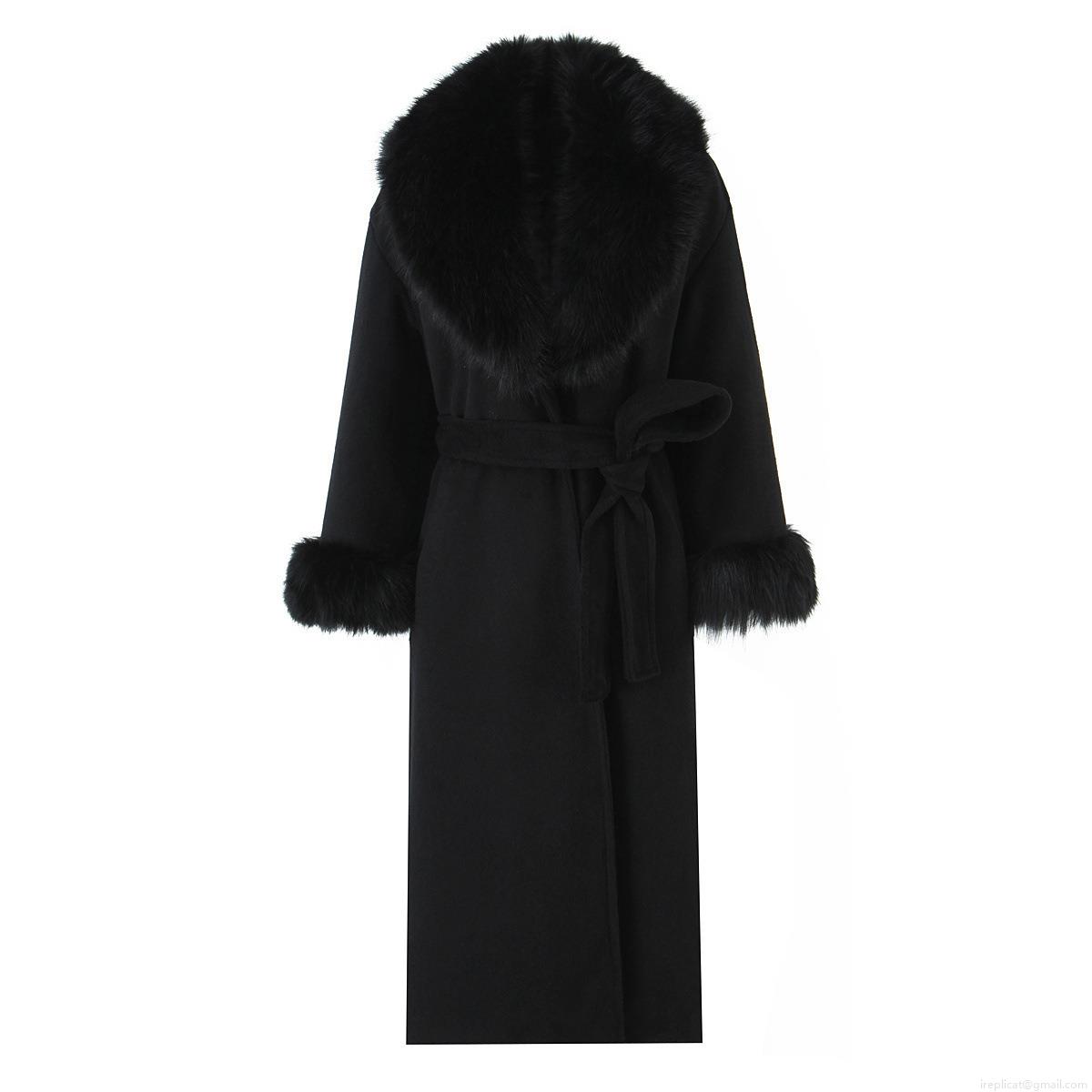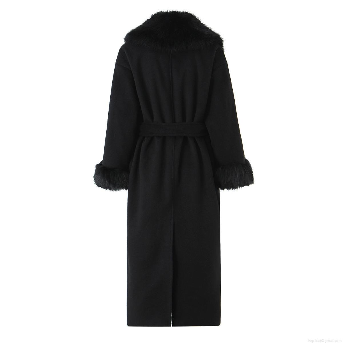 • Women's Long Woolen Coat With Black Faux Fur Collar And Cuffs Elegant Tie-Waist Winter Overcoat Warm Polyester Outerwear For Women