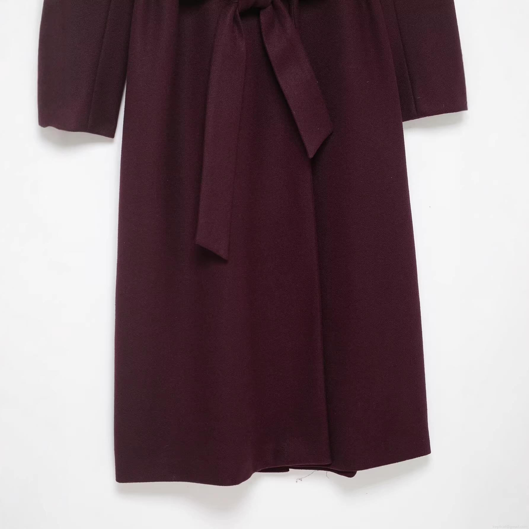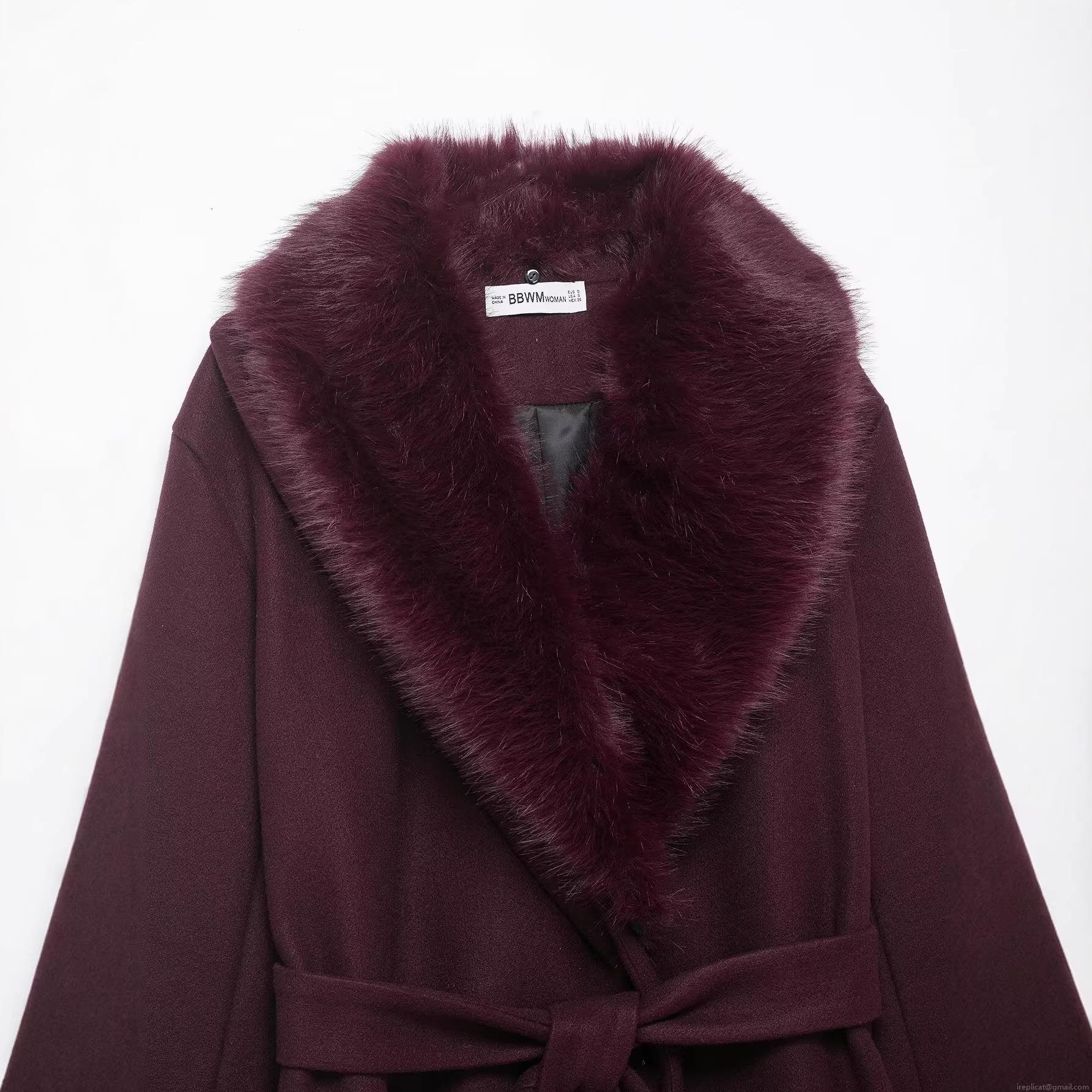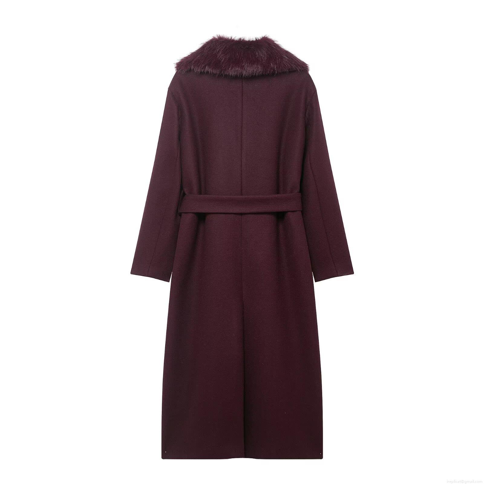 Women's Long Woolen Overcoat 100% Polyester Fabric Detachable Fur Collar Elegant Tie-Up Waist Belt Coat Burgundy Winter Warm Outerwear Fashion Lady Jacket