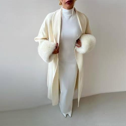 • Women's Long Woolen Overcoat With Faux Fur Cuffs Lace-up Belted Lapel Solid Color Warm Winter Coat Elegant Socialite Style Casual Outerwear For Women