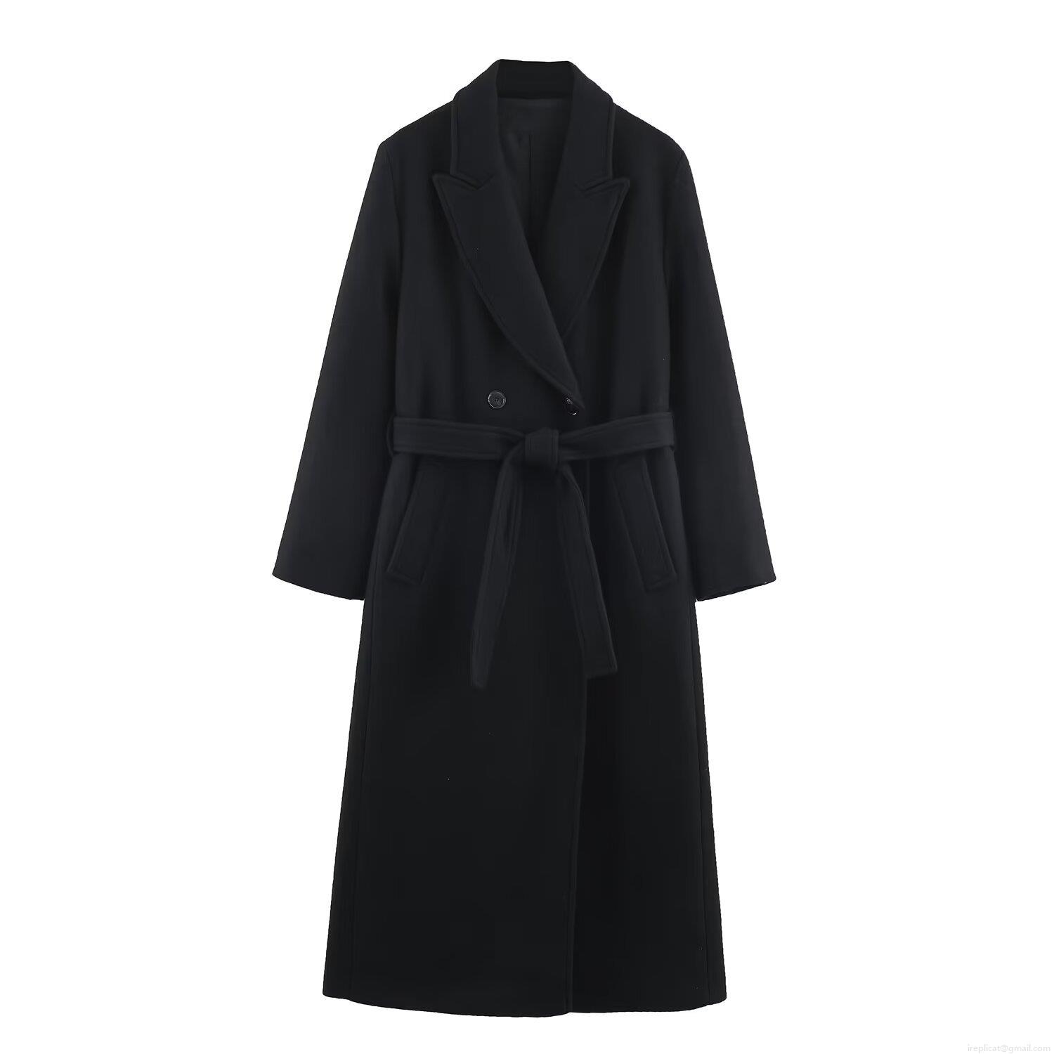 Women's Long Wool-Like Coat Polyester Double Breasted Belted Jacket Trench Coat For Winter Autumn Western Style Elegant Lady Outerwear Solid Color