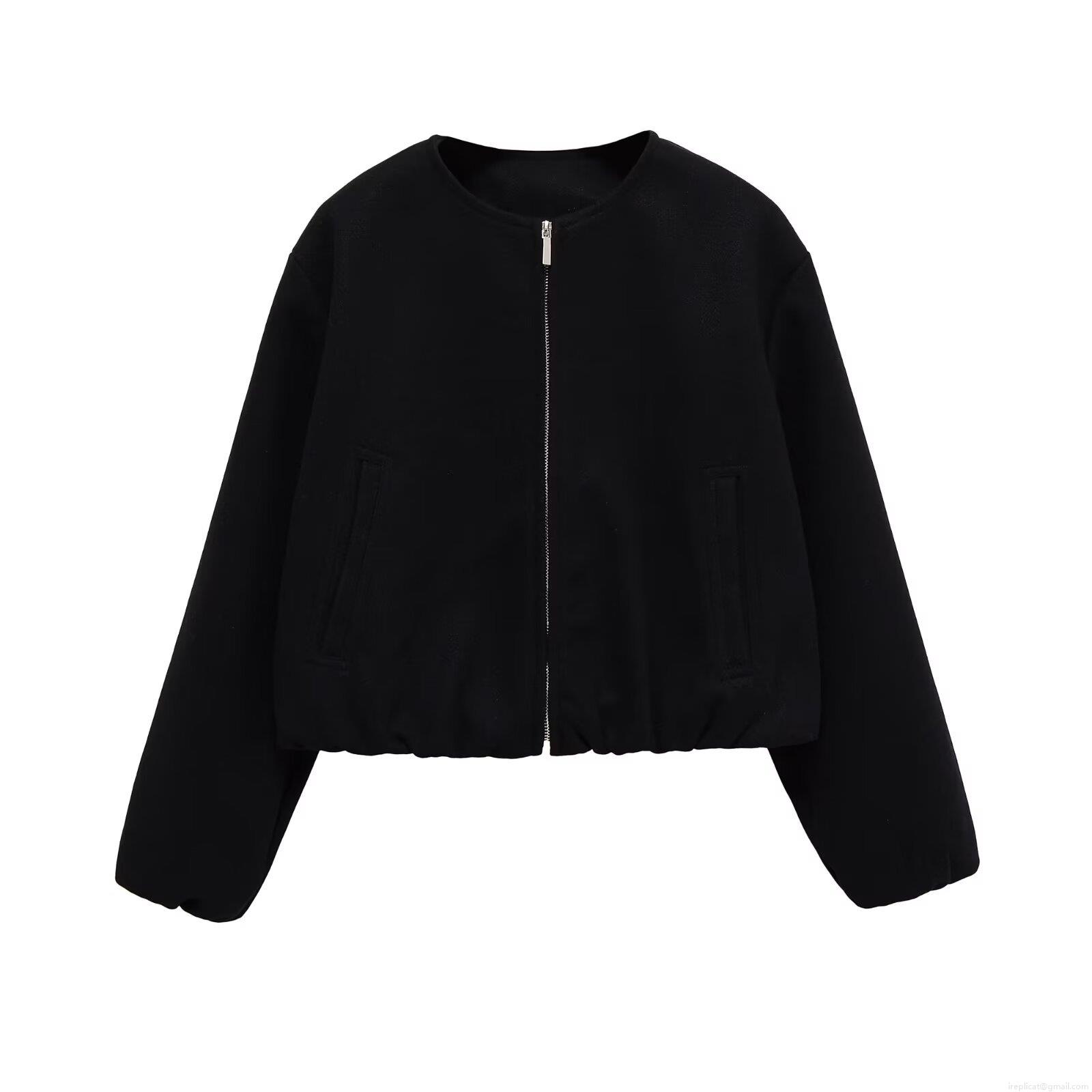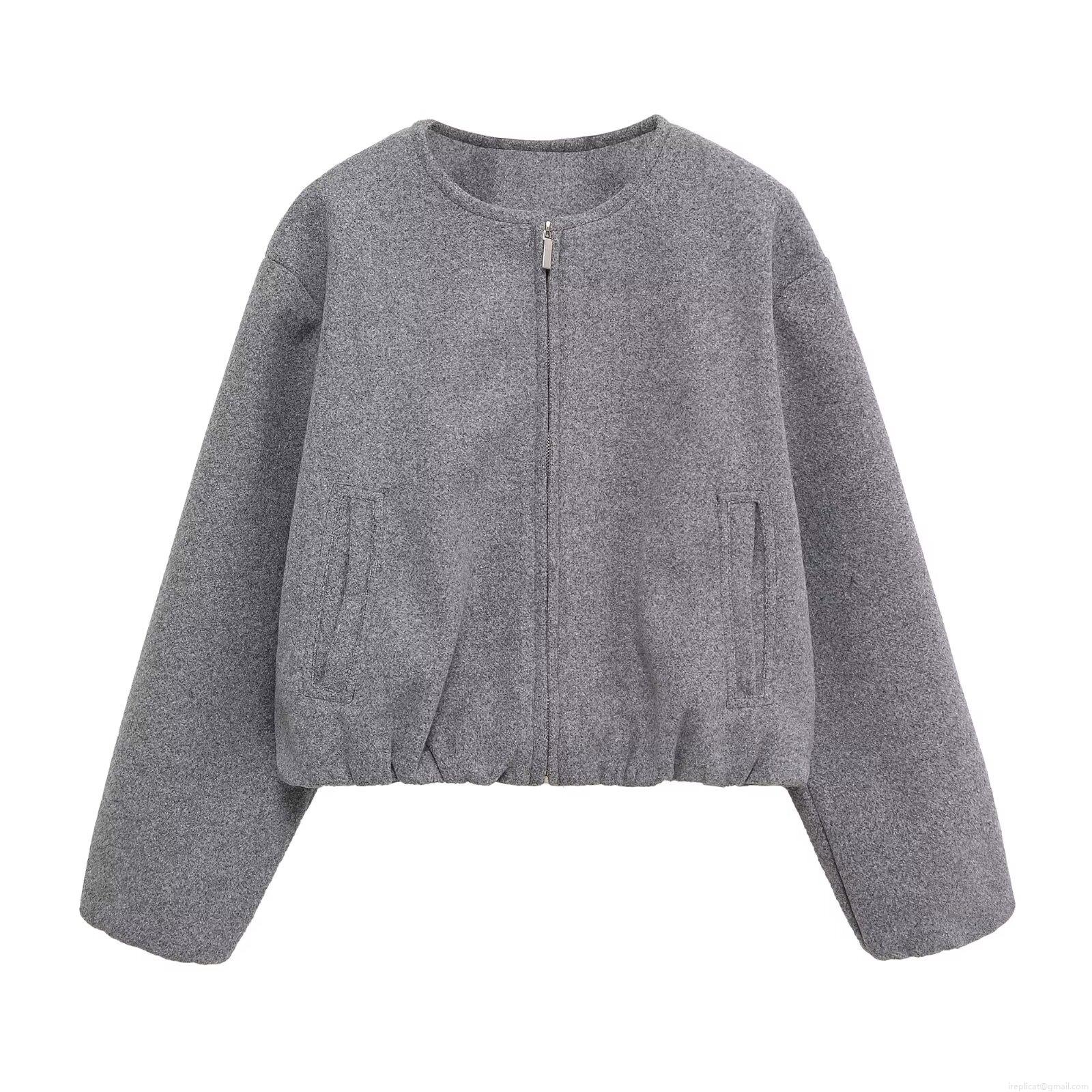 • Women's Loose Casual Zip Up Crop Jacket Crew Neck Solid Color Soft Tweed Baseball Uniform Long Sleeve Coat for Autumn Winter Streetwear
