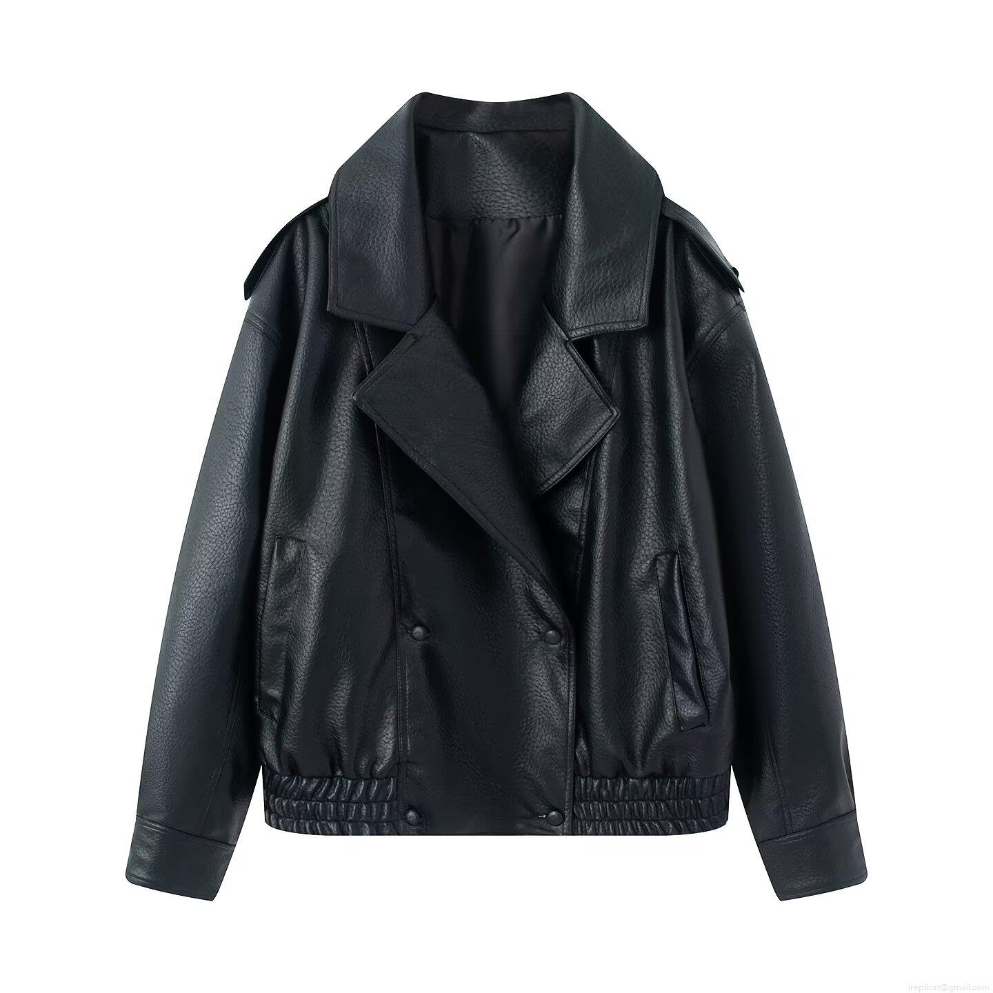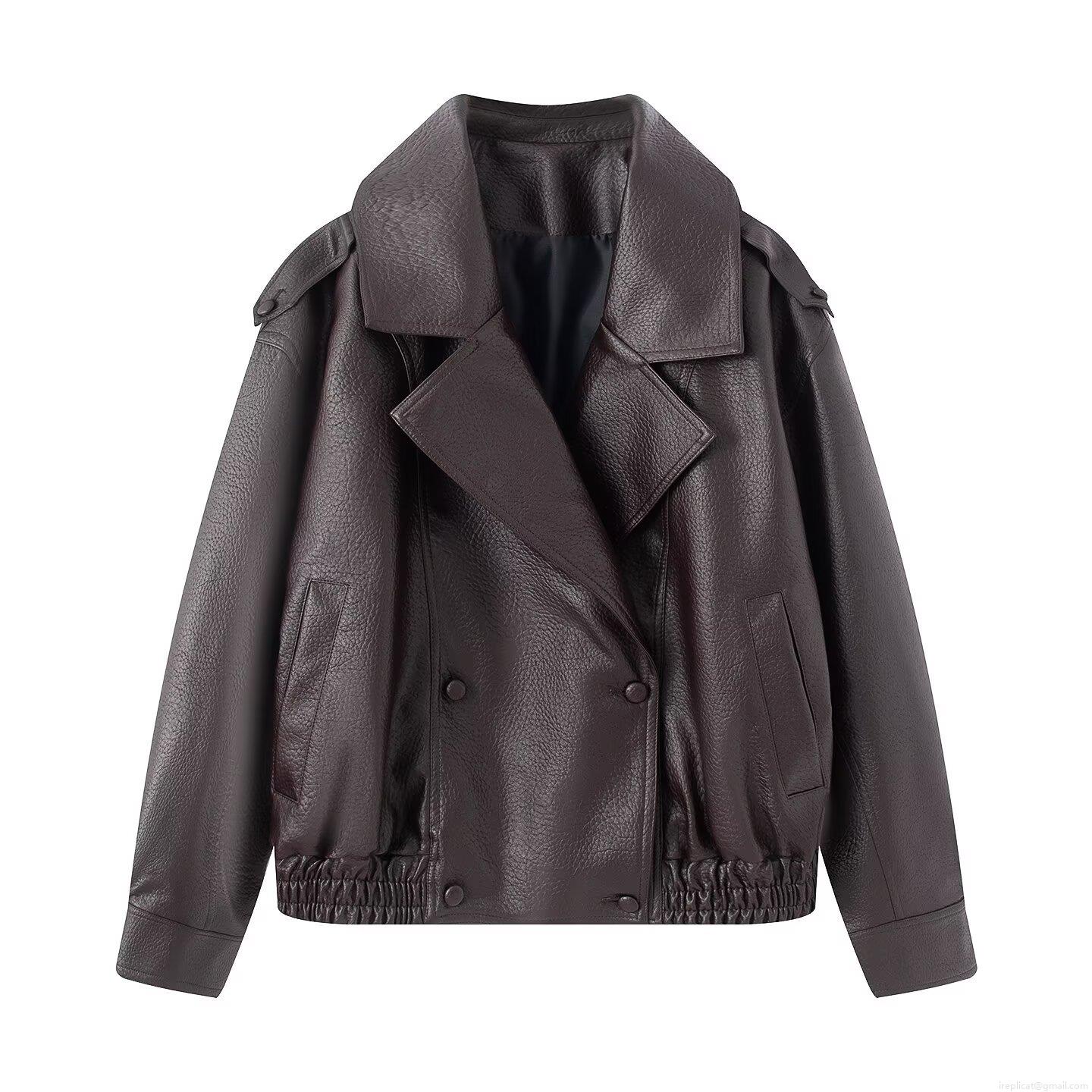Women's Loose Faux Leather Jacket Double Breasted Litchi Texture PU Moto Coat Casual Streetwear Windproof Outerwear For Ladies