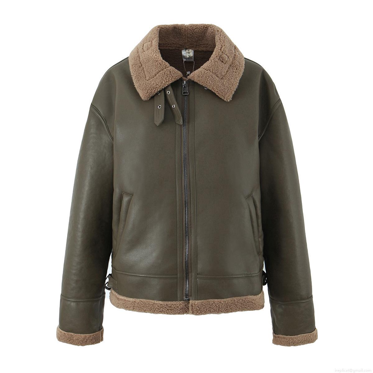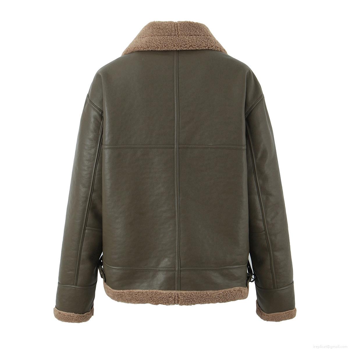Women's Loose Faux Leather Jacket With Brown Lamb Wool Trim Olive Green Long Sleeve Lapel Streetwear Outerwear Winter Warm Biker Coat For Ladies