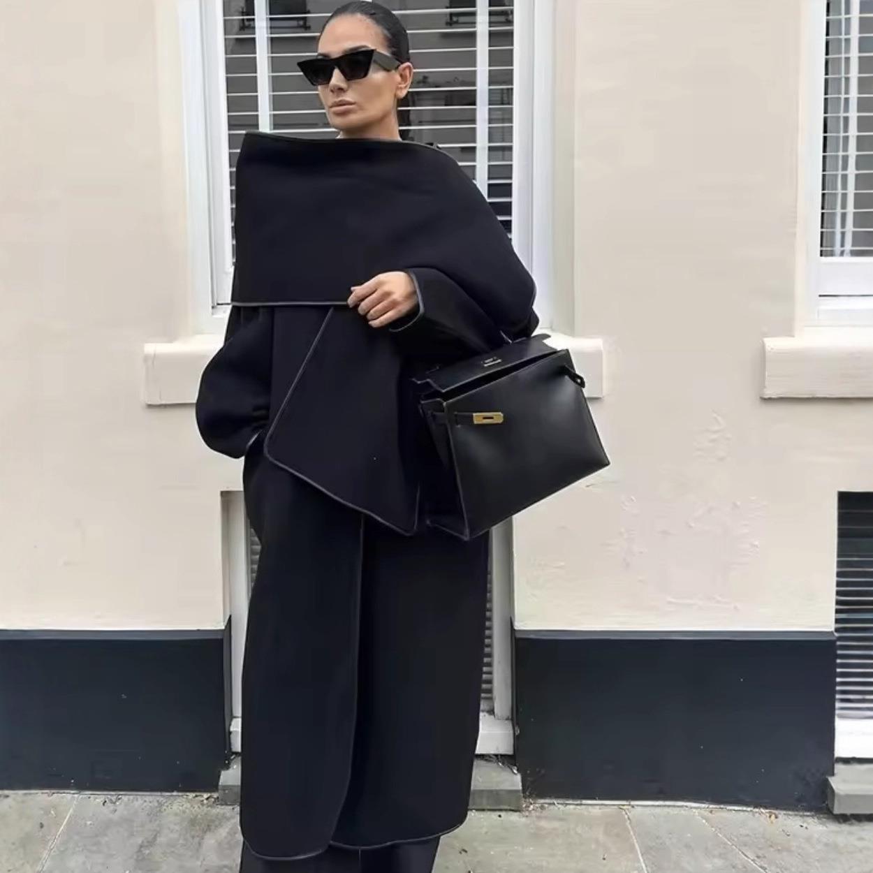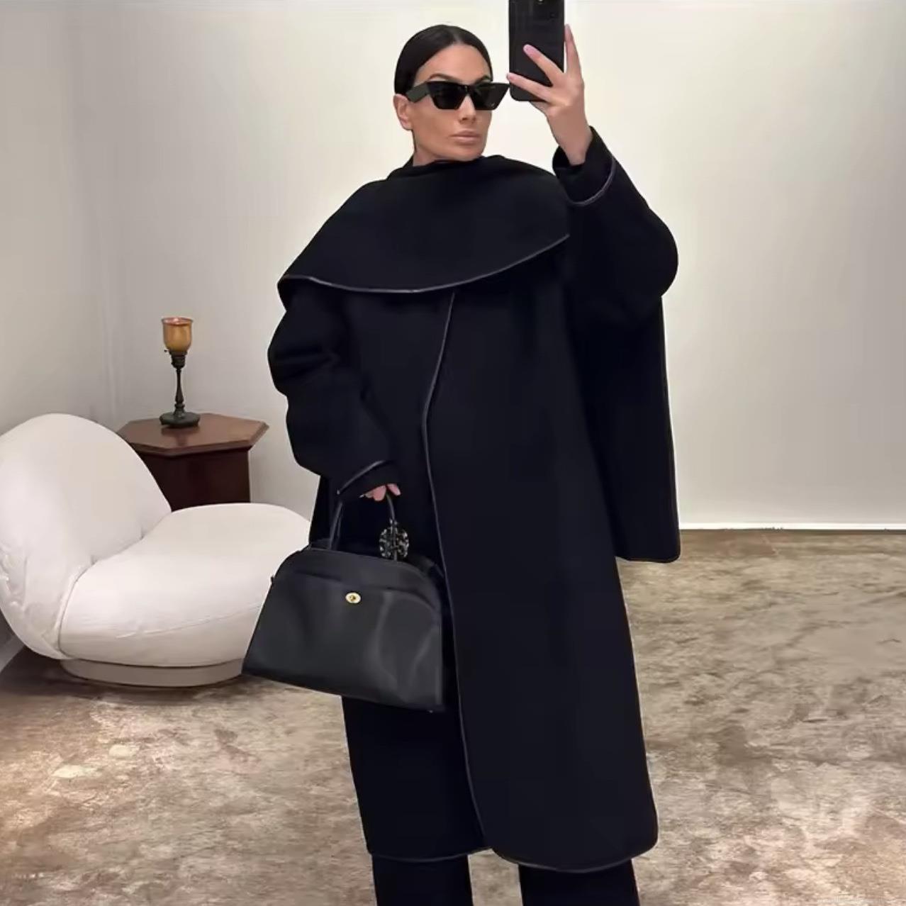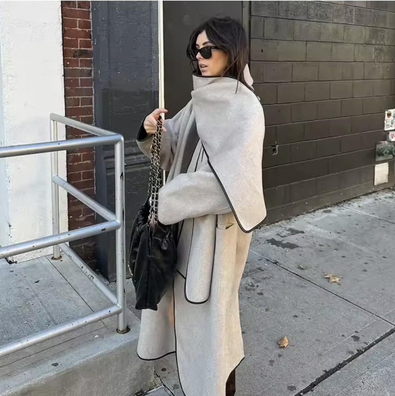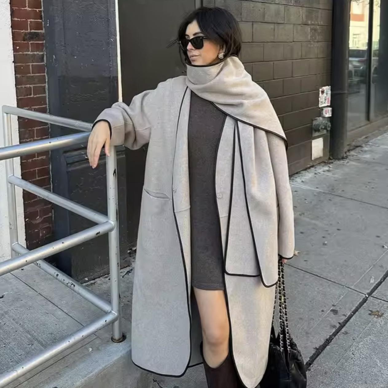 • Women's Loose Polyester Blend Woolen Coat With Matching Scarf Contrast Piping Long Sleeve Open Front Trench Coat Minimalist Autumn Winter Outerwear