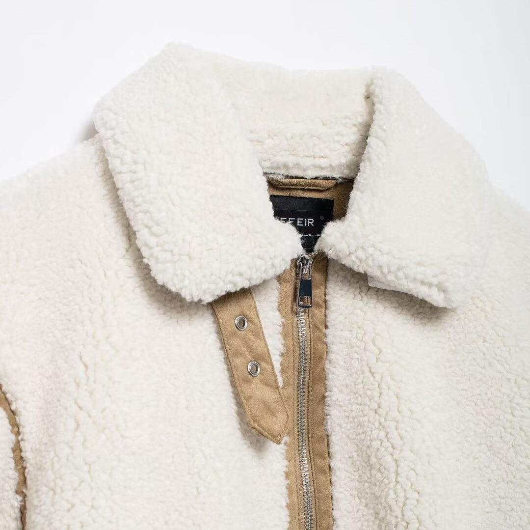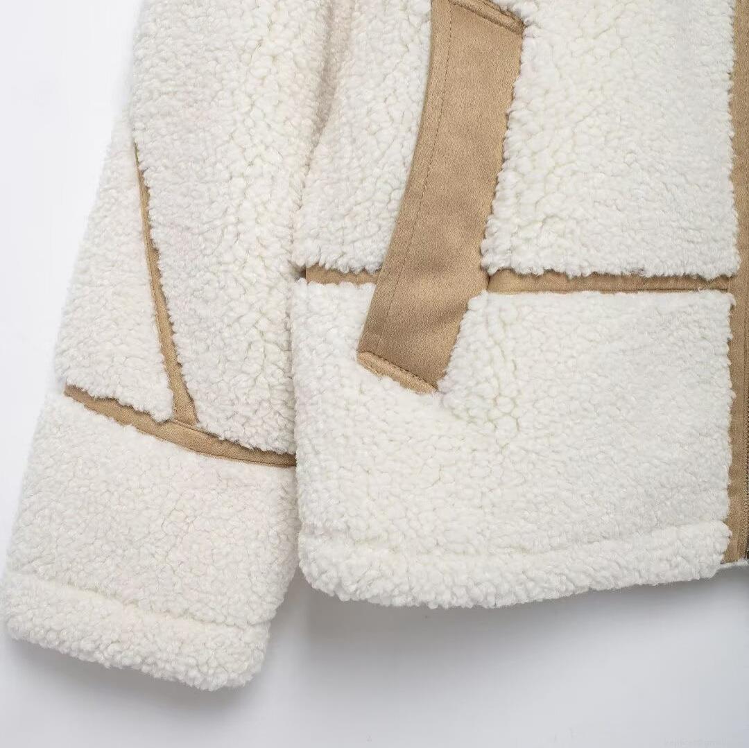 • Women's Loose Sherpa Fleece Jacket Contrast Color Block Zip Up Lapel Outerwear Casual Warm Long Sleeve Winter Autumn Coat