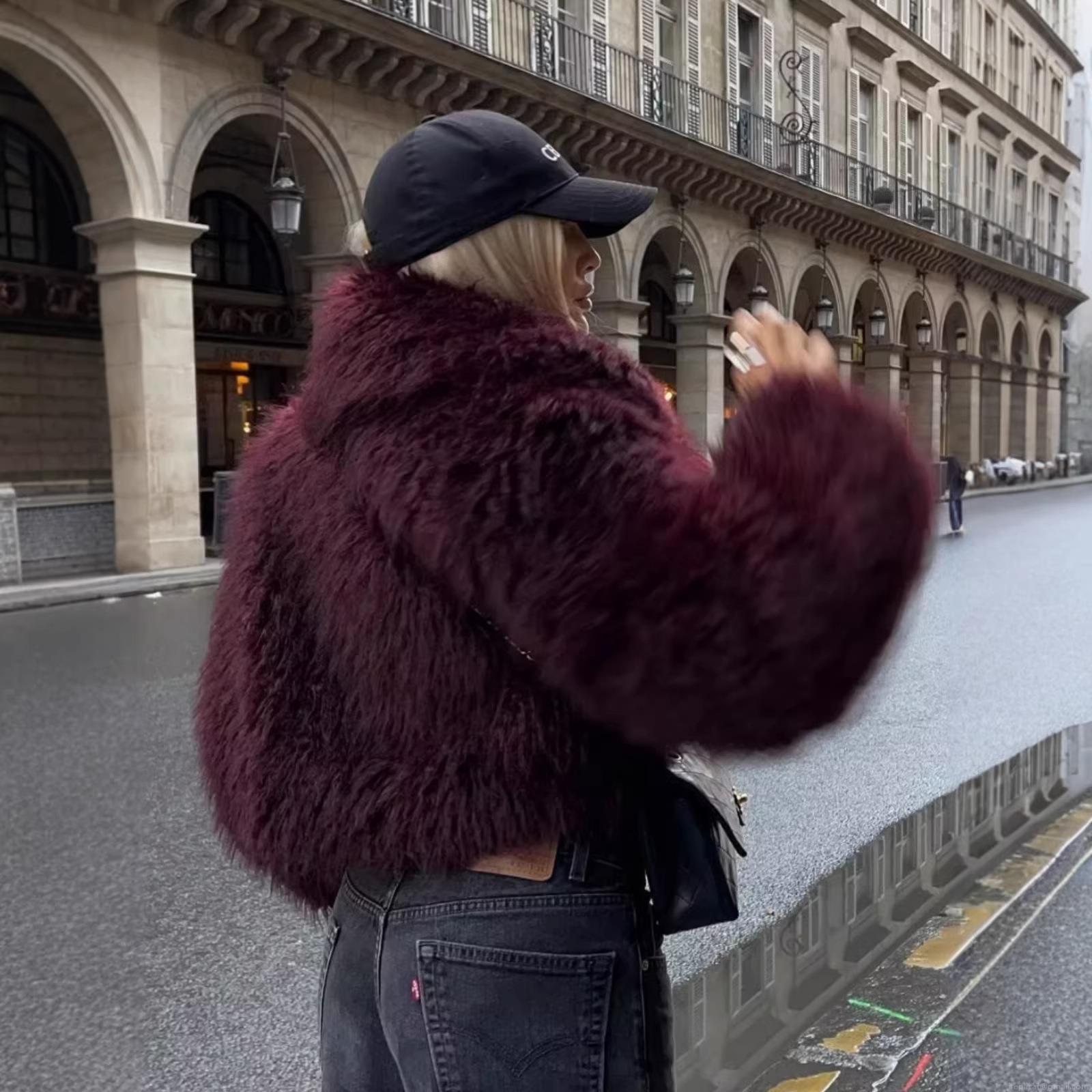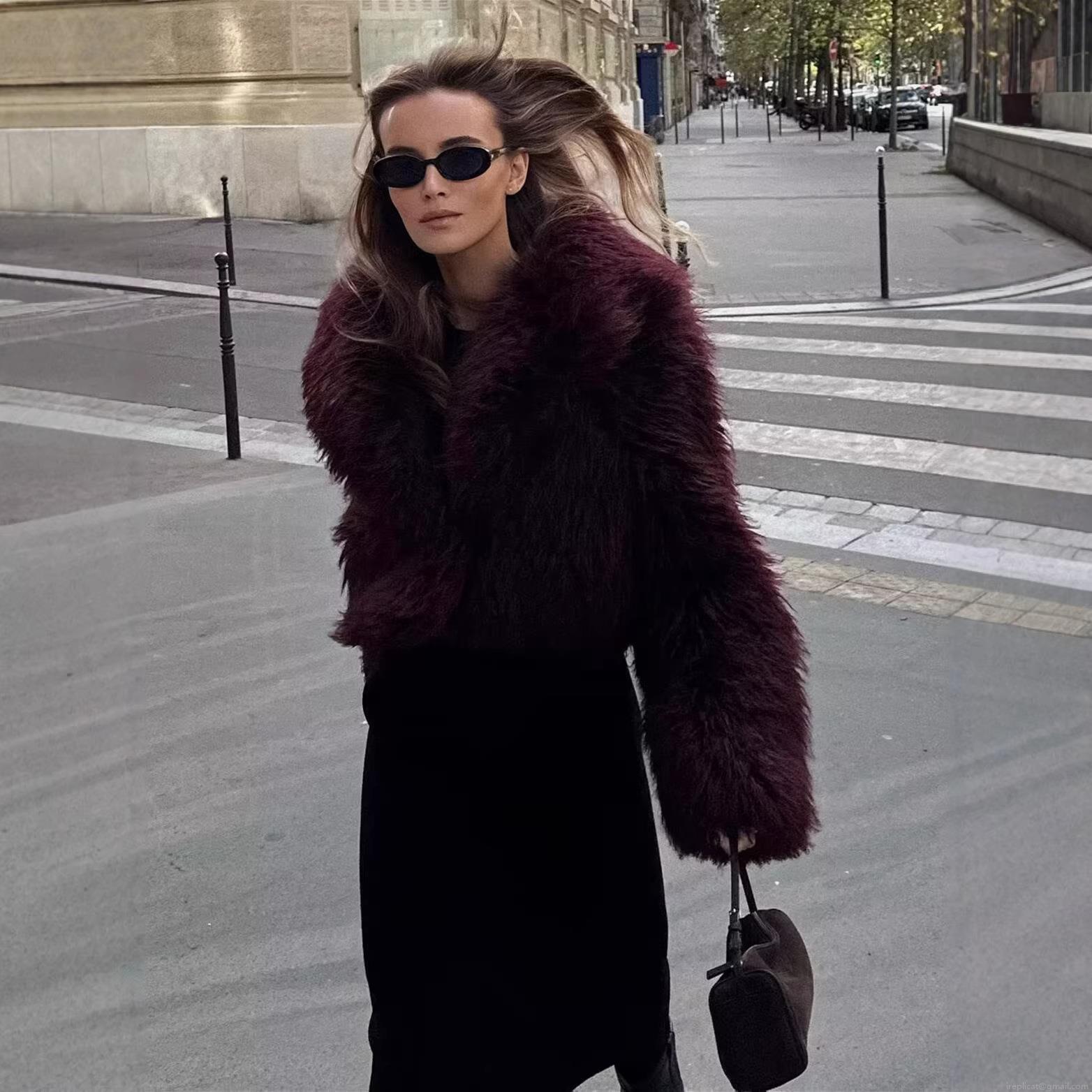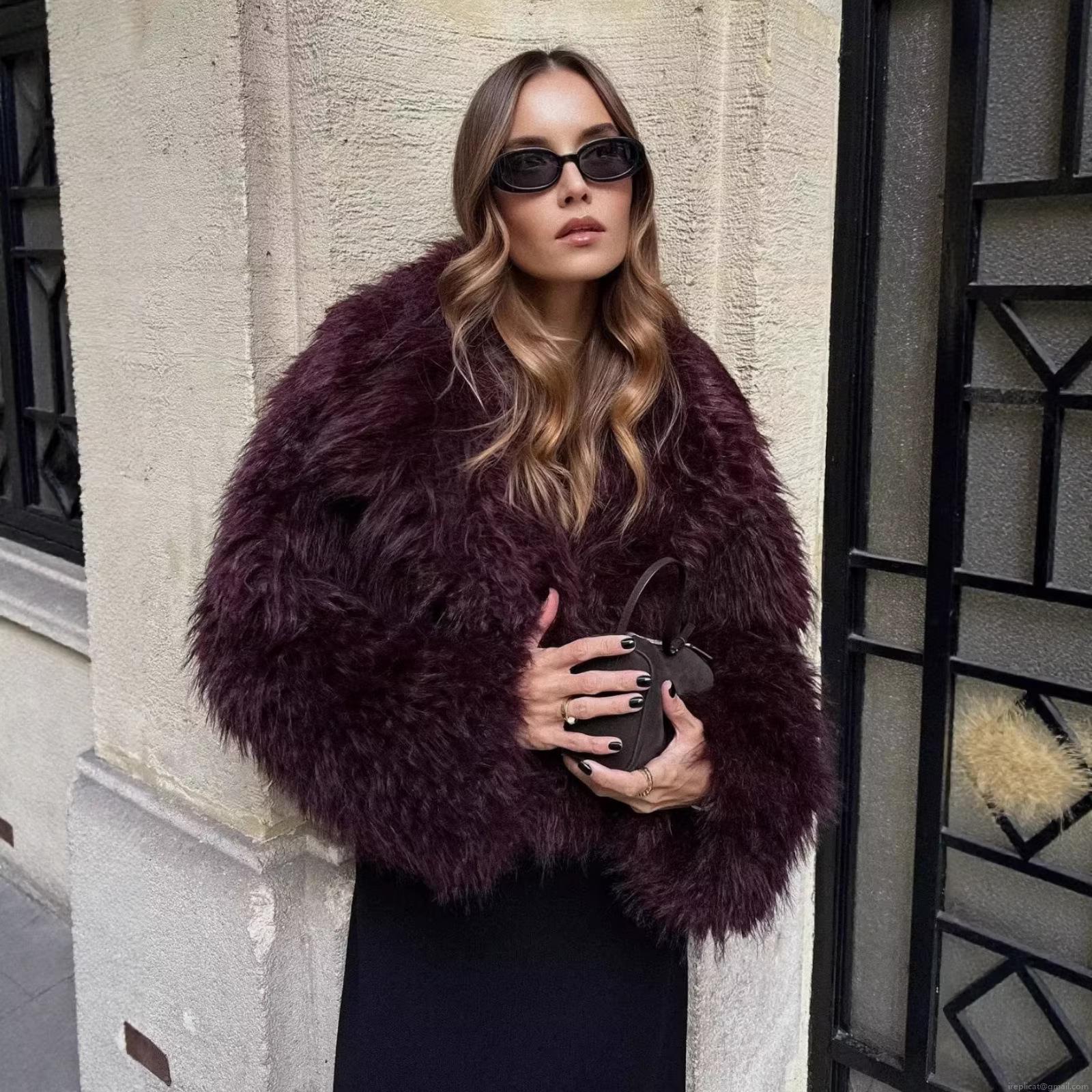 • Women's Luxury Faux Fur Coat Winter Warm Short Jacket 100% Polyester Shaggy Fluffy Solid Burgundy Lapel Overcoat Long Sleeve Streetwear Outerwear For Women