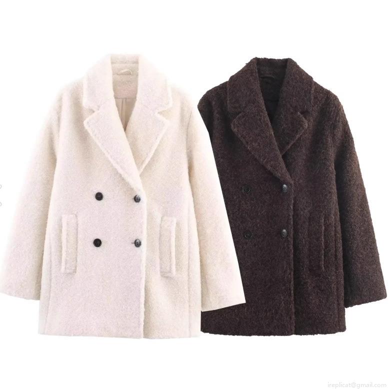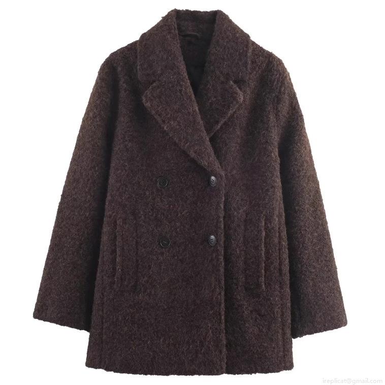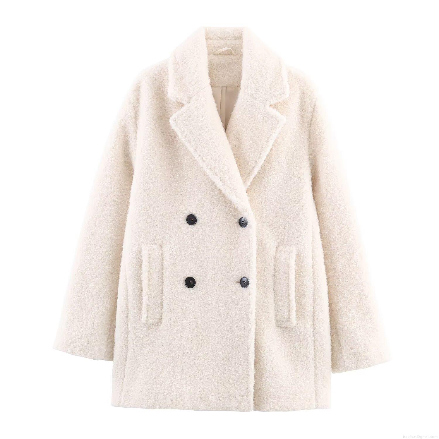 • Women's Midi Overcoat Double Breasted Textured Woolen Polyester Warm Outerwear Coat For Winter Daily Office Casual Elegant Lady Solid Color