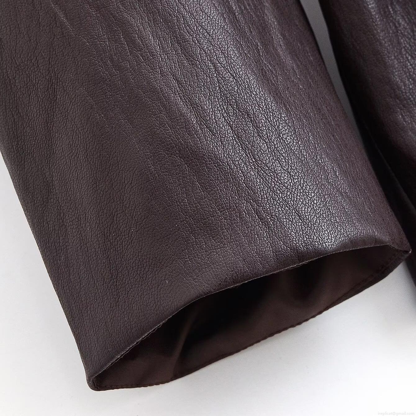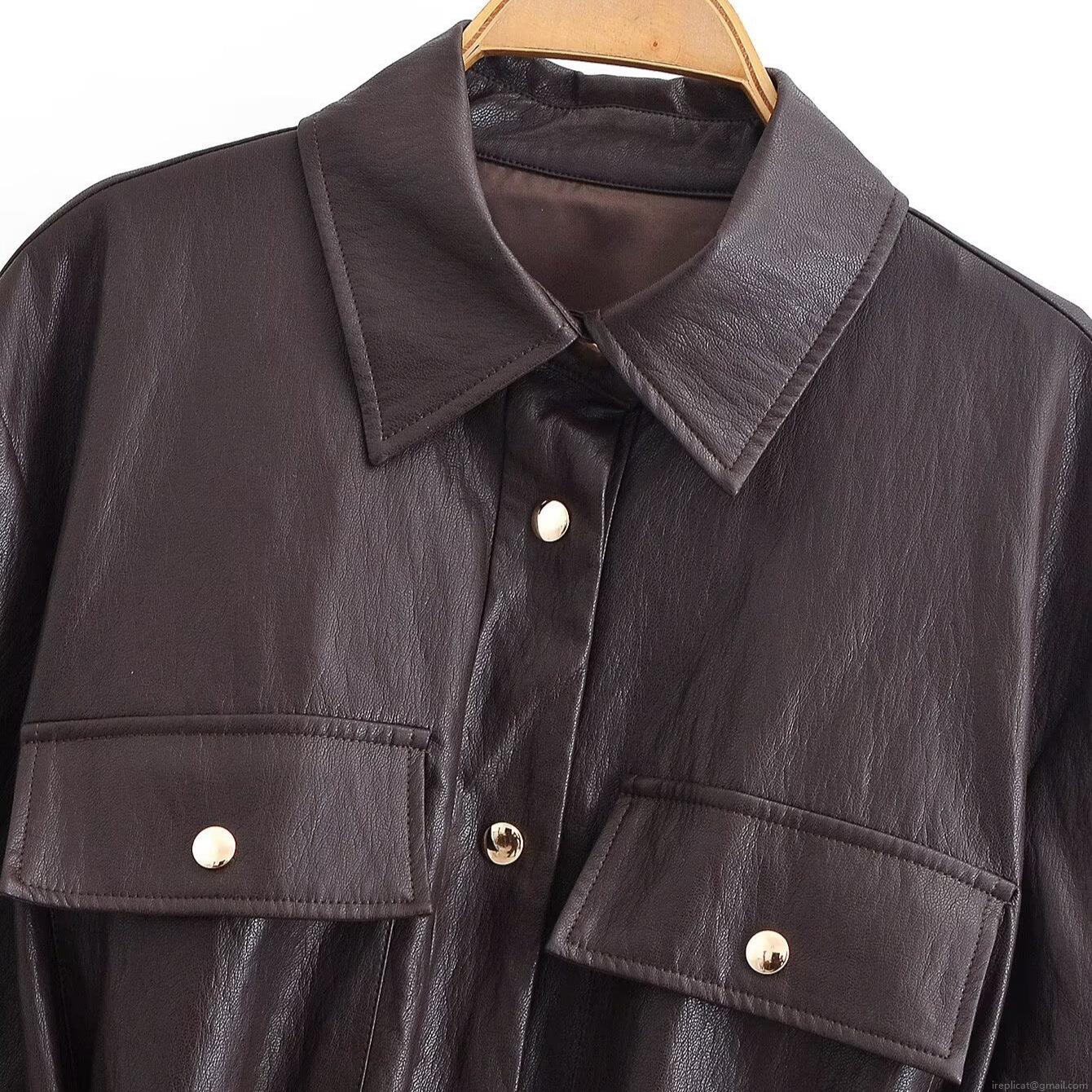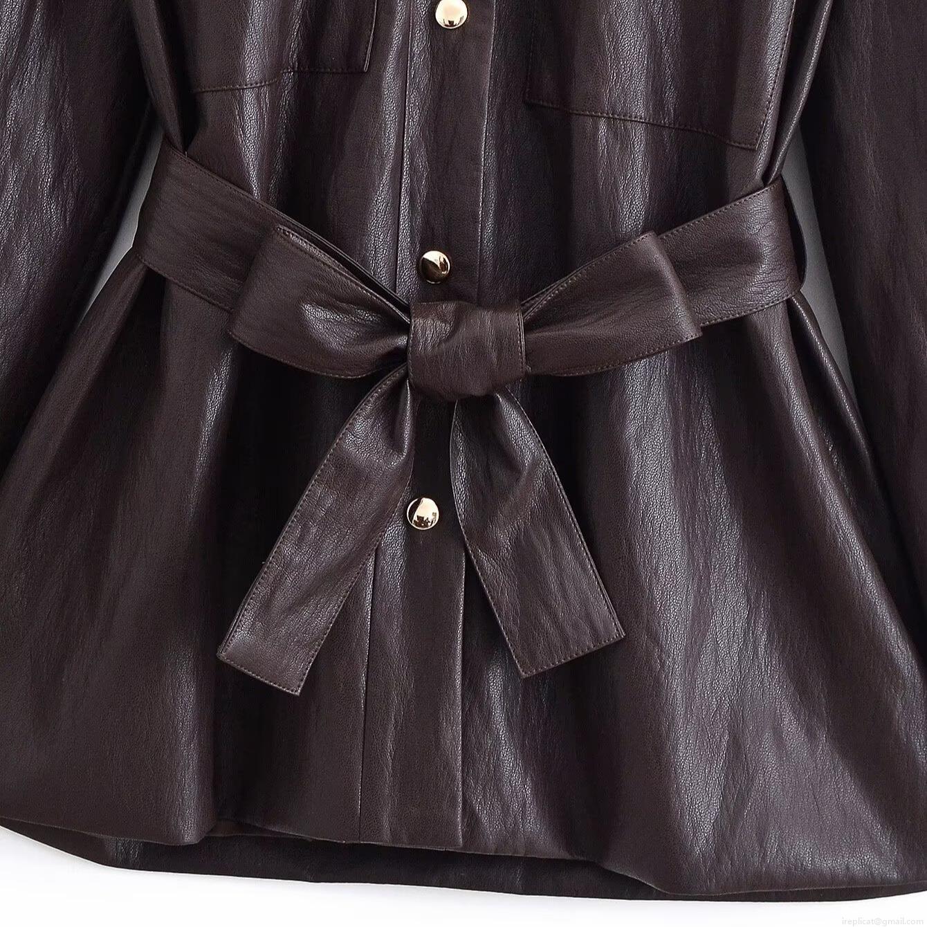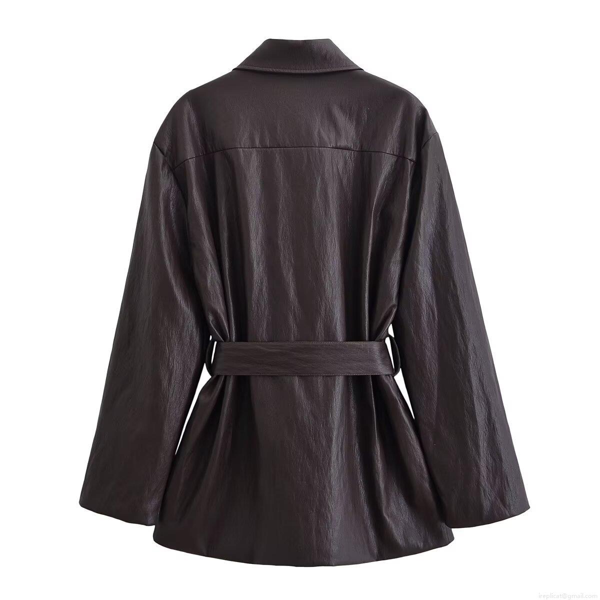 • Women's Mid-Length Faux Leather Jacket With Belt Solid Coffee Color Polyurethane Coated Lapel Button Up Coat Casual Office Streetwear Outerwear For Women
