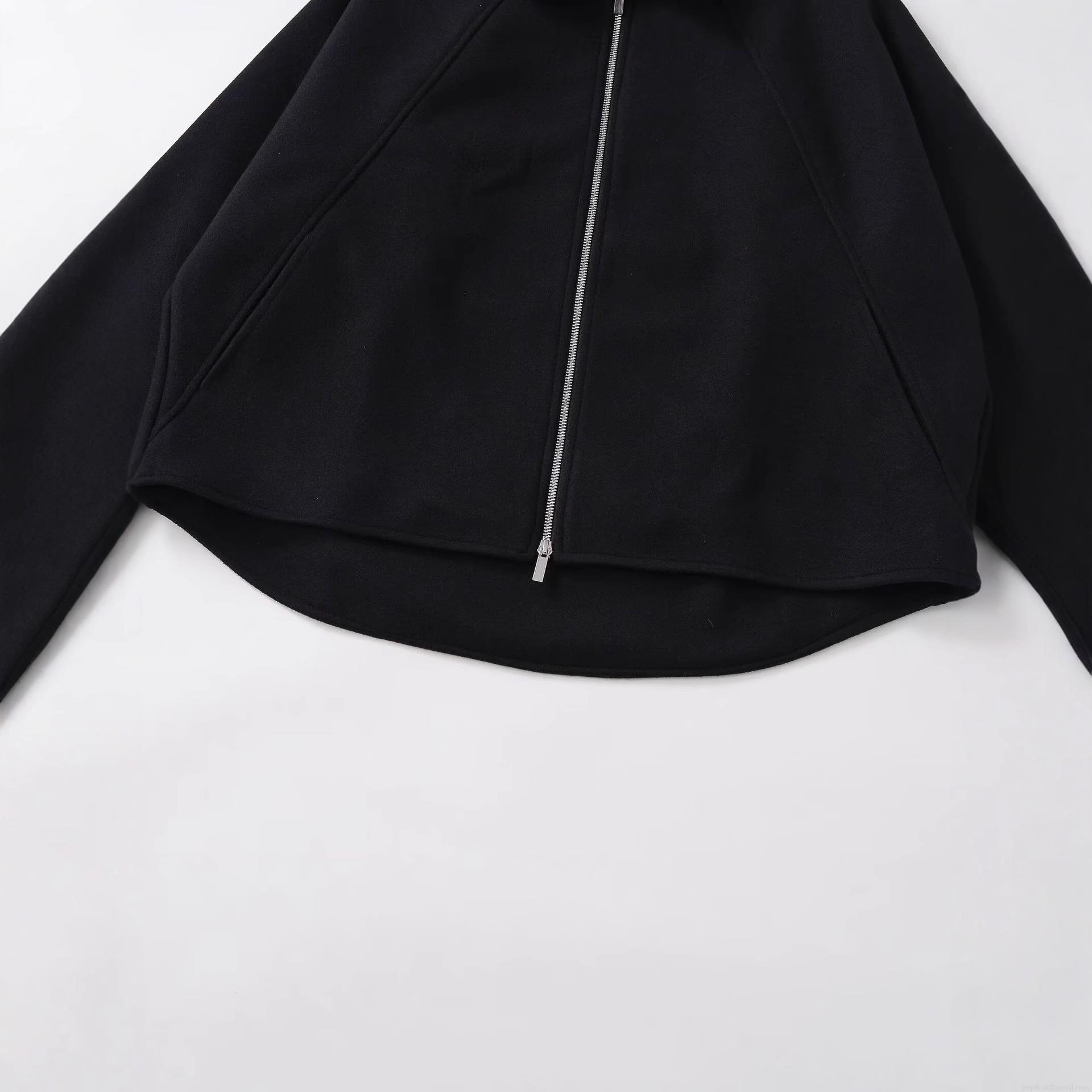 Women's Modern Minimalist Black Zip Up Lapel Jacket 100% Polyester Woolen Texture Long Sleeve Oversized Casual Short Coat Streetwear Winter Outerwear