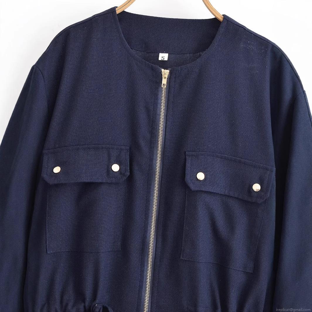 Women's Navy Blue Polyester Safari Jacket Casual Drawstring Waist Coat With Gold Buttons Round Neck Long Sleeve Lightweight Outerwear For Ladies