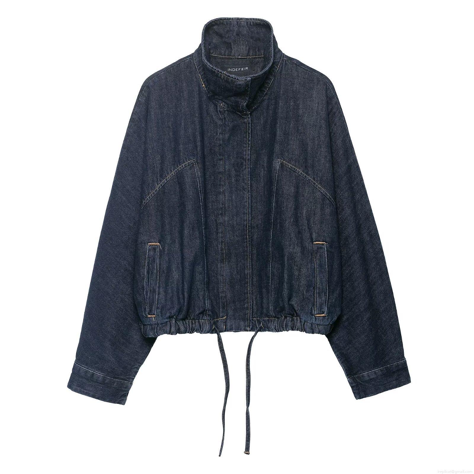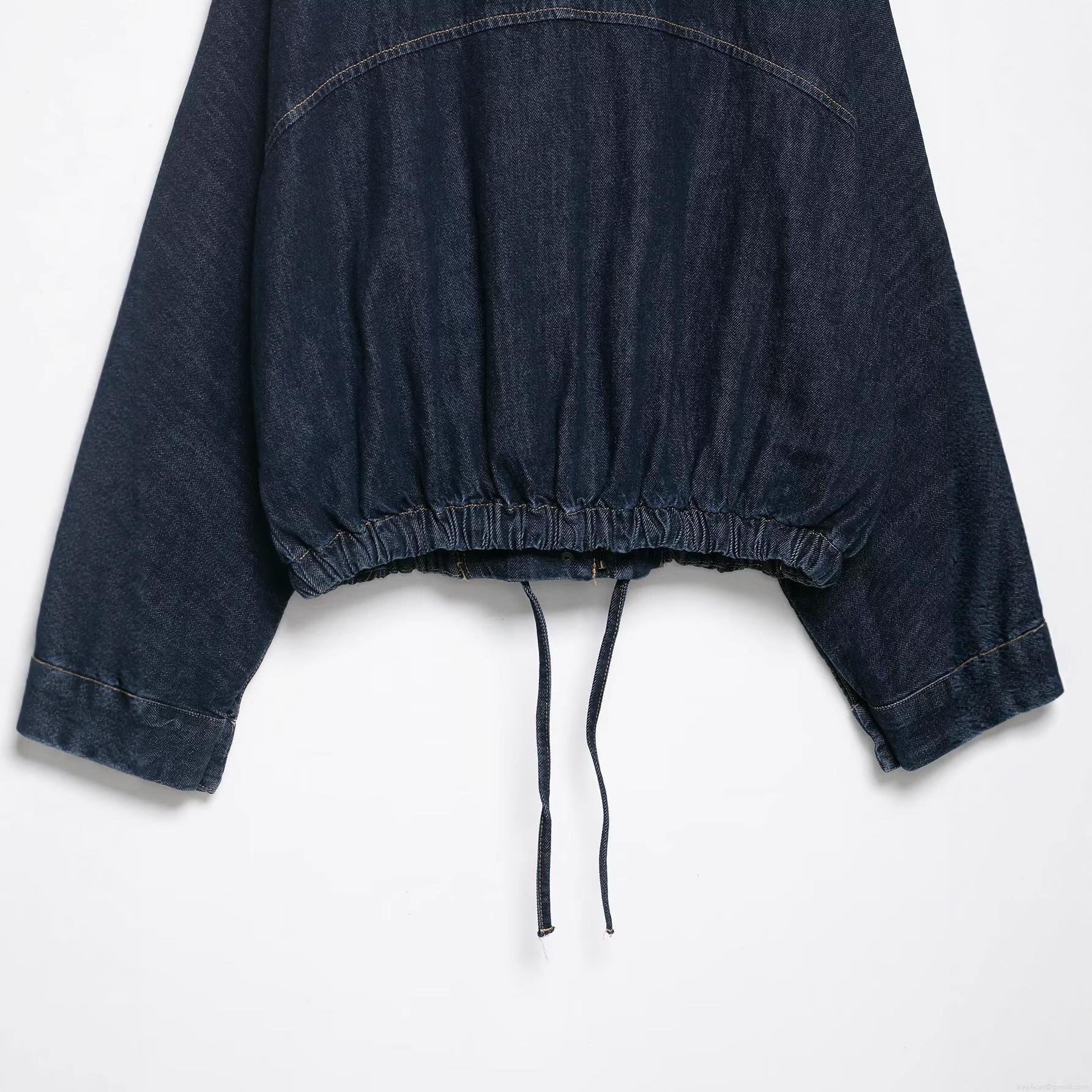 • Women's Oversized Denim Jacket Dark Blue Heavy Cotton Blend Cropped Coat Drawstring Hem Streetwear Casual Long Sleeve Zipper Outerwear