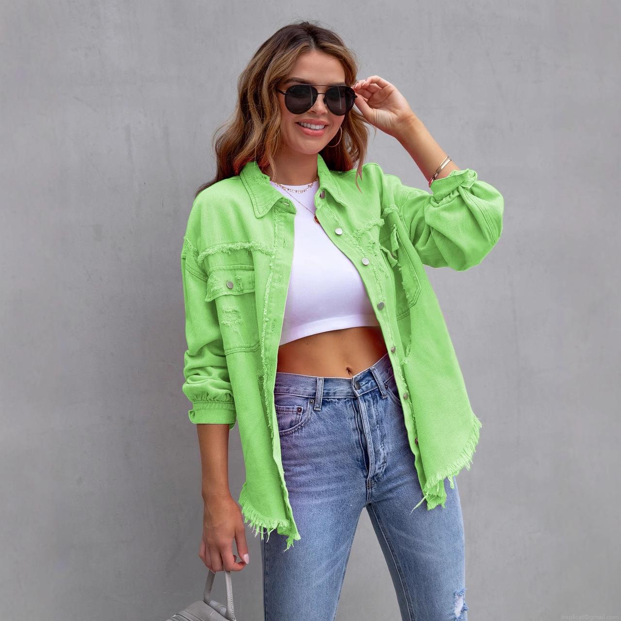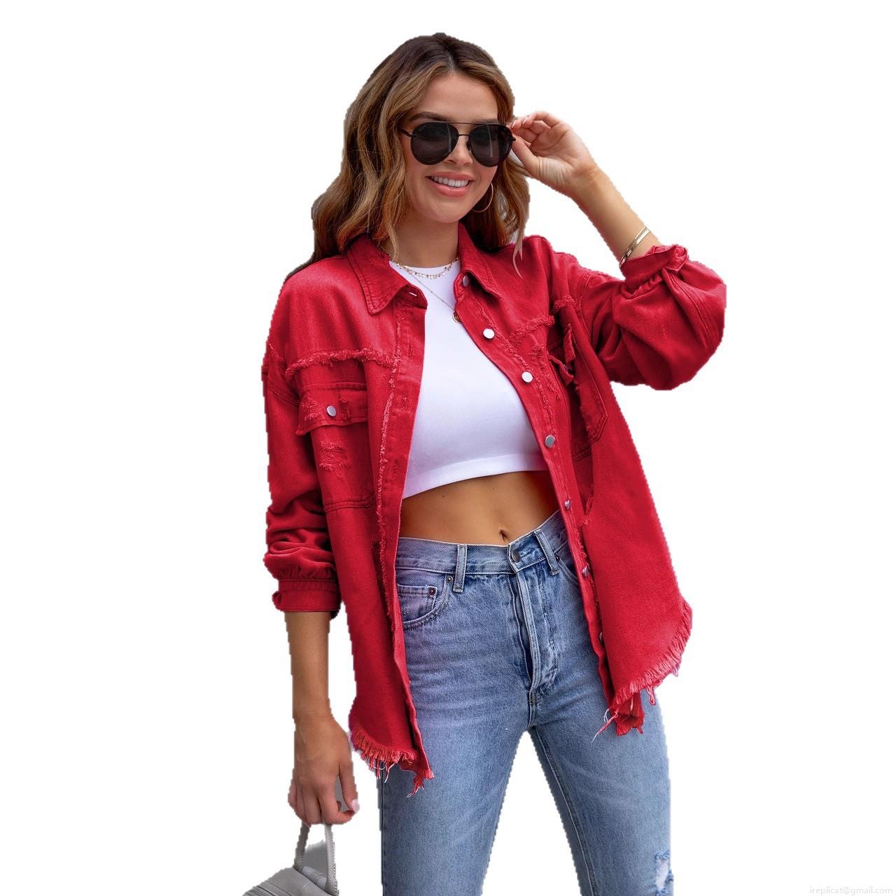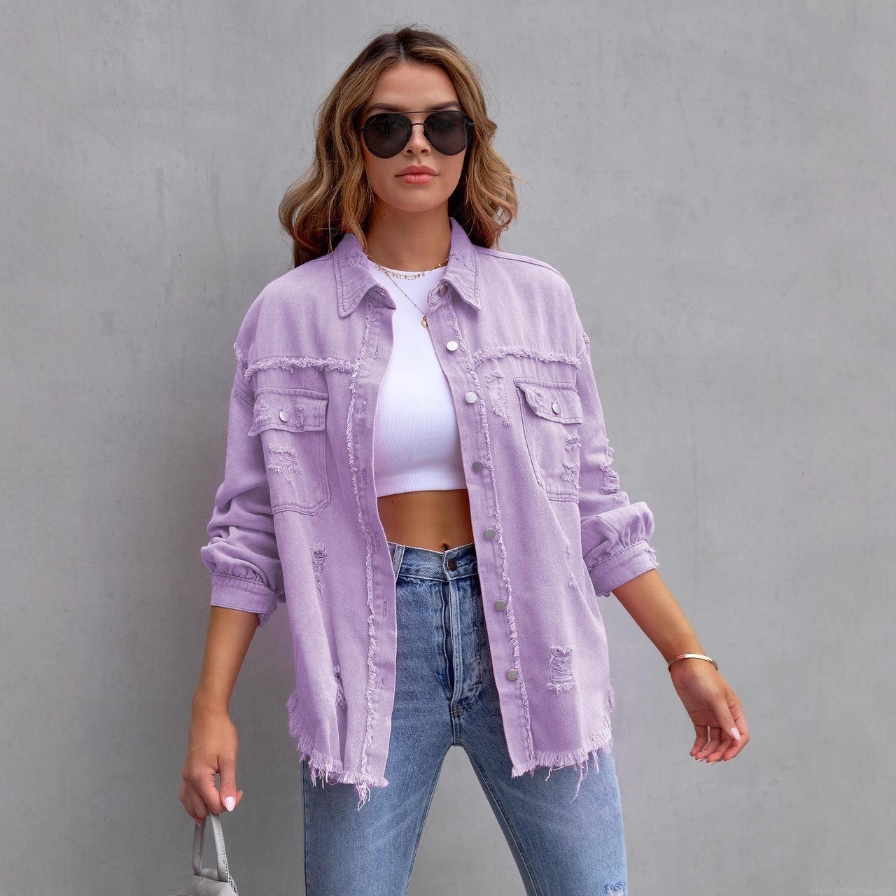 • Women's Oversized Distressed Denim Jacket Distressed Frayed Hem Ripped Jeans Coat Long Sleeve Button Down Denim Outwear Streetwear Tops for Autumn Winter