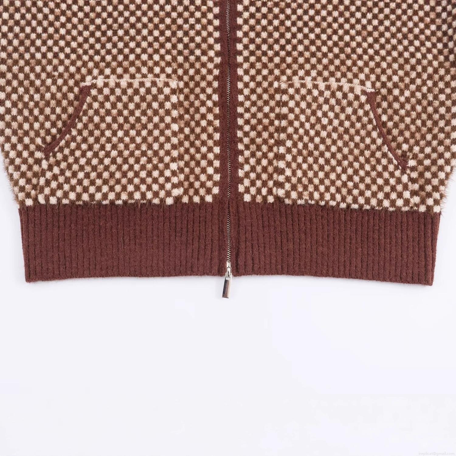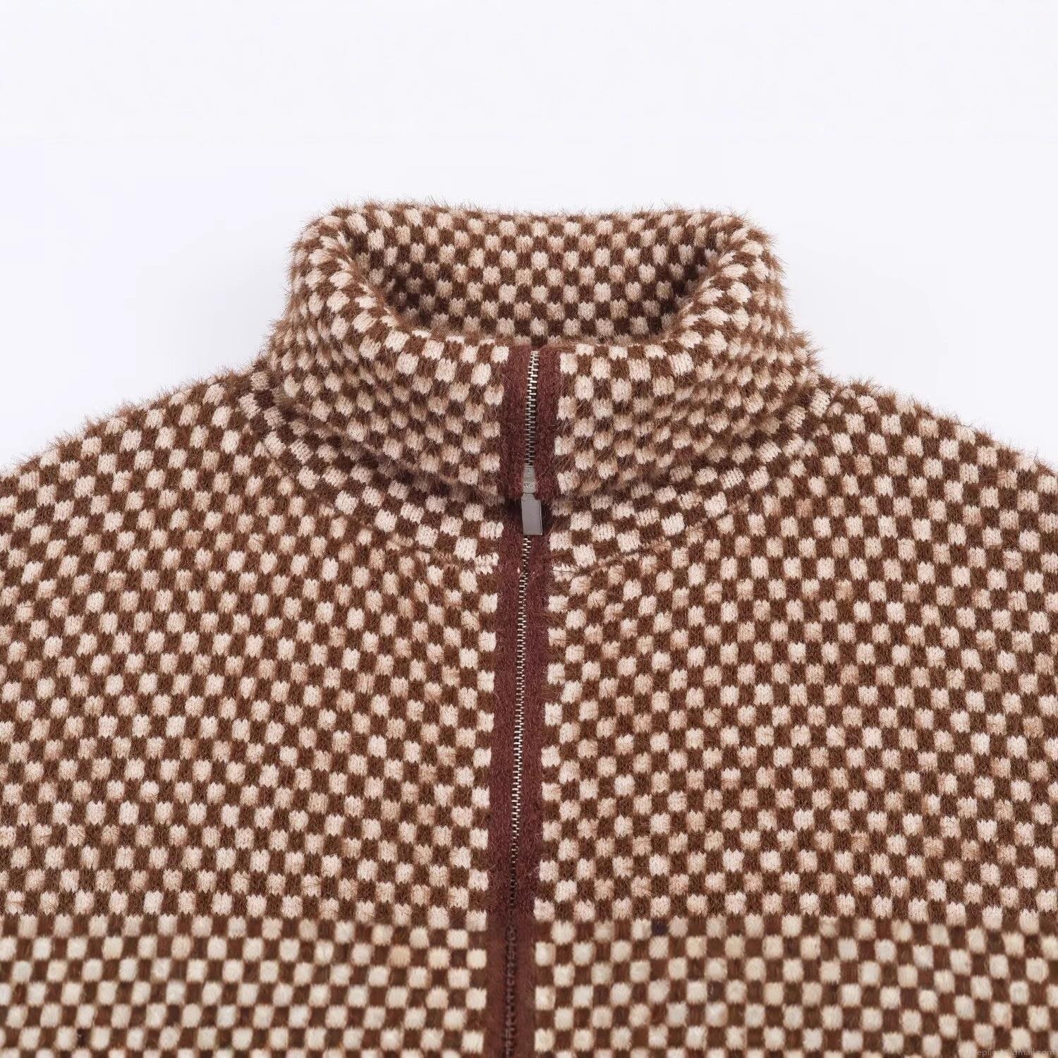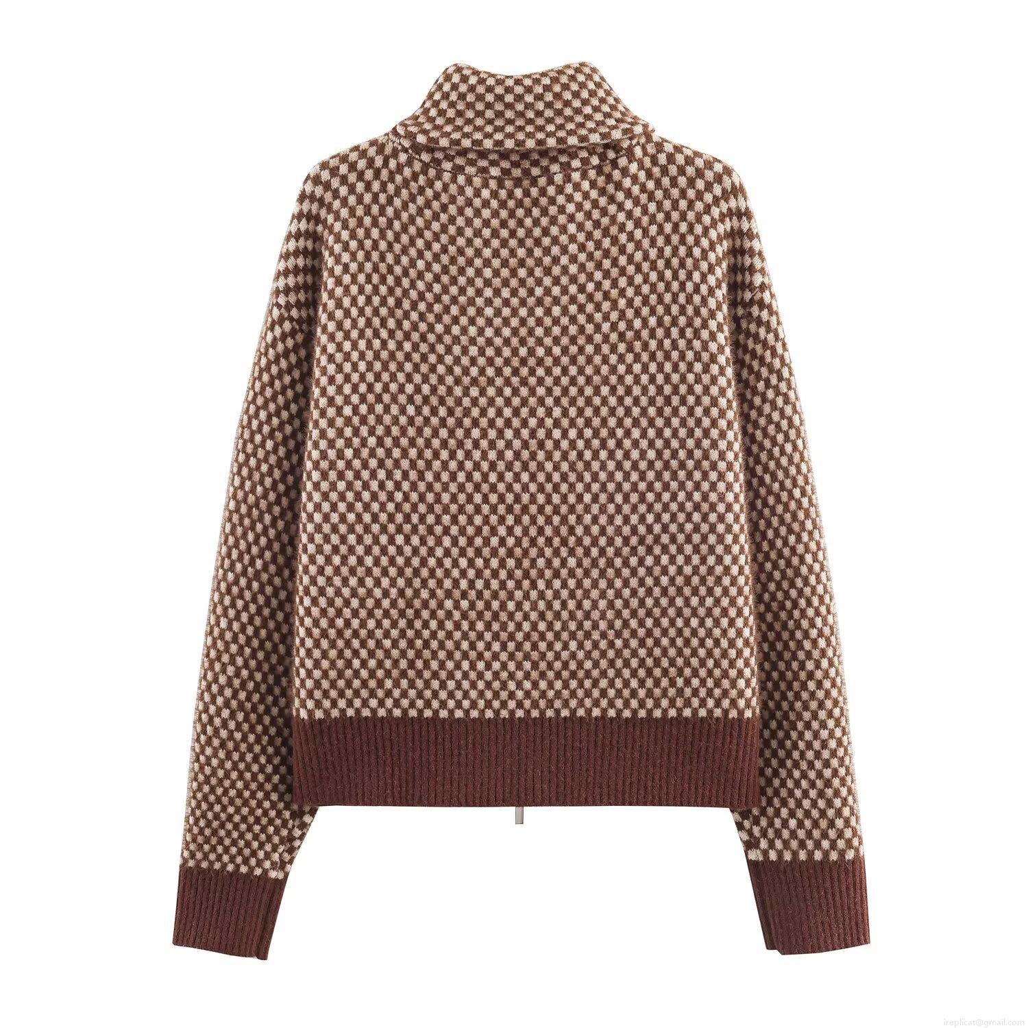 Women's Oversized Knit Bomber Jacket Acrylic Polyester Blend Full Zipper Stand Collar Checkerboard Plaid Pockets Casual Streetwear Autumn Winter Outerwear