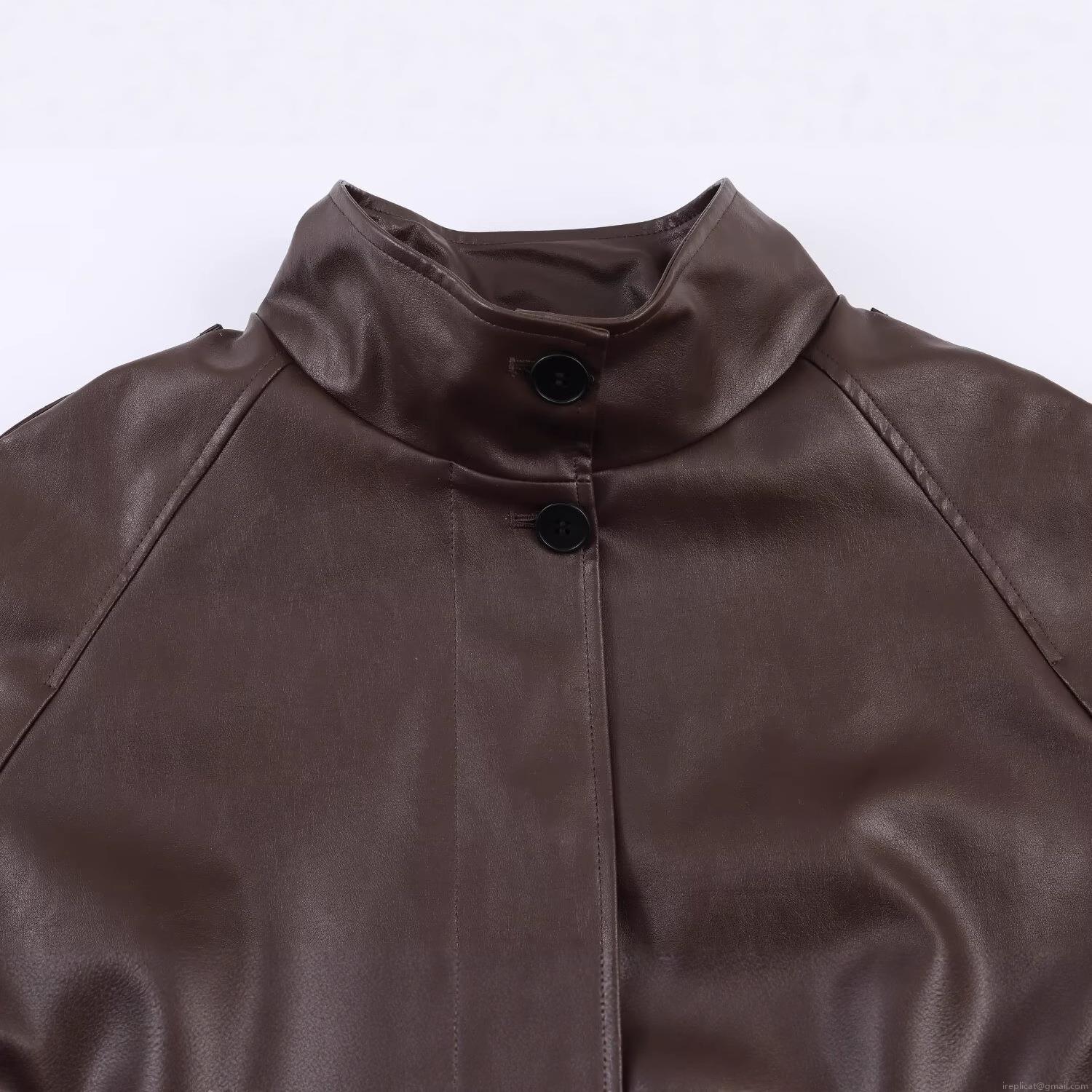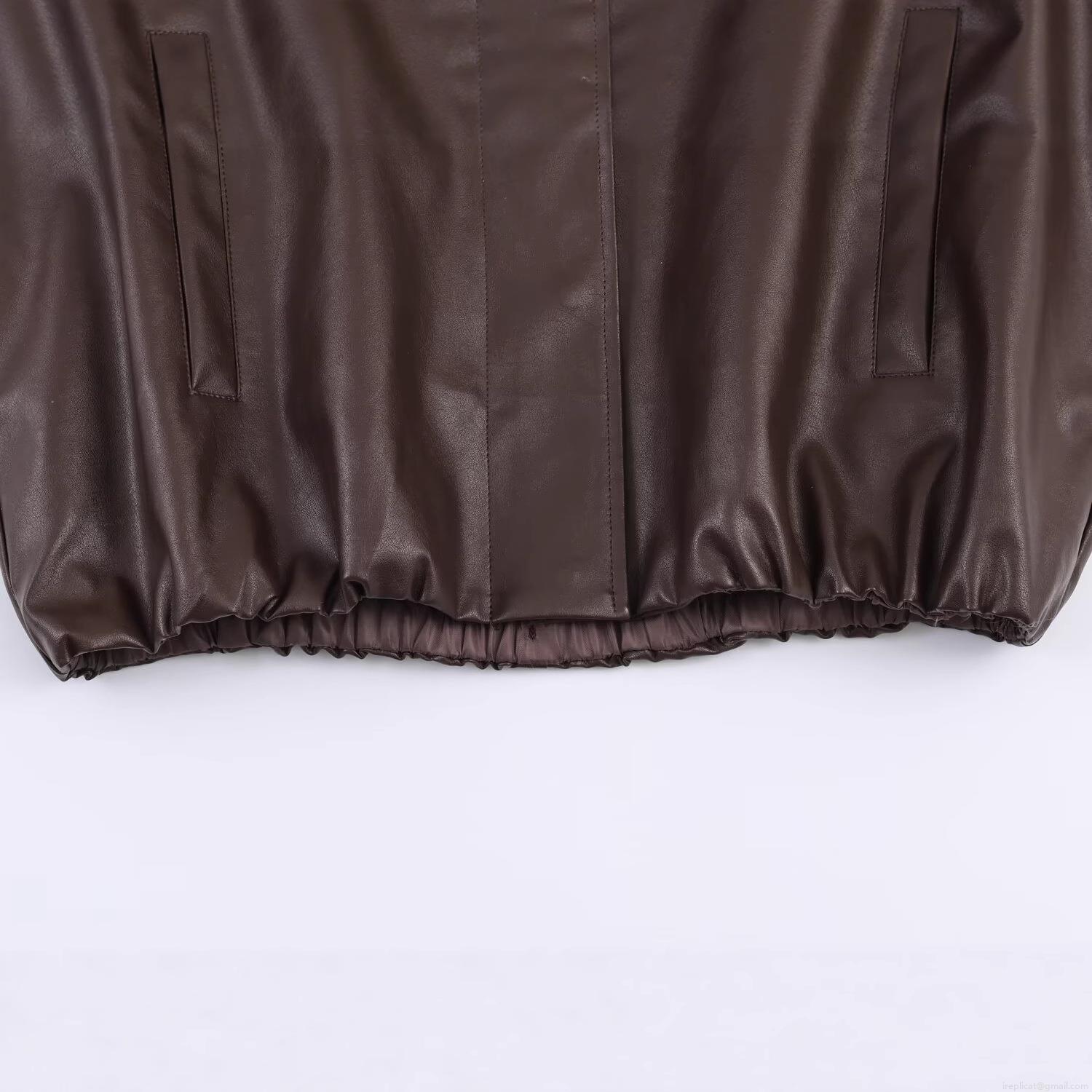 • Women's Oversized PU Leather Jacket Stand Collar Long Sleeve Elastic Hem Casual Coffee Brown Streetwear Loose Coat For Fall Winter