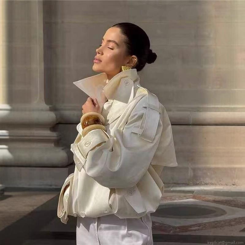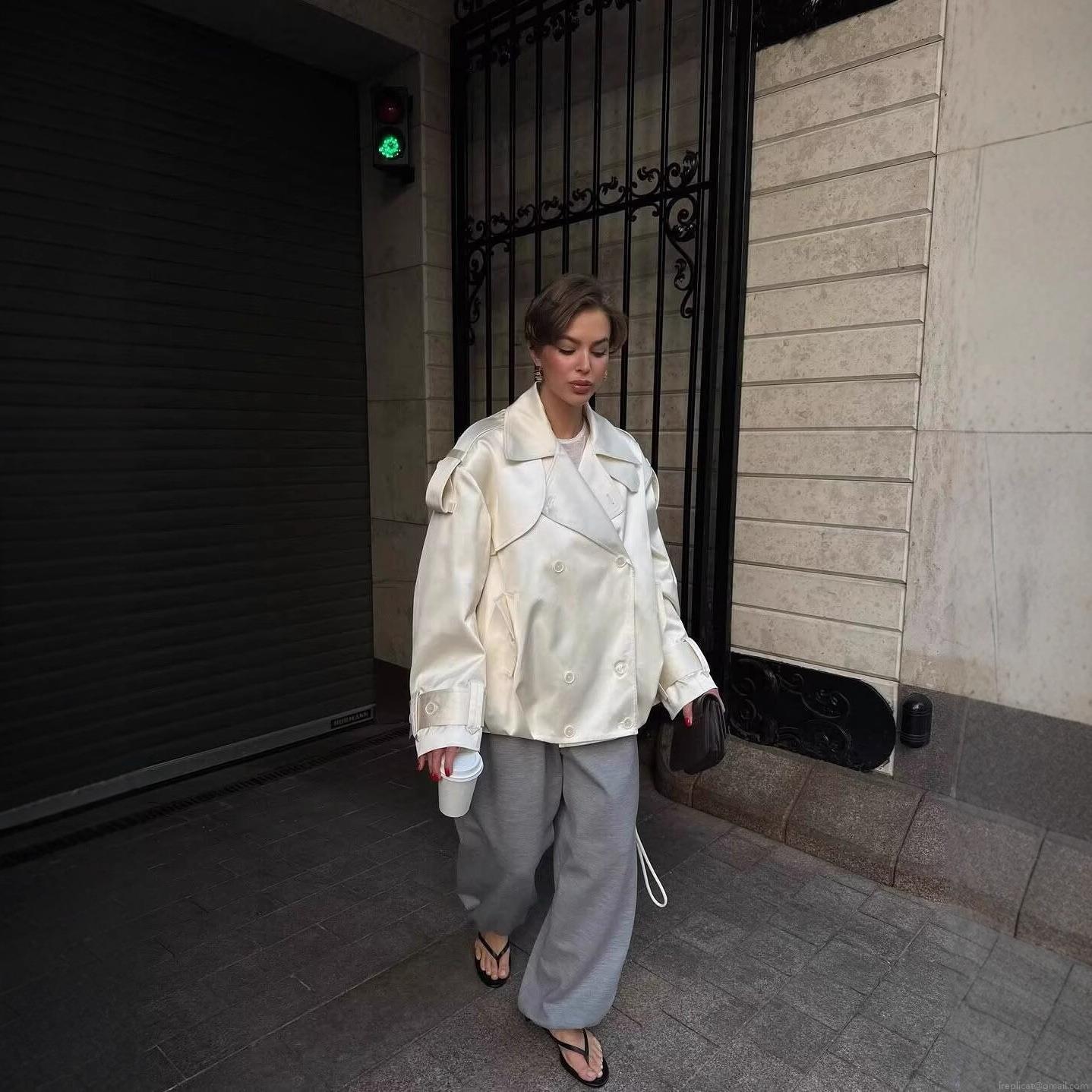 • Women's Oversized Short Utility Jacket Windbreaker With Satin Luster Double Breasted Drawstring Hem Epaulets Streetwear Lapel Outerwear Coat