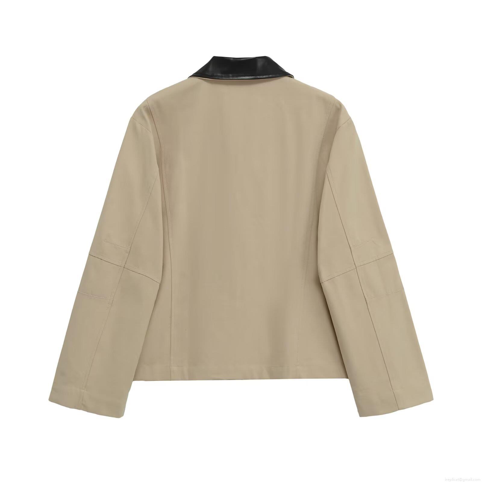 Women's Patchwork Jacket With PU Leather Lapel Collar Polyester Long Sleeve Loose Casual Zipper Outwear Streetwear Spring Autumn Clothes