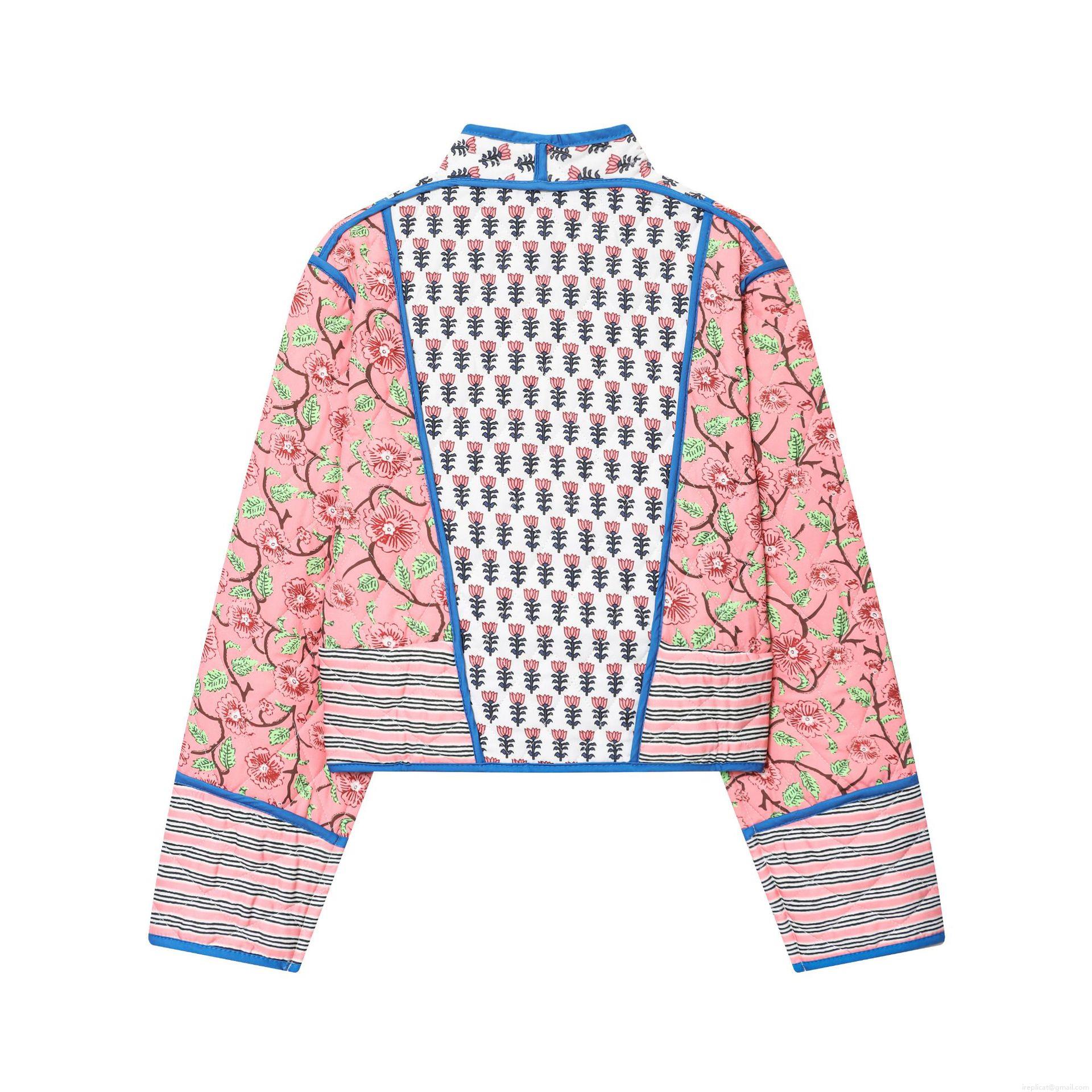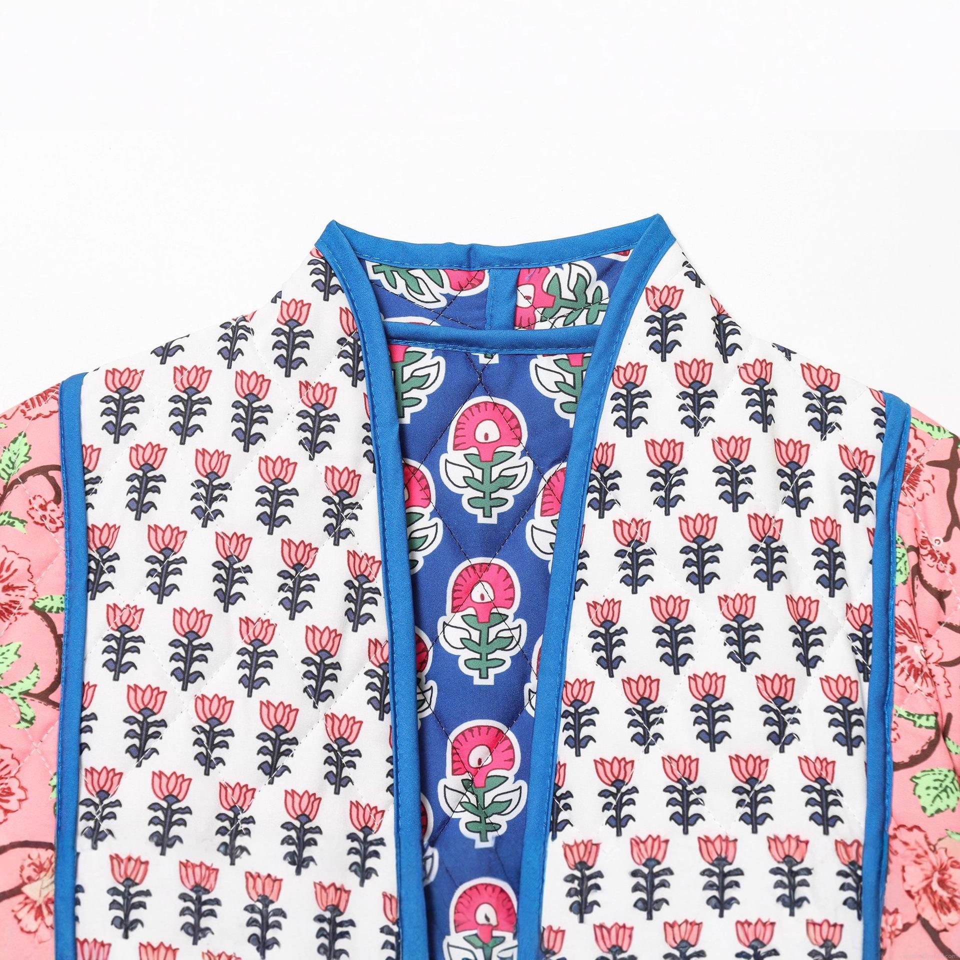 Women's Patchwork Quilted Jacket Bohemian Floral Print Long Sleeve Outerwear Padded Cotton Coat Casual V-Neck Streetwear Jackets For Women