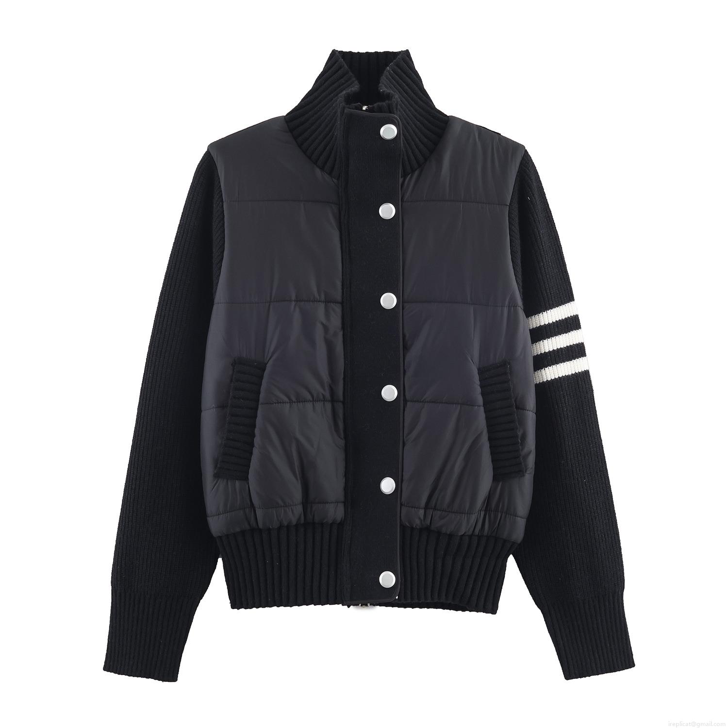 • Women's Patchwork Quilted Jacket Knitted Sleeve Stand Collar Padded Outerwear Four Stripe Design Metal Button Casual Coat For Autumn Winter