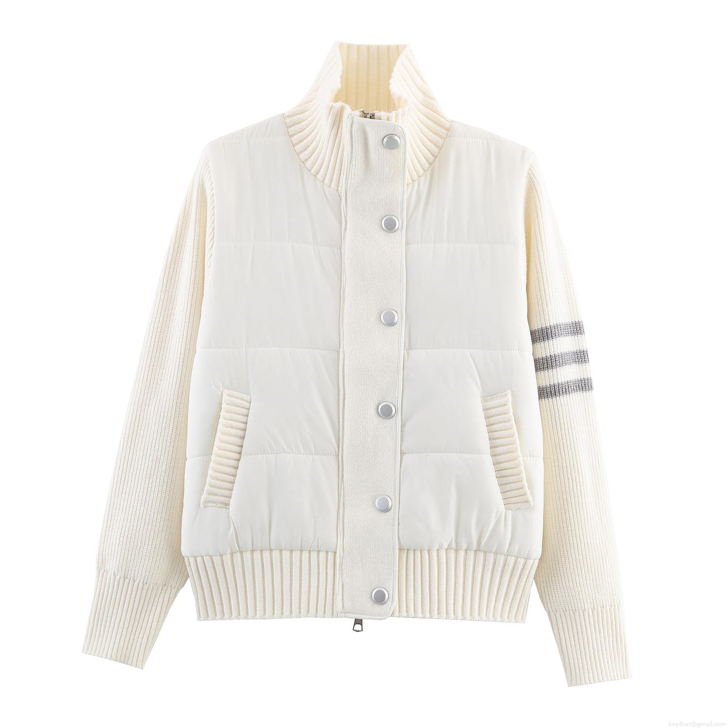 Women's Patchwork Quilted Jacket Knitted Sleeve Stand Collar Padded Outerwear Four Stripe Design Metal Button Casual Coat For Autumn Winter