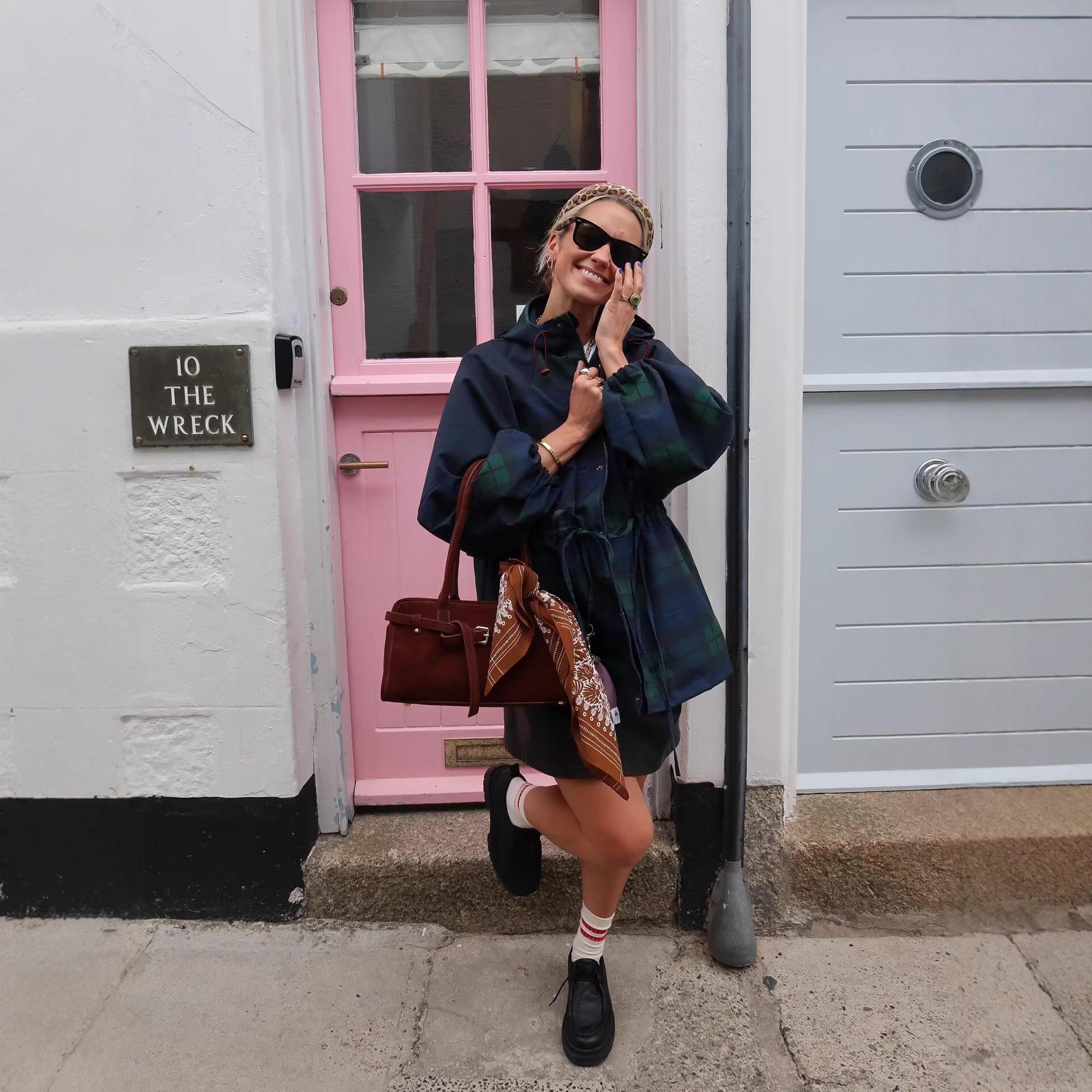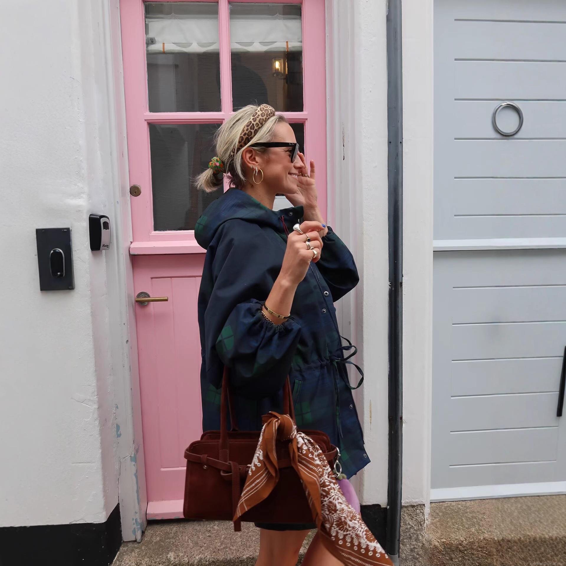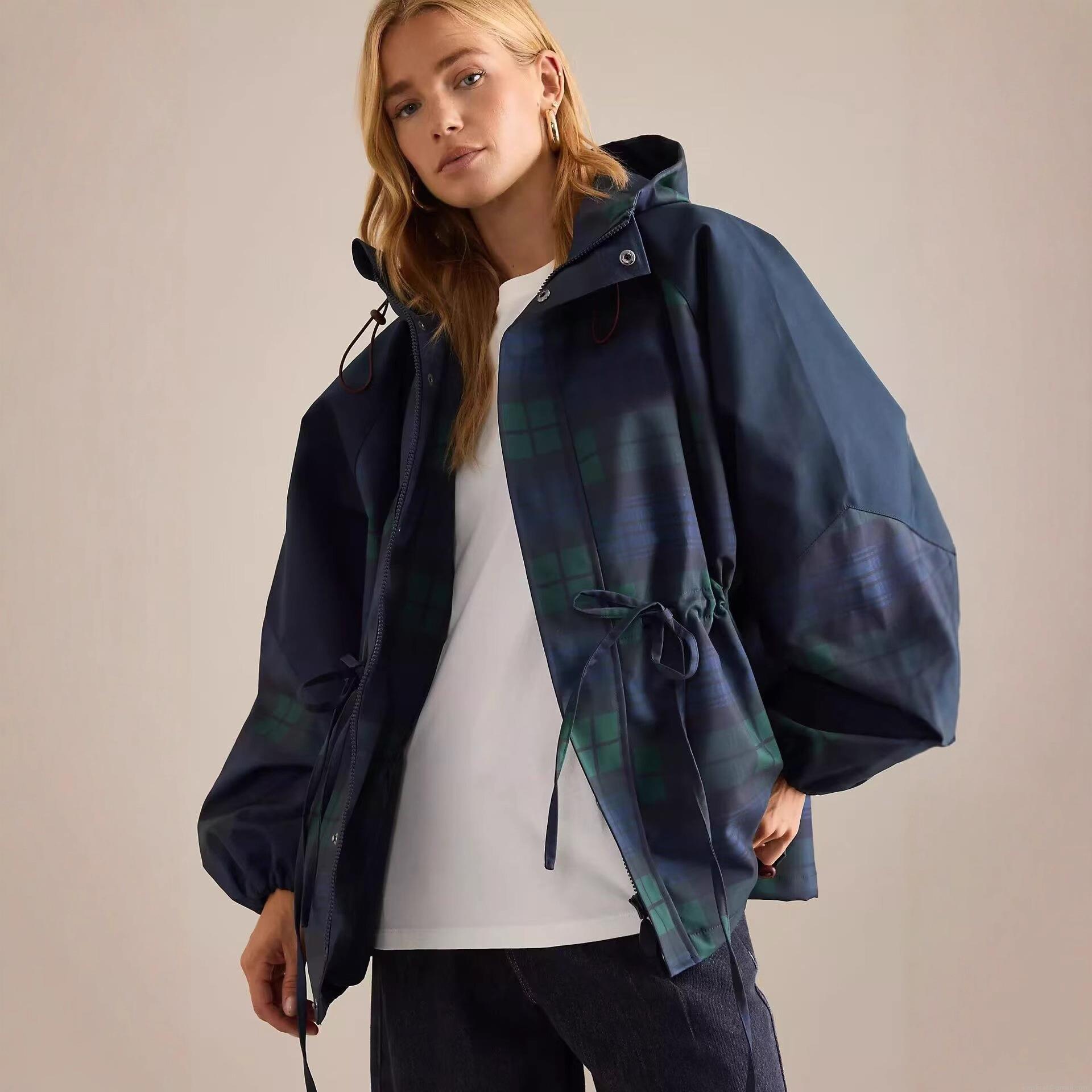 Checkered Pattern, Waist shaping, Color Blocking, Zipper, Drawstring, Hood, Scottish Plaid