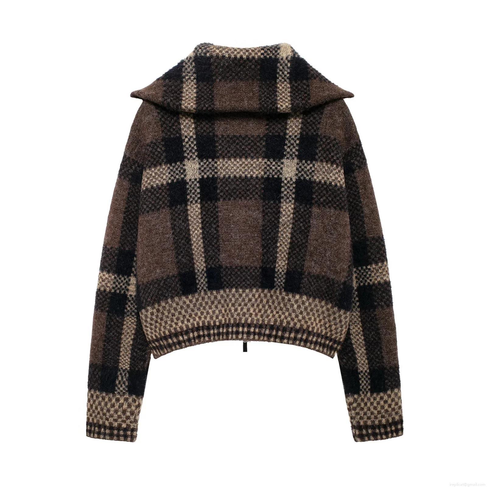 • Women's Plaid Knit Bomber Jacket Lapel Zipper Front Long Sleeve Cropped Jacket Coat Autumn Winter Vintage Plaid Pattern Thick Warm Outerwear for Women