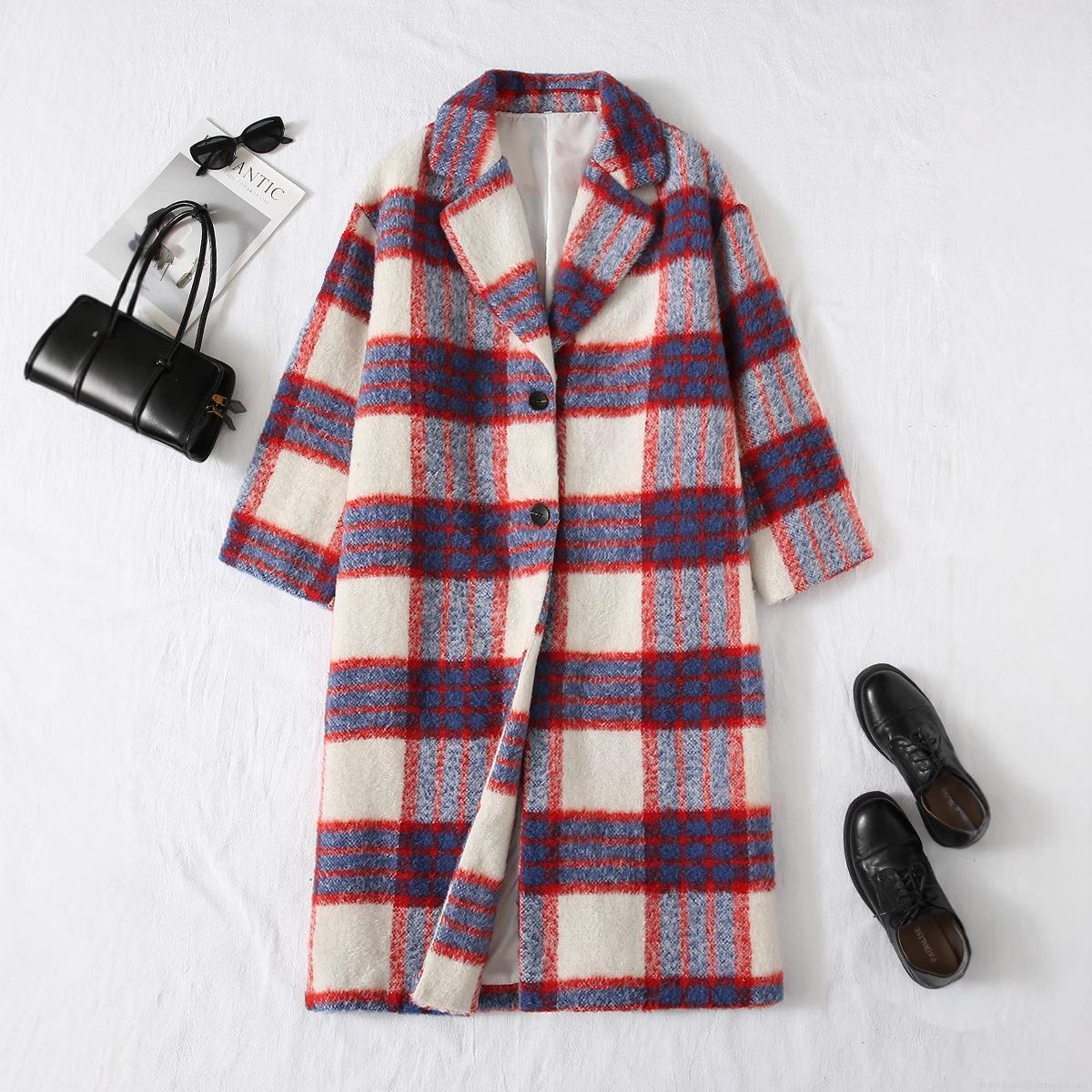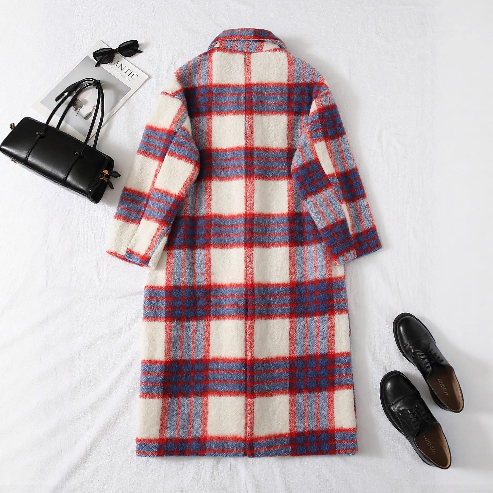 Women's Plaid Long Woolen Coat Red Blue White Checkered Lapel Long Sleeve Single Breasted Loose Overcoat Autumn Winter Outerwear For Ladies