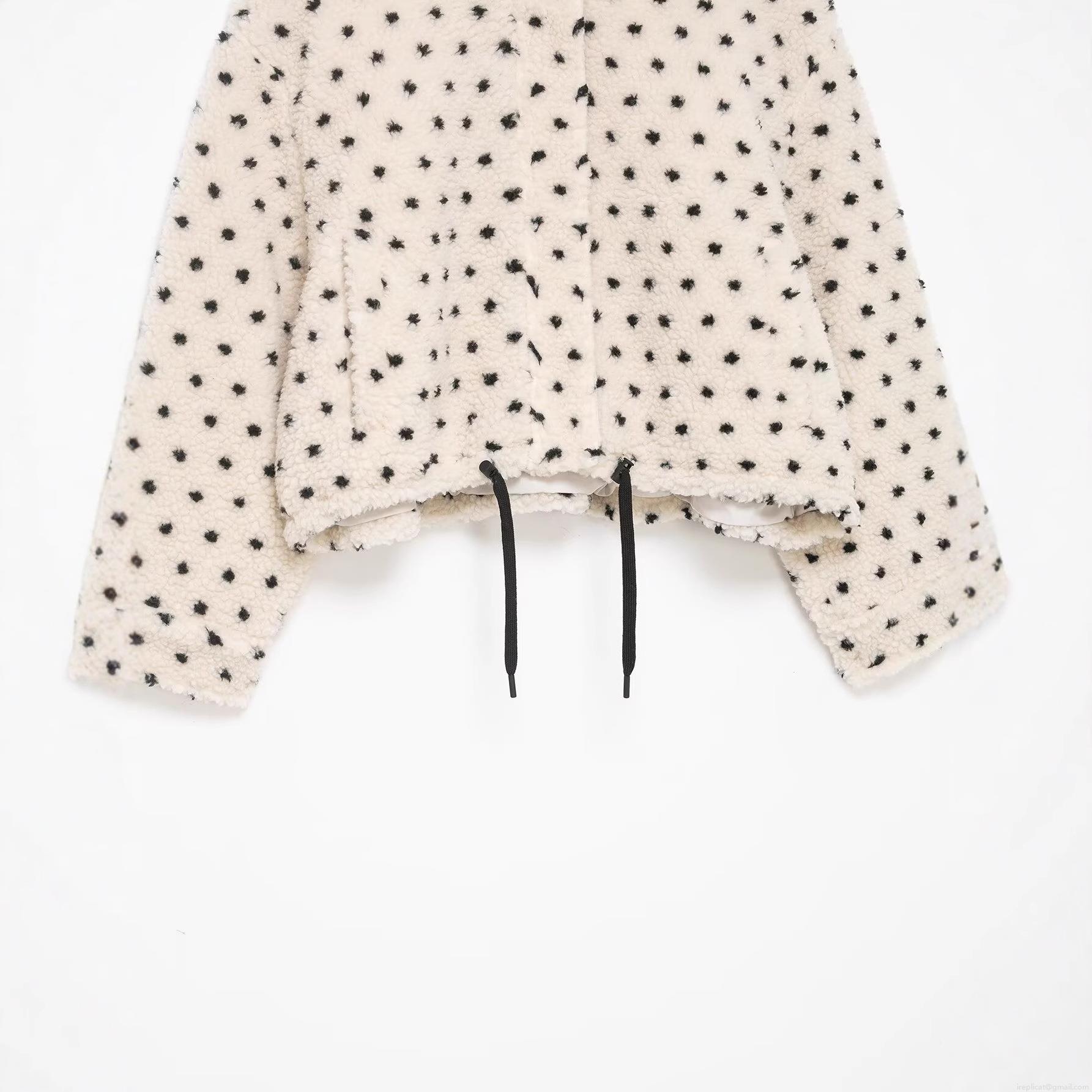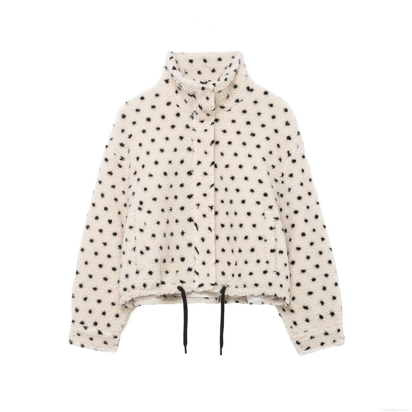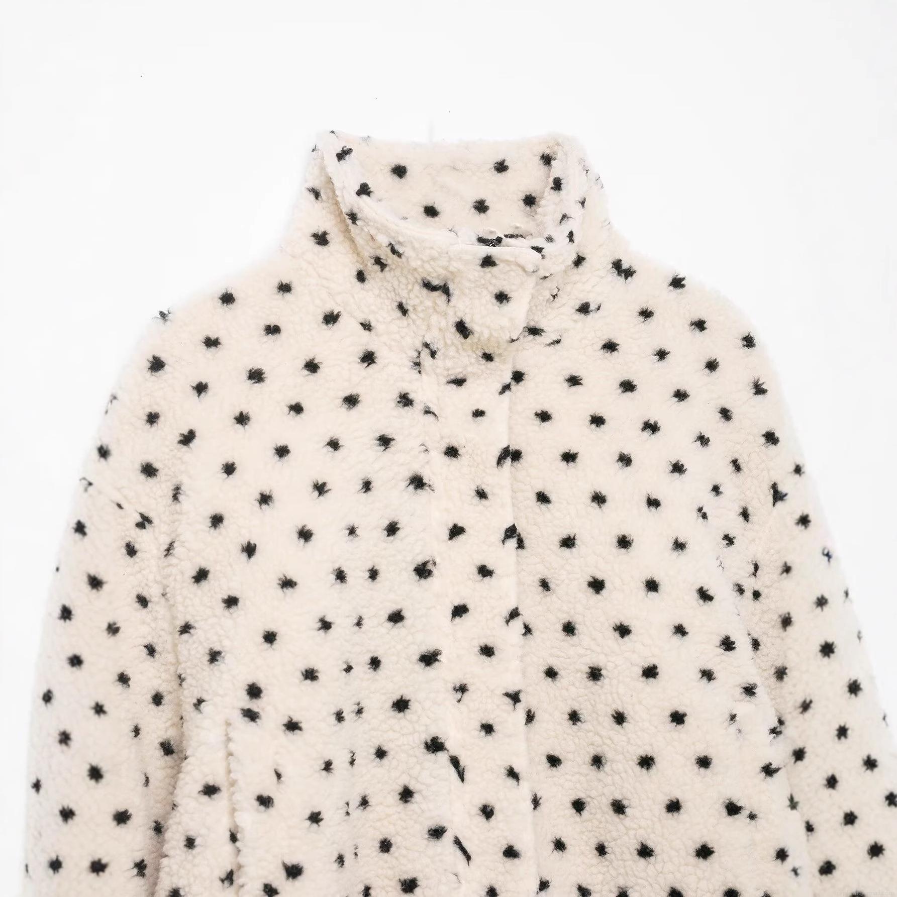 • Women's Polka Dot Sherpa Fleece Jacket Stand Collar Warm Loose Short Coat With Drawstring Hem Casual Streetwear Winter Zip Up Outerwear