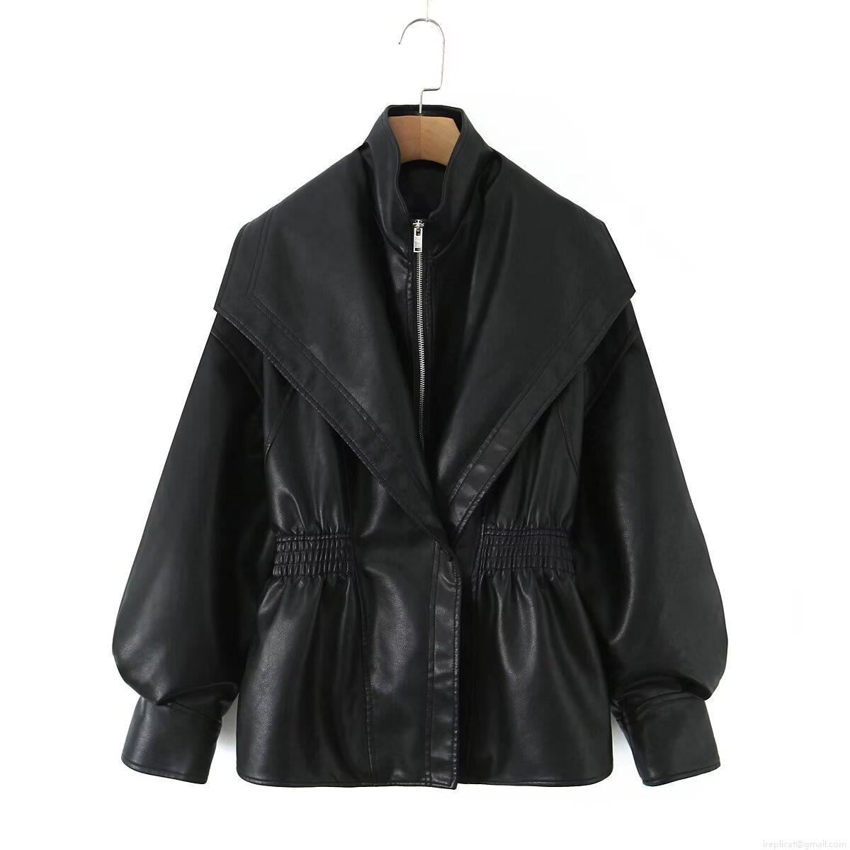 • Women's PU Leather Jacket Double Layer Collar Lantern Sleeve Cinch Waist Zipper Closure Solid Color Streetwear Casual Autumn Winter Windproof Outerwear Coat
