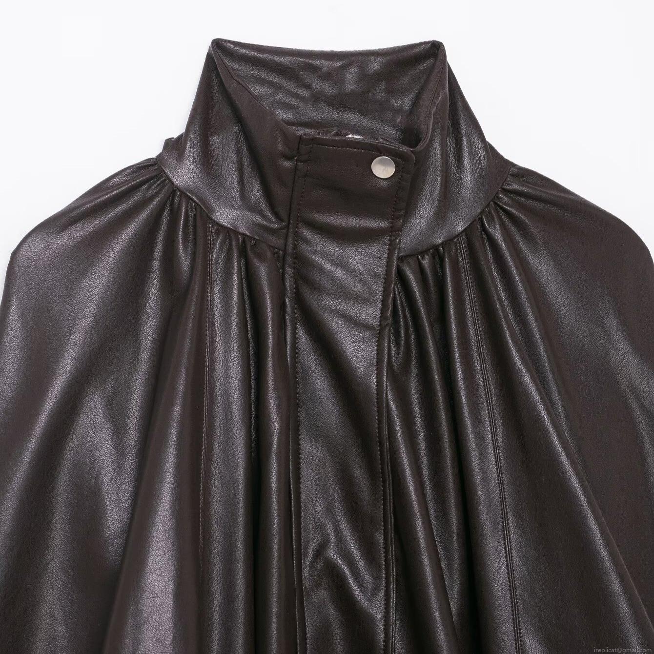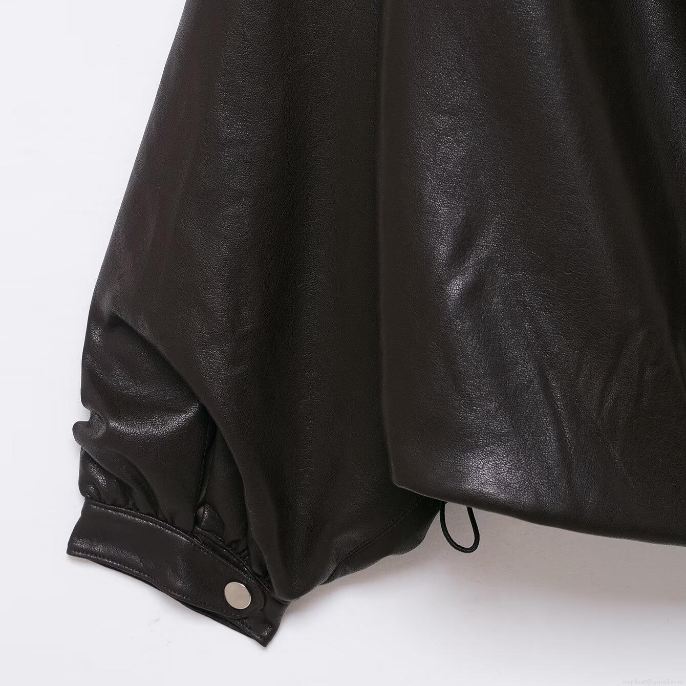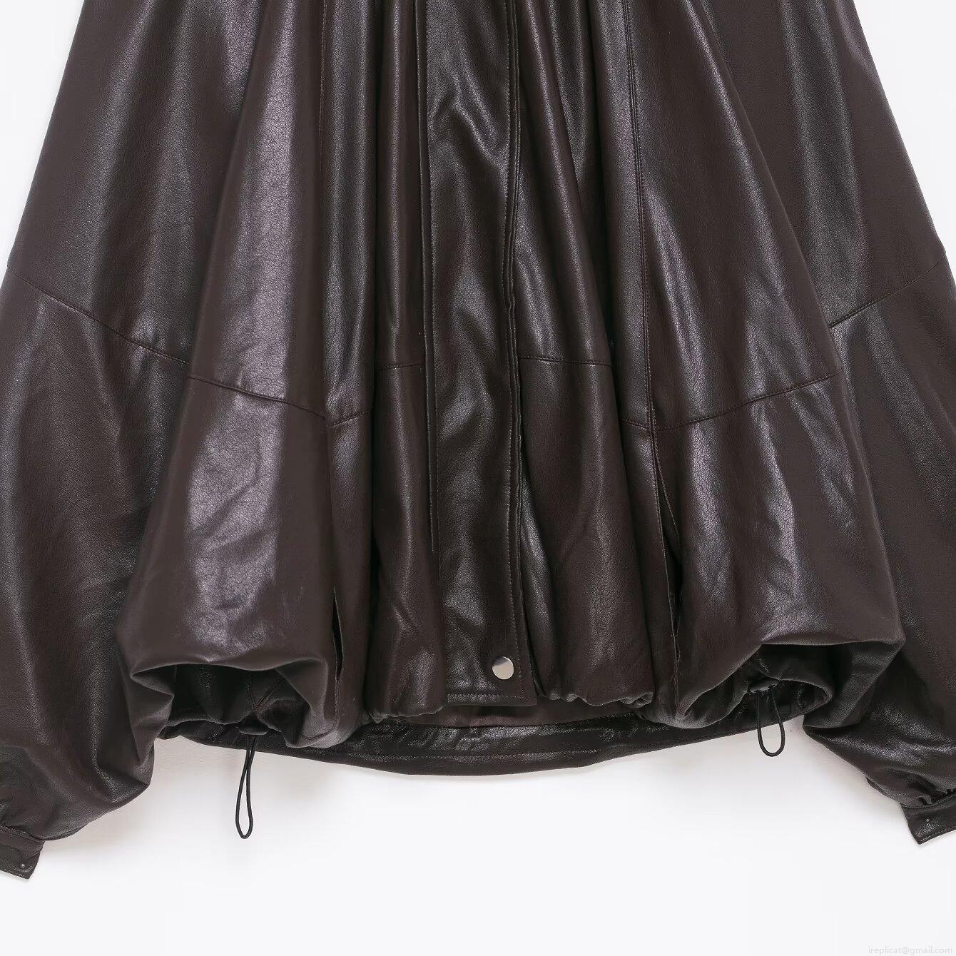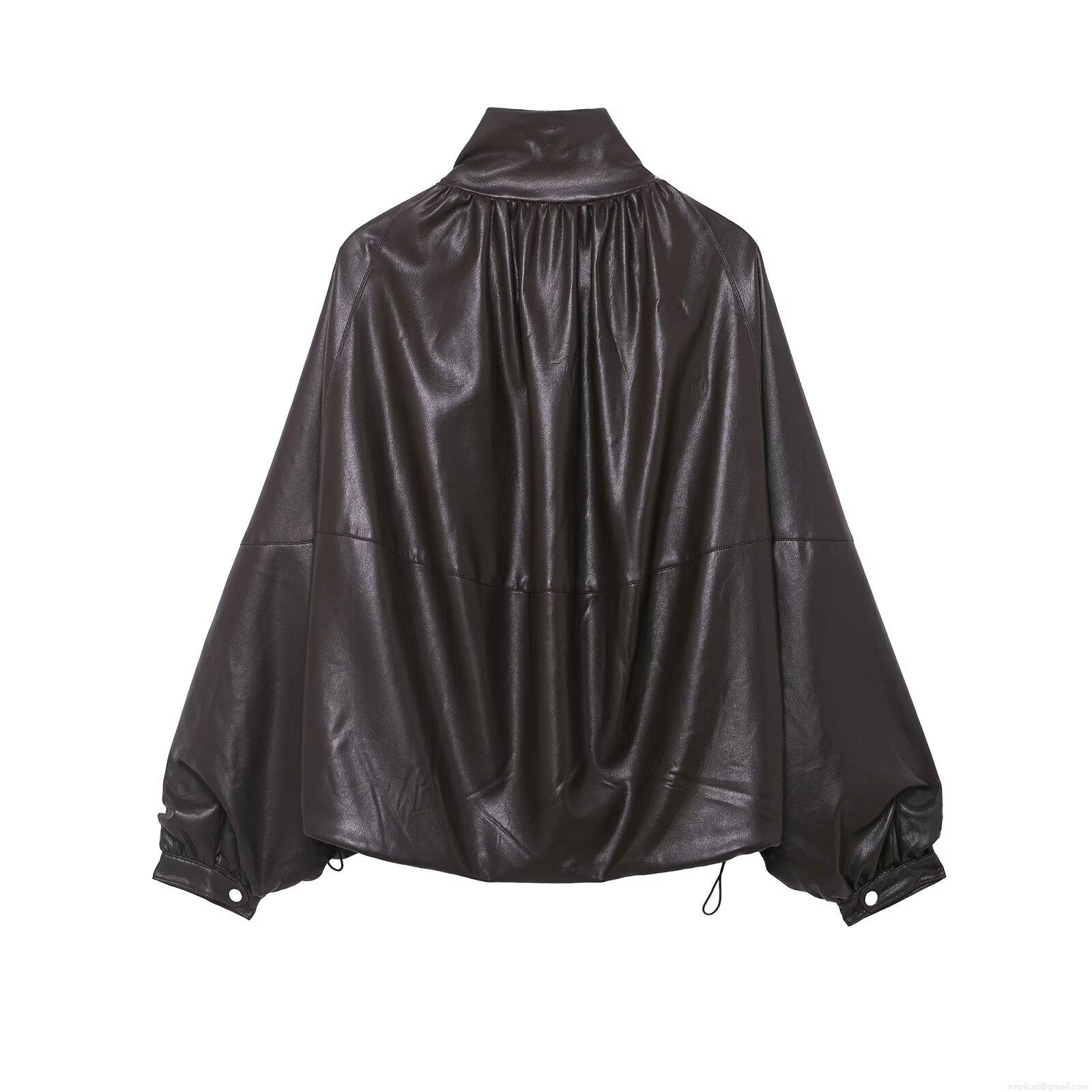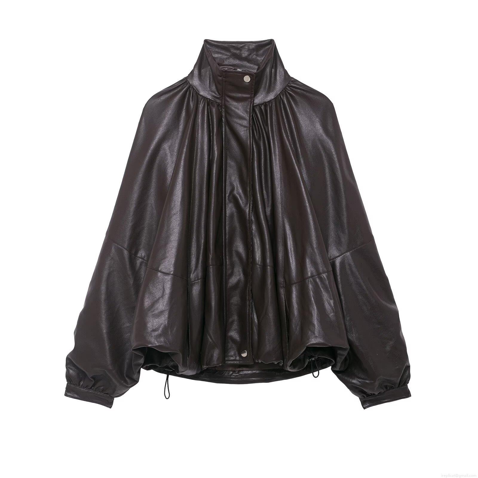 • Women's PU Leather Jacket Faux Leather Biker Coat With Stand Collar Loose Fit Drawstring Hem Solid Coffee Color Winter Outerwear Casual Chic Fashion Jackets