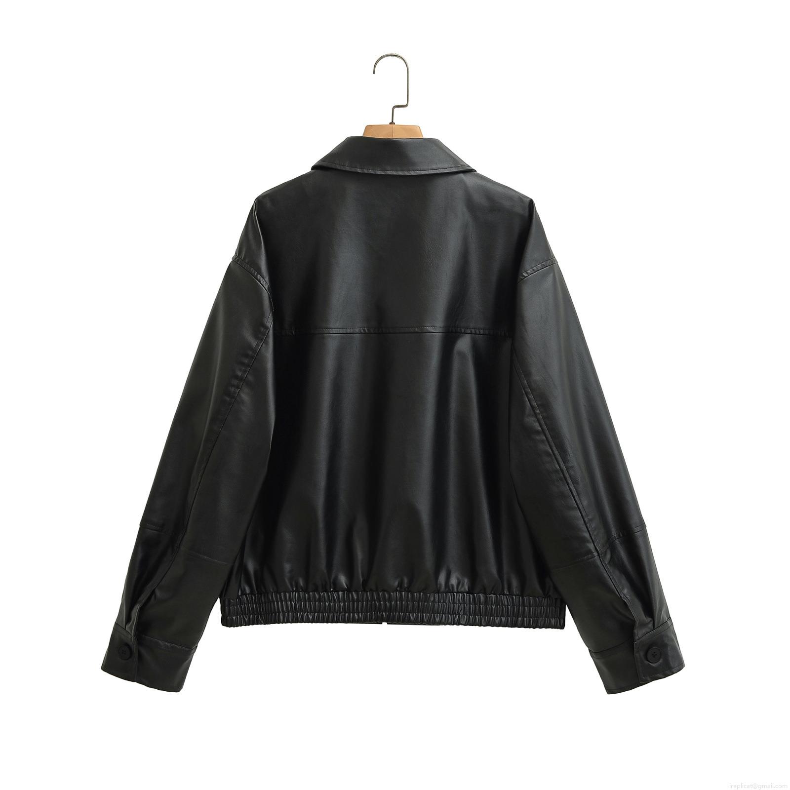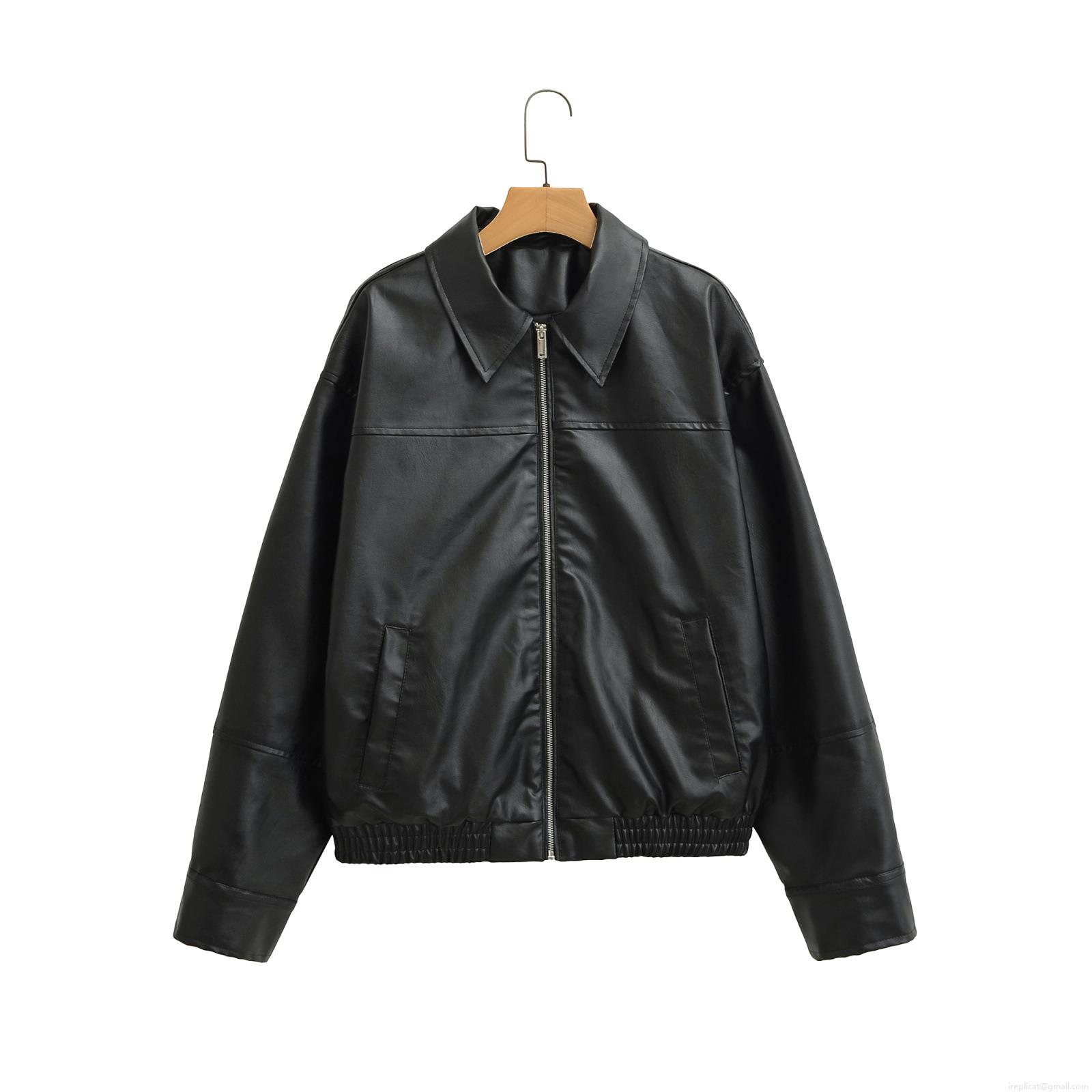 • Women's PU Leather Jacket Long Sleeve Lapel Zipper Outerwear Loose Fit Polyester Lining Bomber Coat Streetwear For Autumn Winter