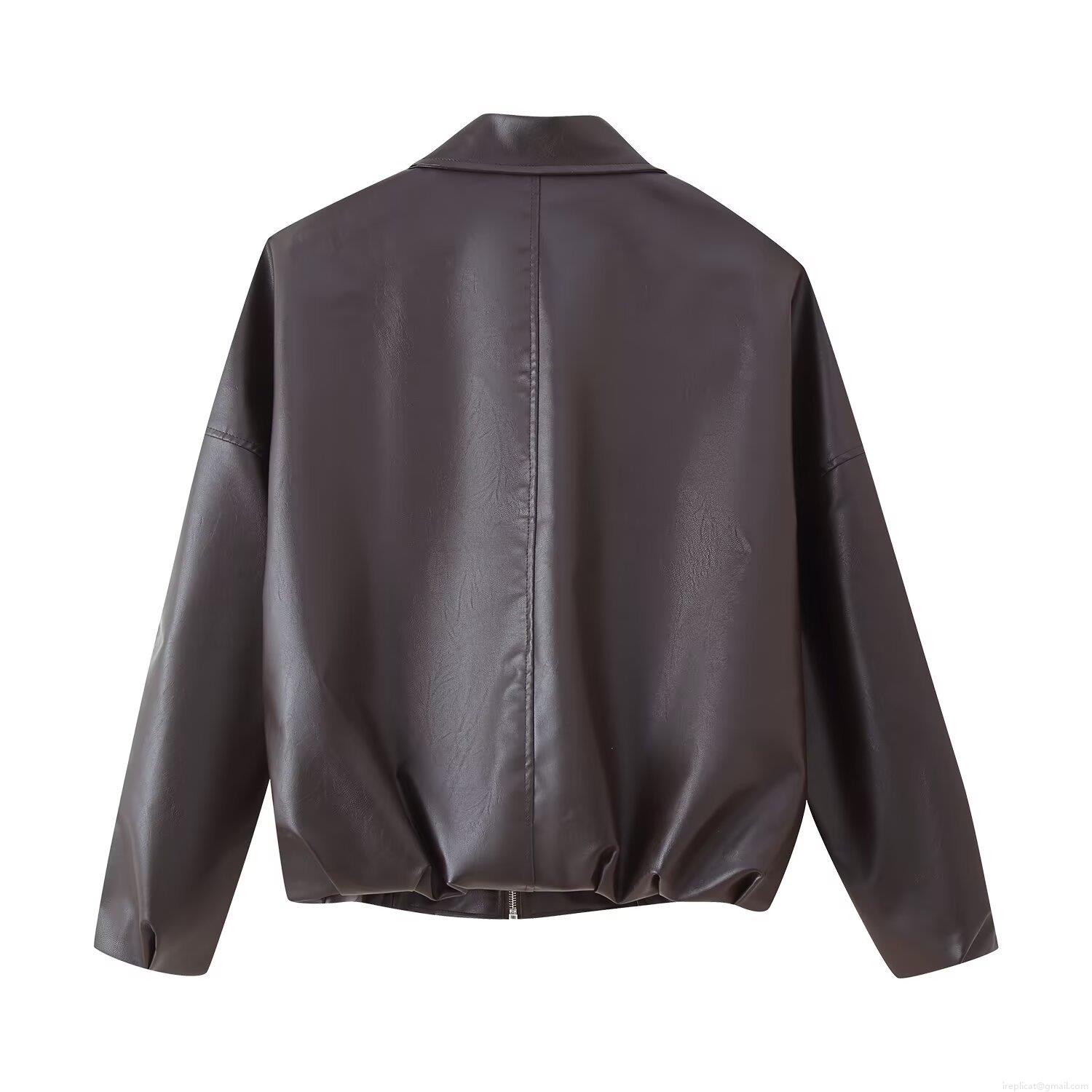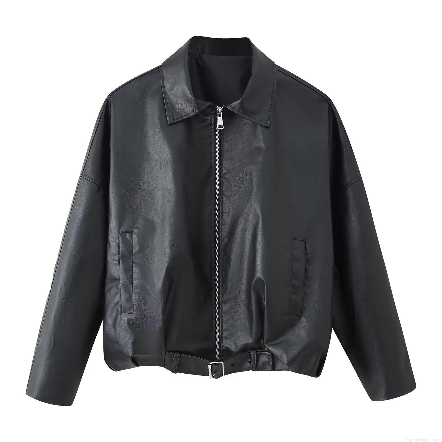 • Women's PU Leather Jacket With Belt Decoration Lapel Long Sleeve Zipper Biker Outwear Autumn Winter Streetwear Solid Color Casual Regular Fit Coat For Women