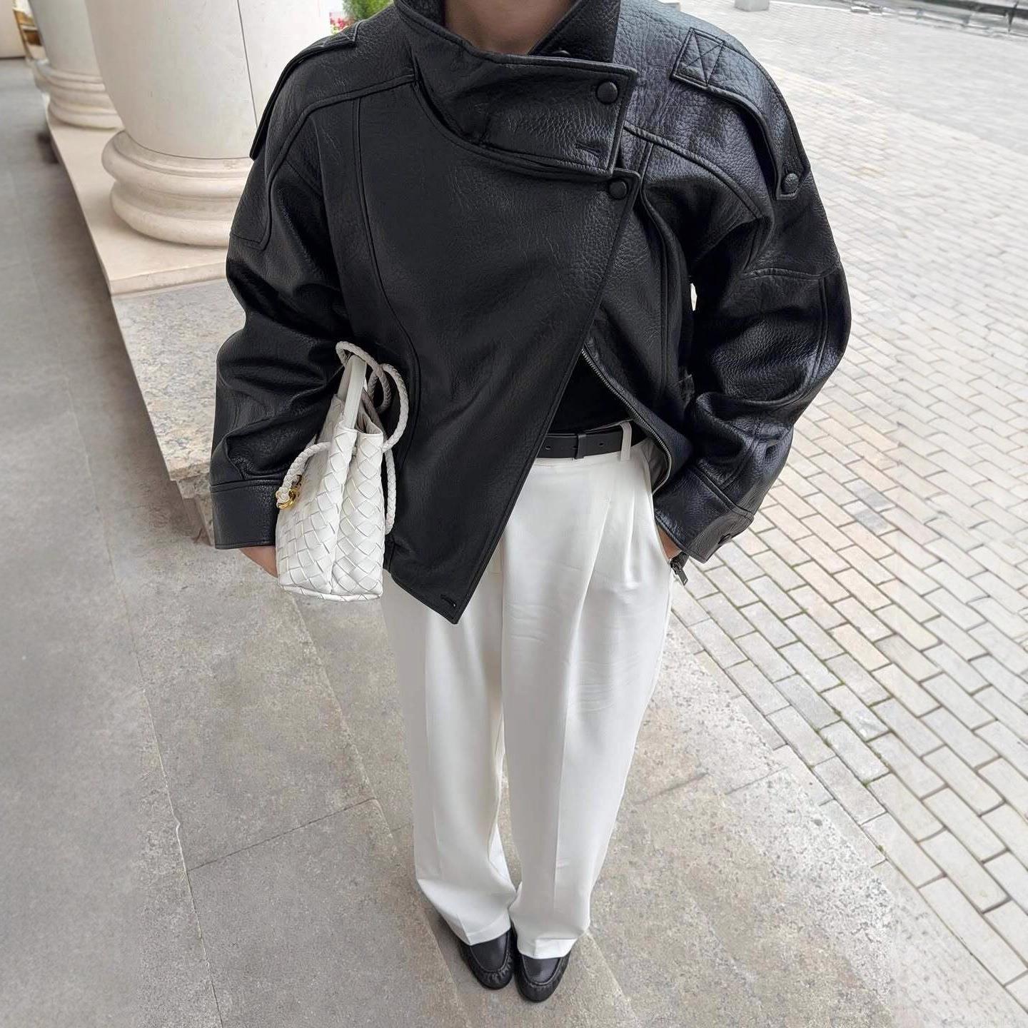 • Women's PU Leather Motorcycle Jacket Stand Collar Long Sleeve Loose Biker Outwear Autumn Winter Streetwear Lady Fashion Slanted Zip Up Faux Leather Coat