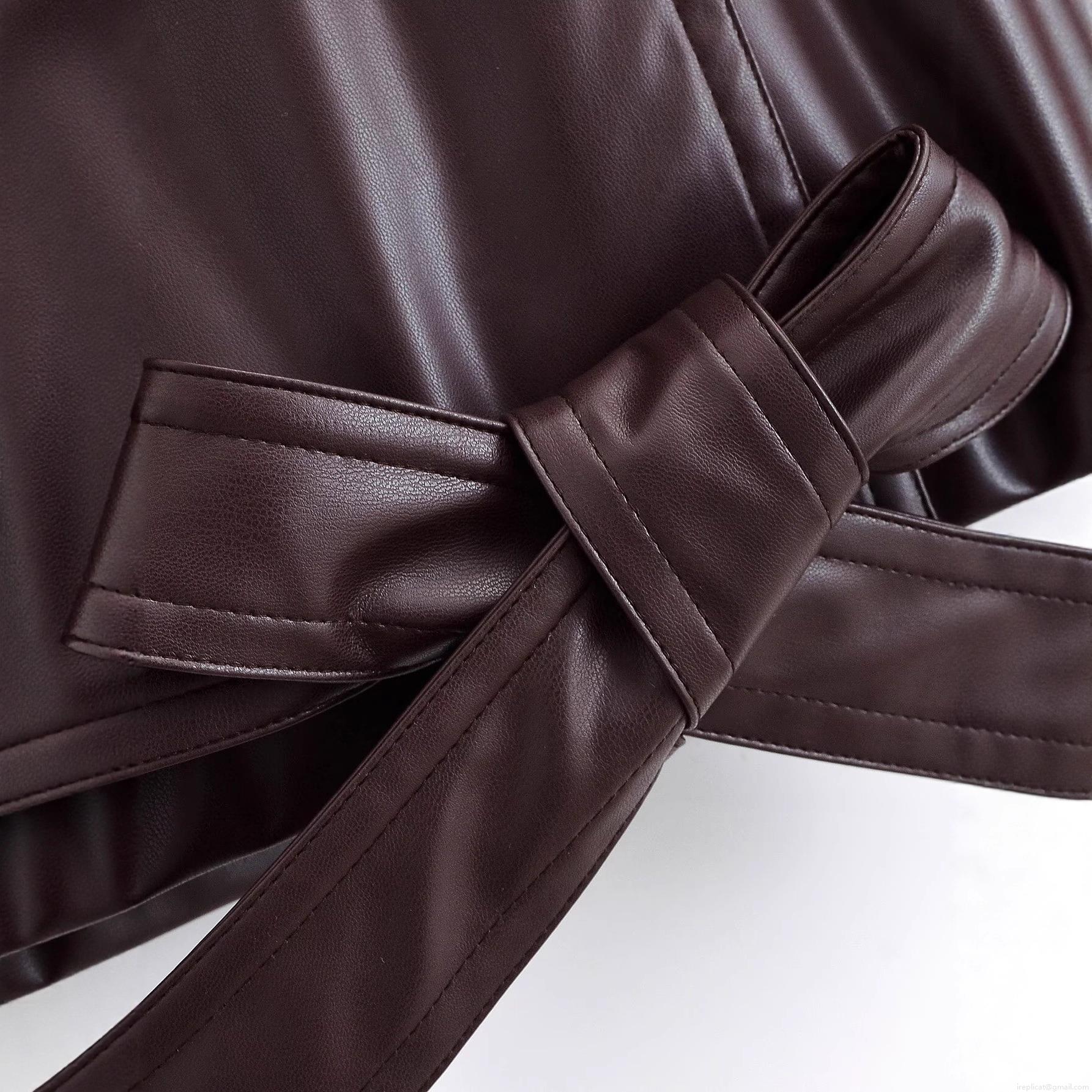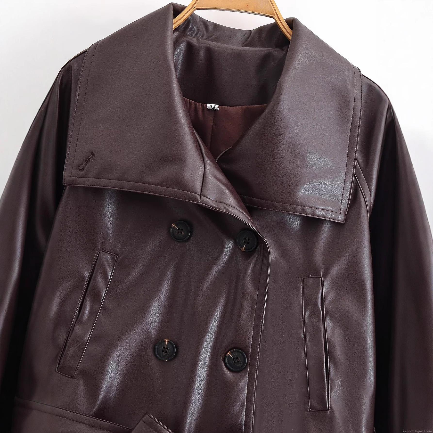 Women's PU Leather Short Trench Coat Double Breasted Lapel Windbreaker Jacket With Belt Fall Winter Fashion Streetwear Brown Jackets Outwear