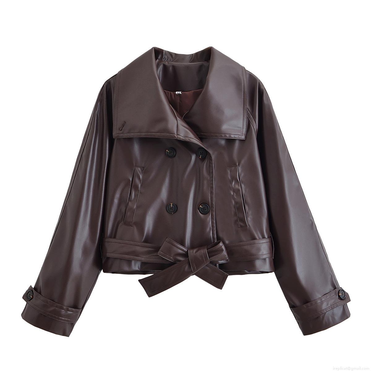 • Women's PU Leather Short Trench Coat Double Breasted Lapel Windbreaker Jacket With Belt Fall Winter Fashion Streetwear Brown Jackets Outwear
