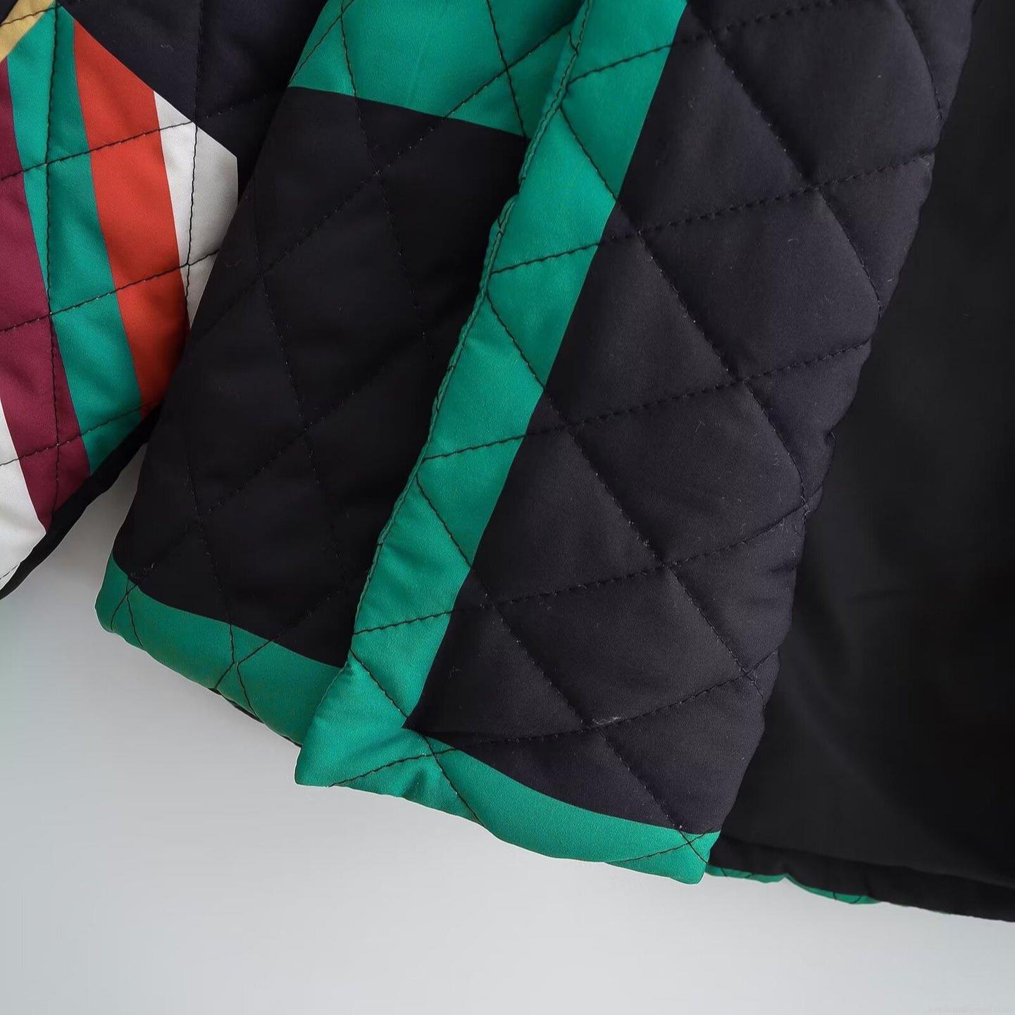 Women's Quilted Patchwork Jacket Vintage Geometric Print Loose Open Front Long Sleeve Casual Padded Outerwear Coat For Winter