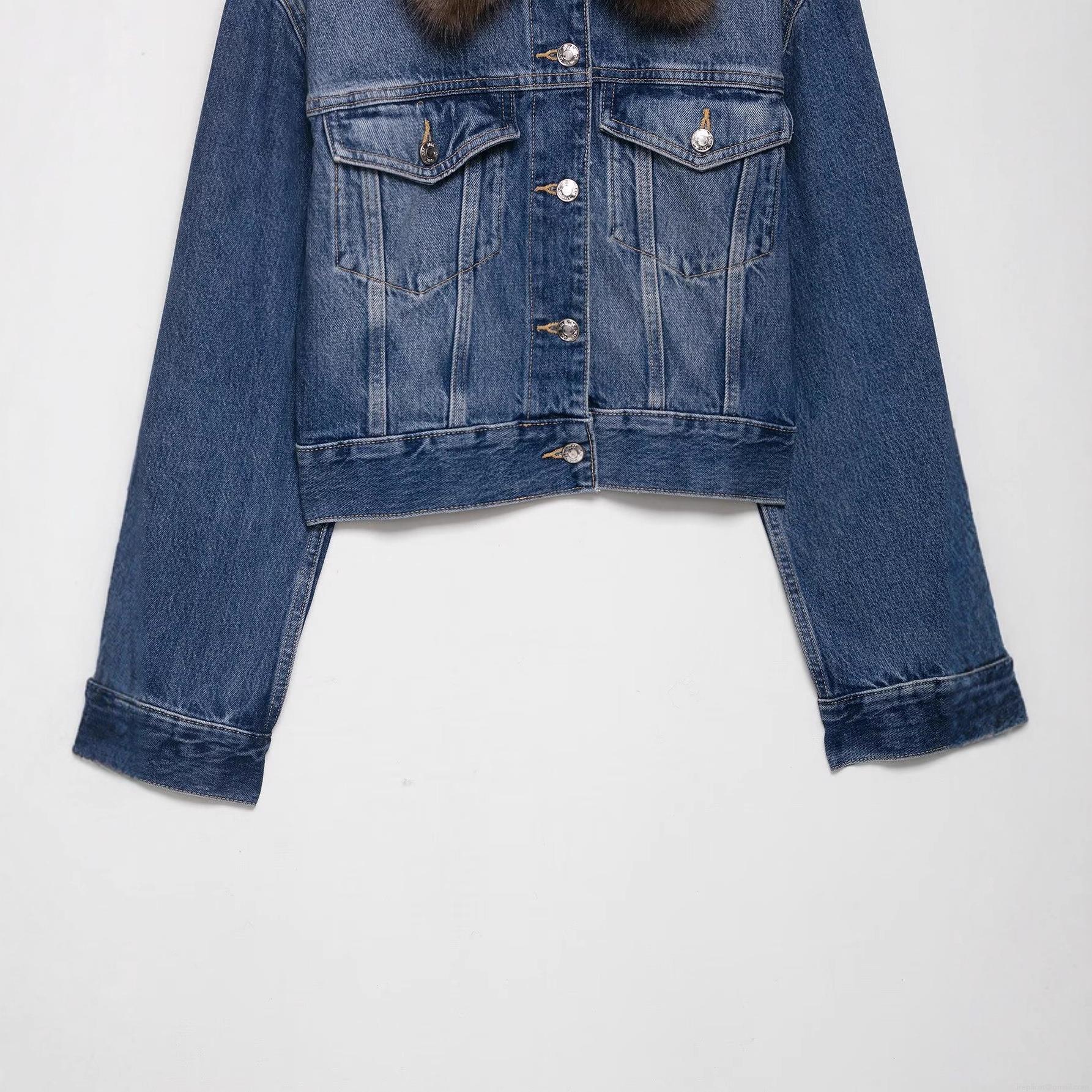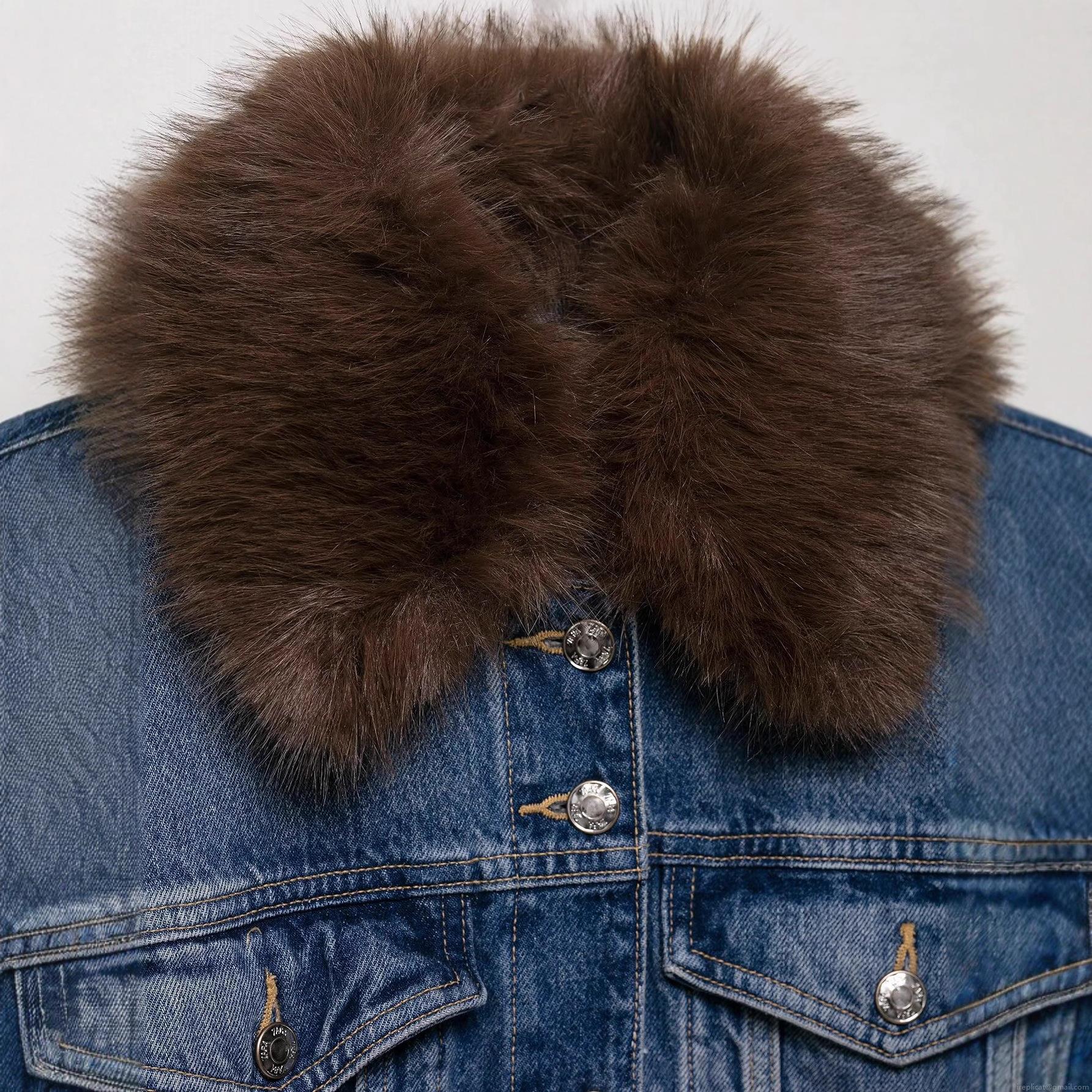 Women's Retro Blue Faux Fur Collar Denim Jacket With Metal Buttons Short Faux Shearling Lapel Jean Coat For Autumn Winter Streetwear