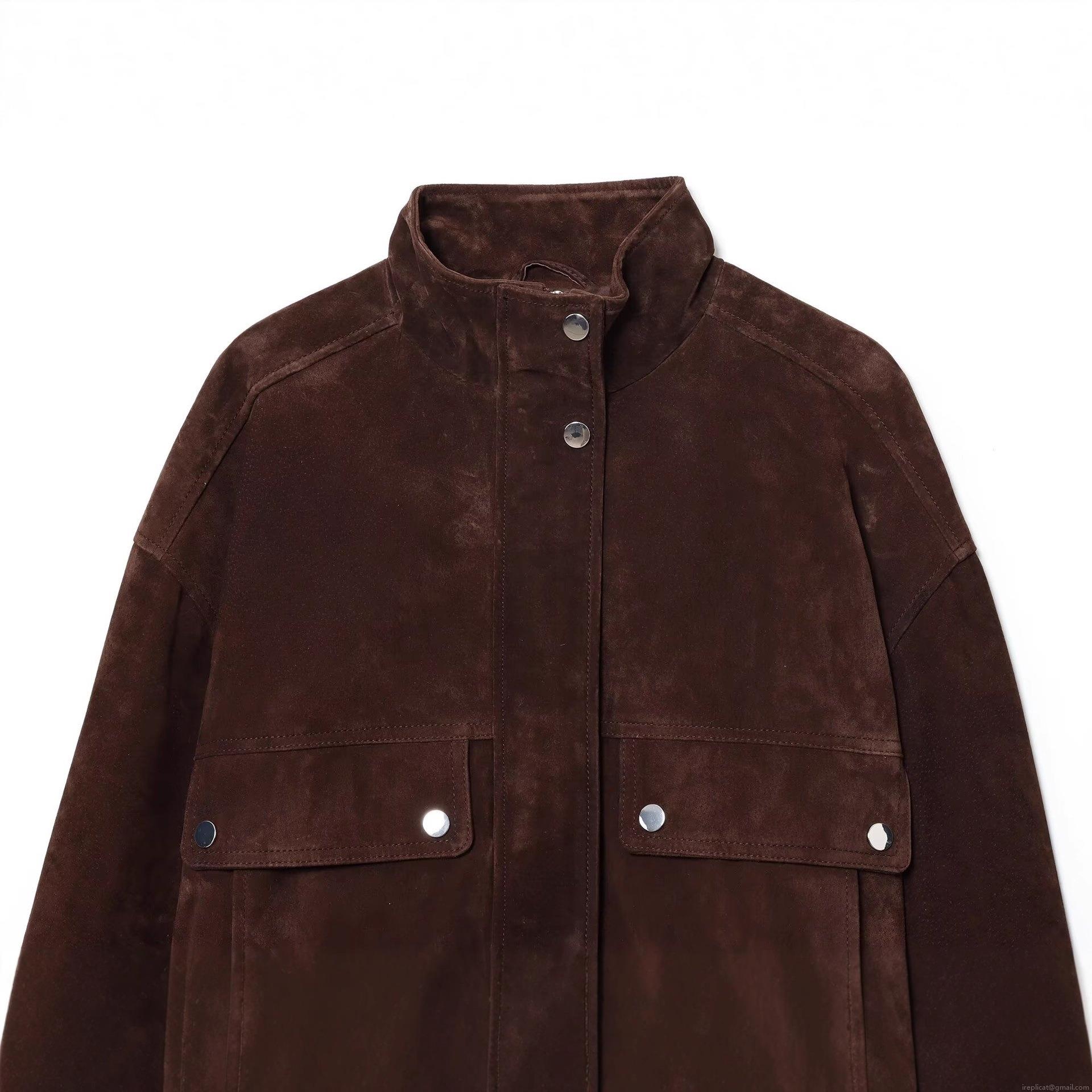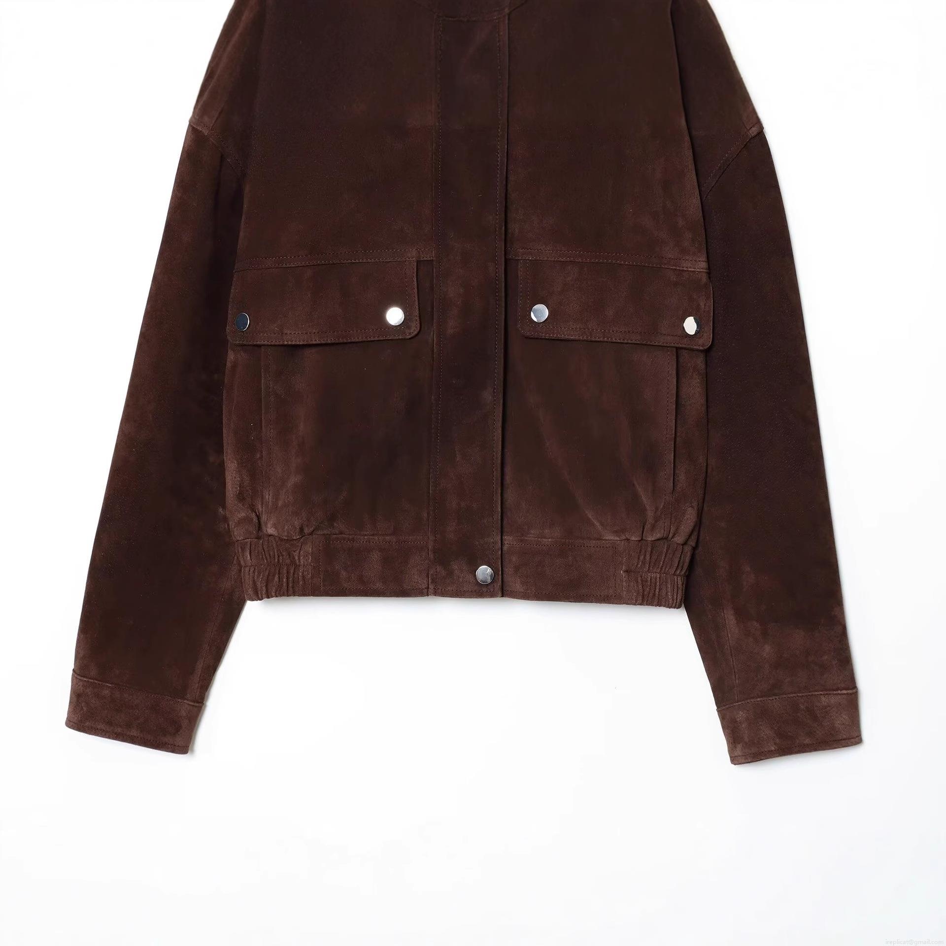 • Women's Retro Faux Suede Bomber Jacket Short Coat With Silver Metal Buttons And Flap Pockets Solid Color Street Casual Loose Fit Outerwear