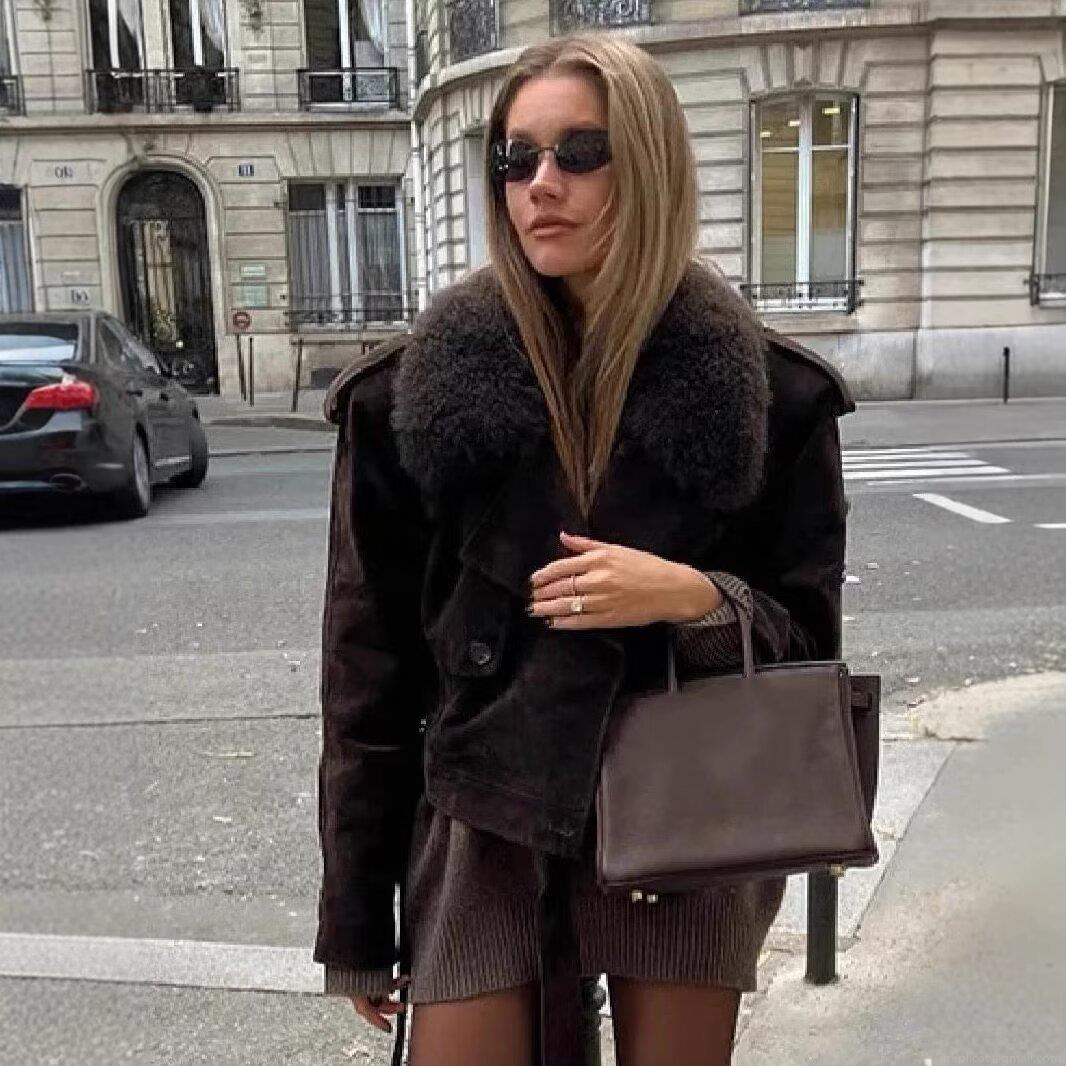 • Women's Retro Faux Suede Jacket Brown Short Waist Tie Coat With Detachable Faux Fur Collar Lapel Long Sleeve Winter Warm Outerwear Fashion For Ladies