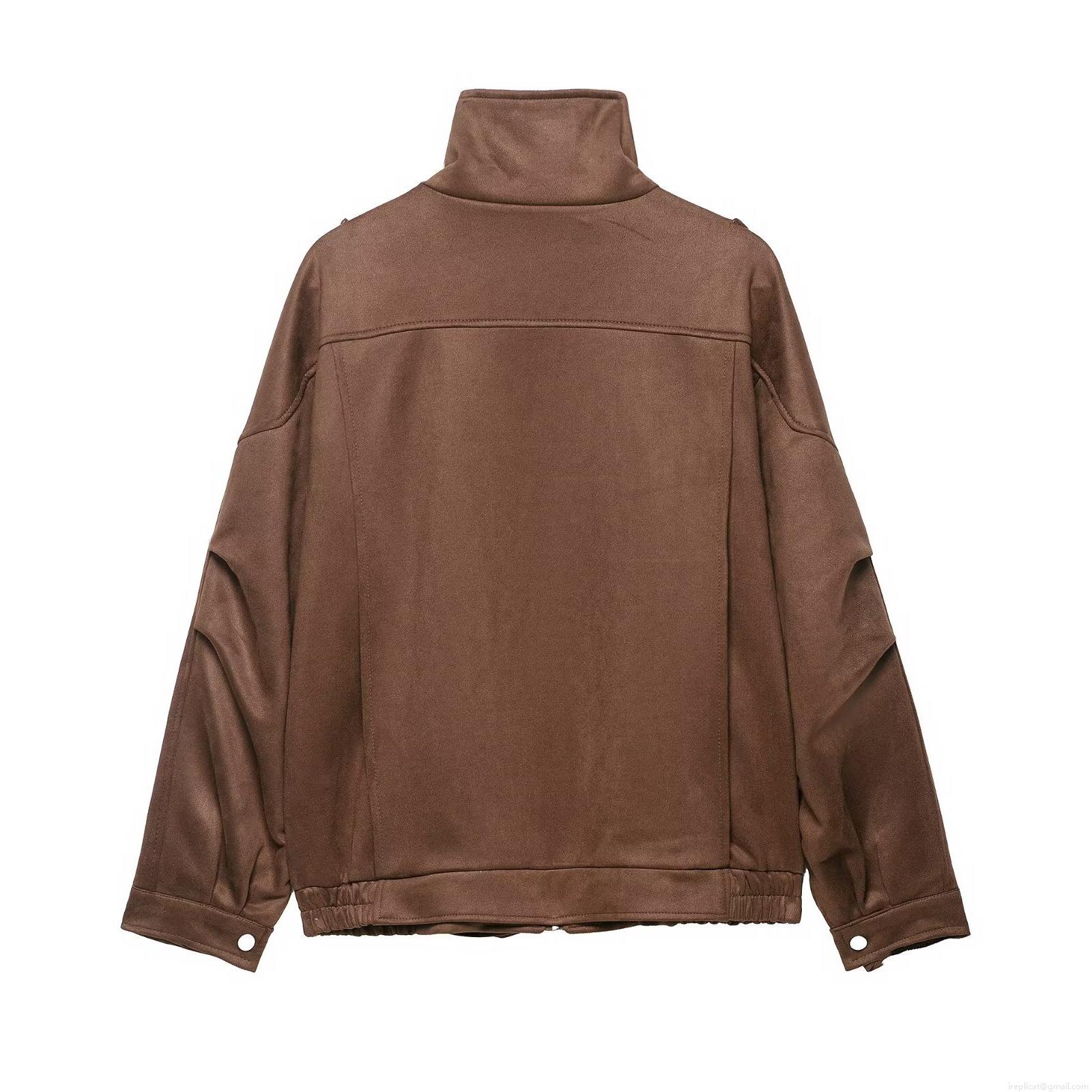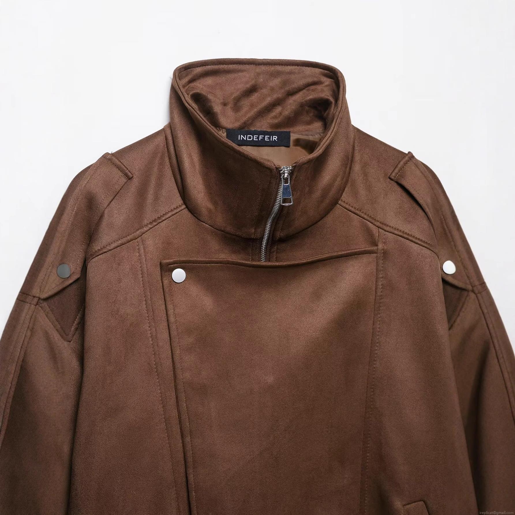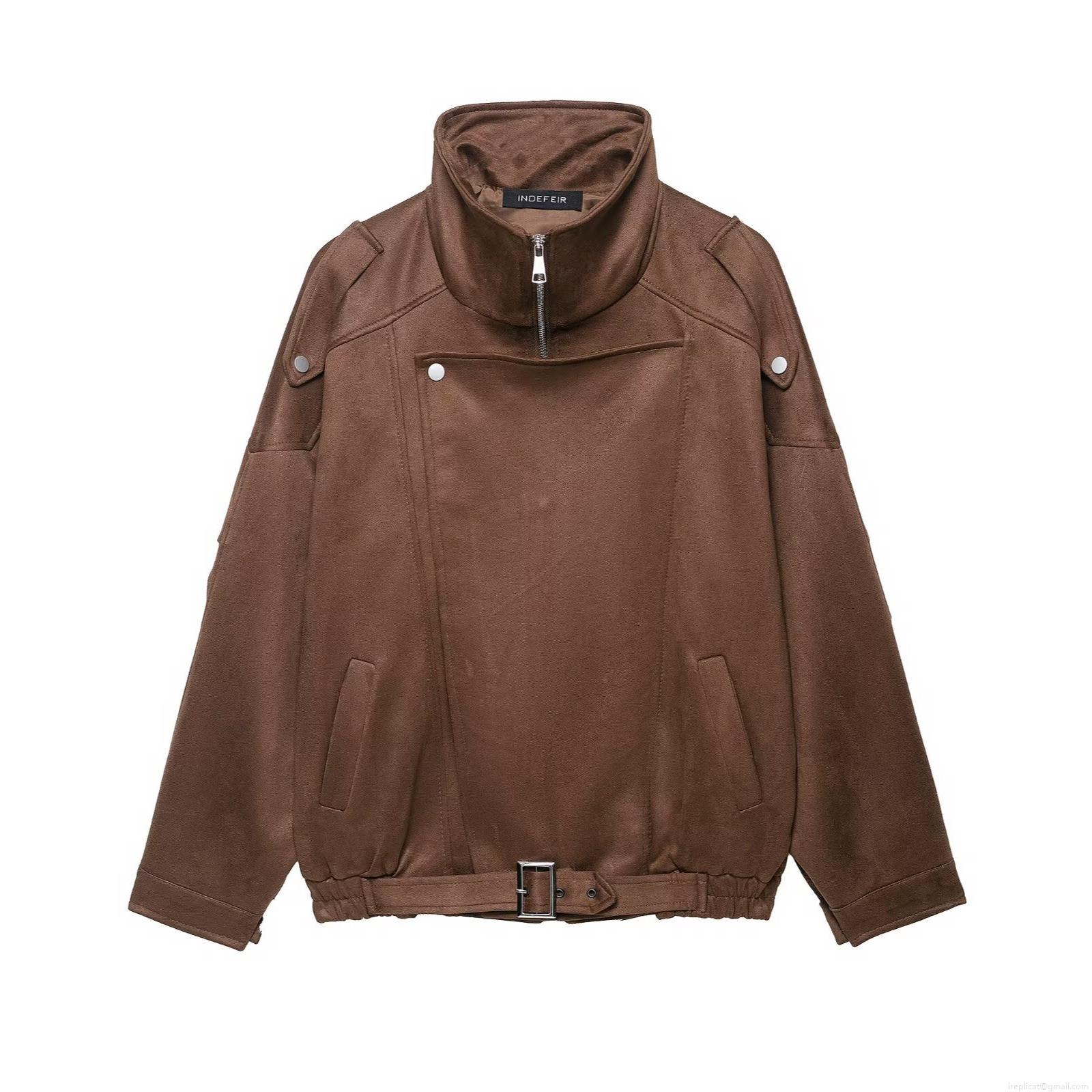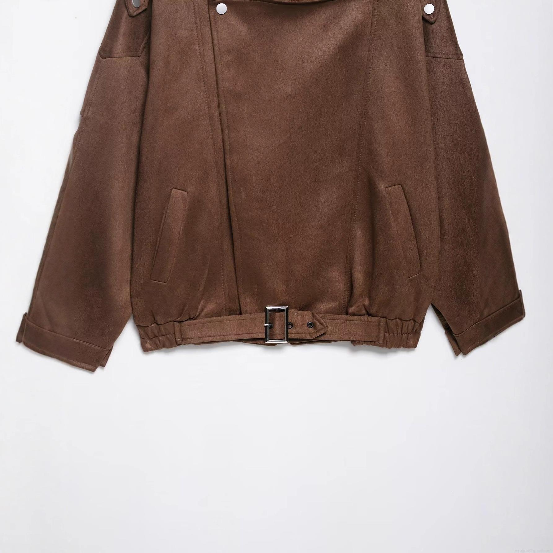 • Women's Retro Faux Suede Moto Jacket Stand Collar Asymmetric Zipper Long Sleeve Loose Outwear Brown Vintage Streetwear Coat With Belt