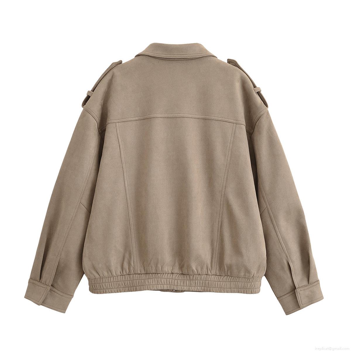 Women's Retro Faux Suede Workwear Jacket Loose Zipper Coat With Pocket Epaulettes Fashion Streetwear Fall Winter Lapel Outerwear