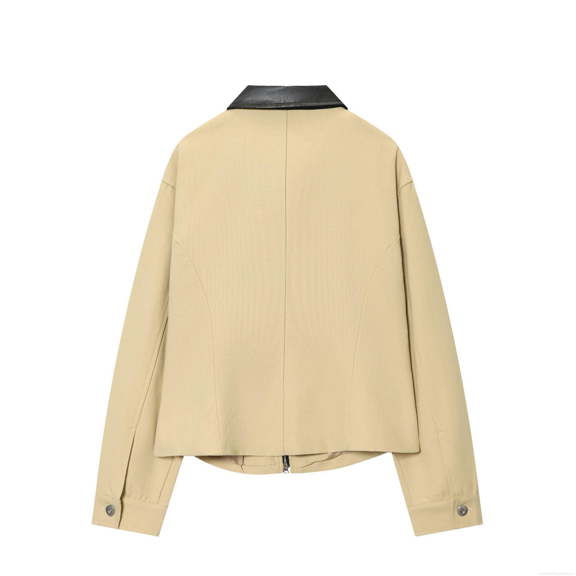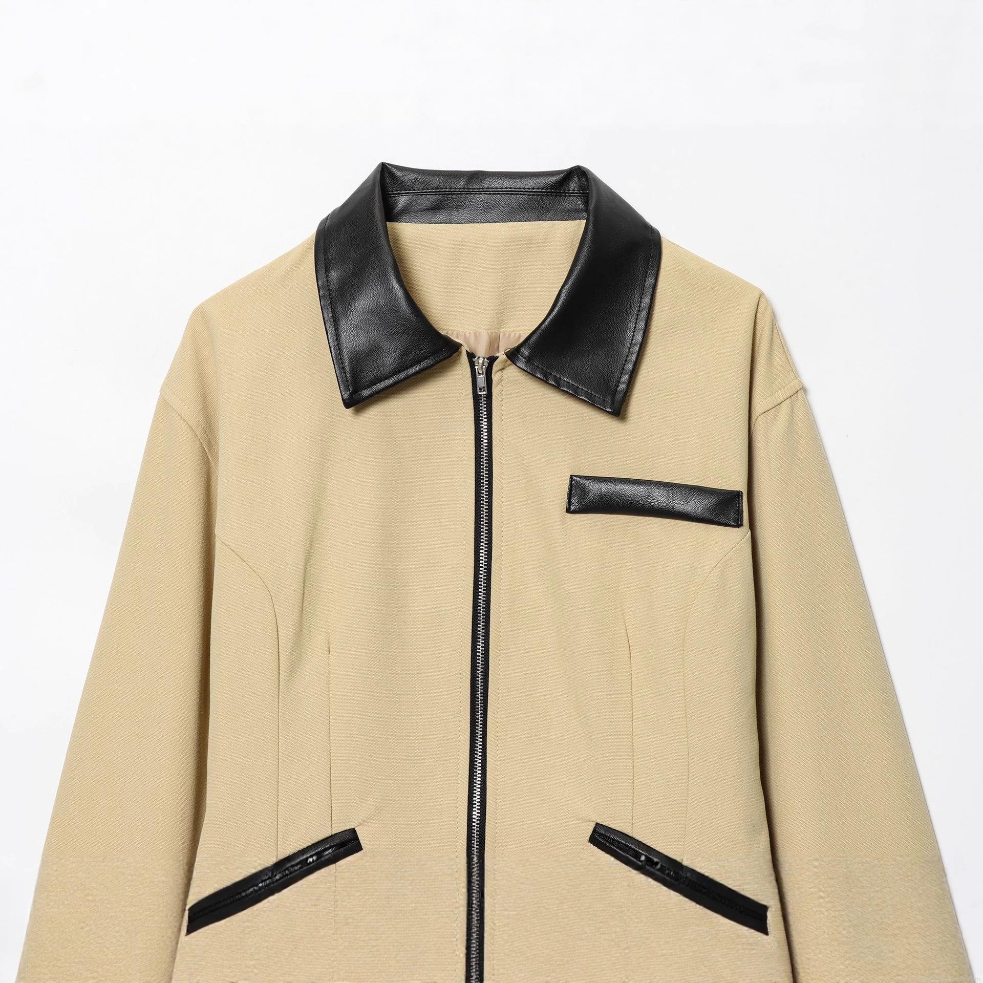Women's Retro Khaki Canvas Jacket With Black PU Leather Lapel Collar Metal Zipper Short Slim Fit Long Sleeve Outerwear British Style Casual Streetwear For Ladies