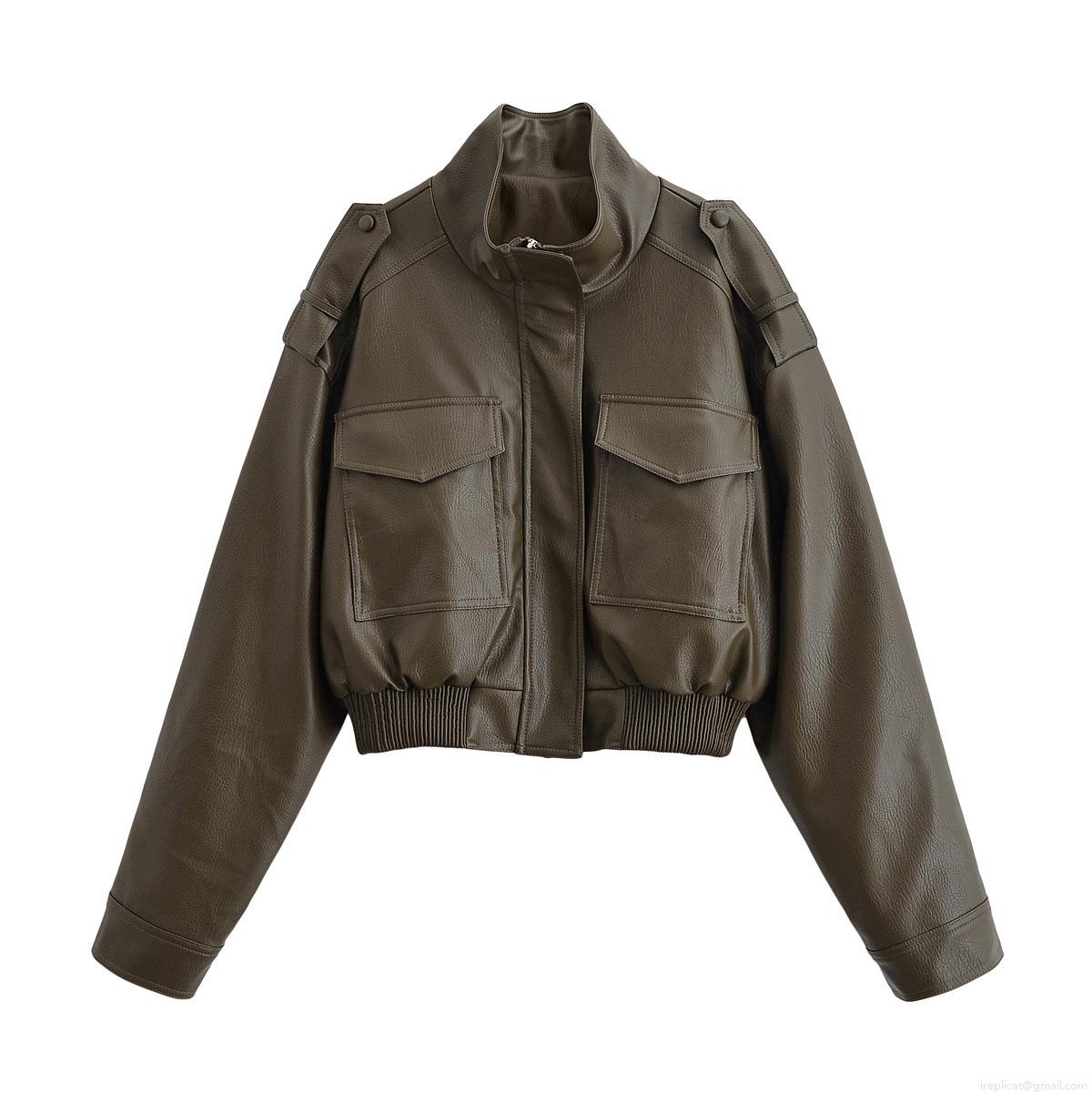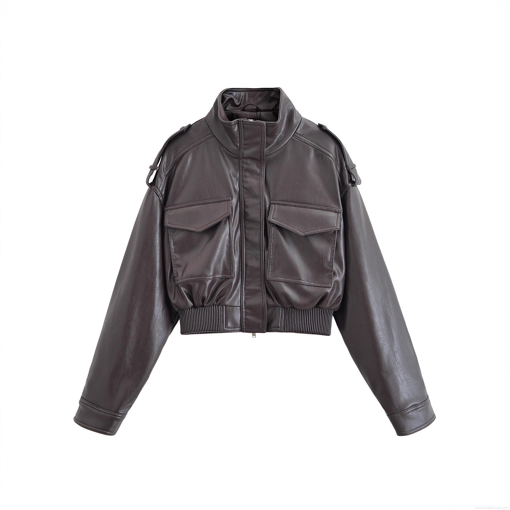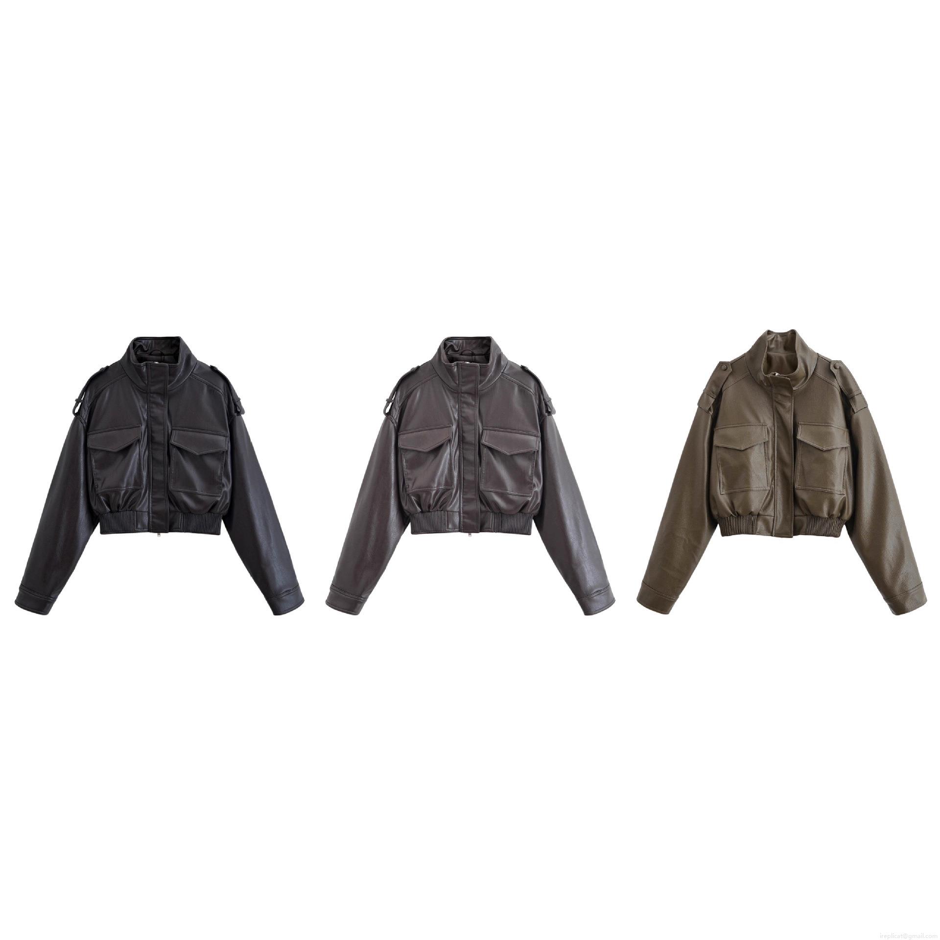 • Women's Retro PU Faux Leather Jacket Casual Stand Collar Zipper Cropped Baseball Uniform With Pockets Long Sleeve Streetwear Outerwear Coat