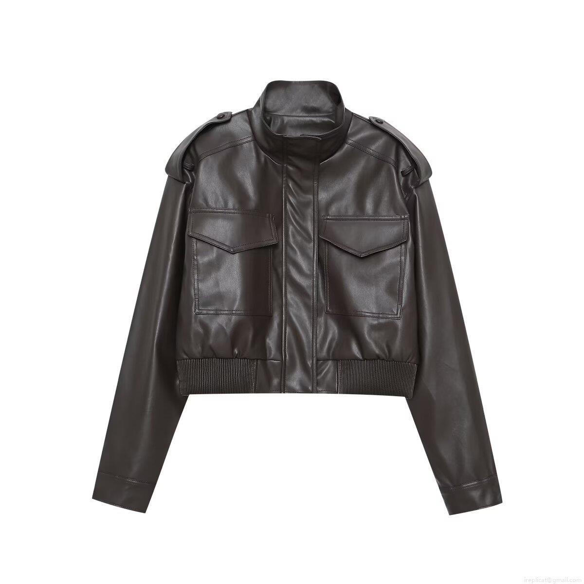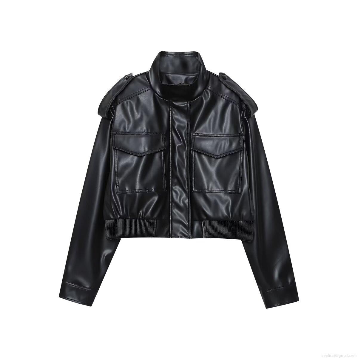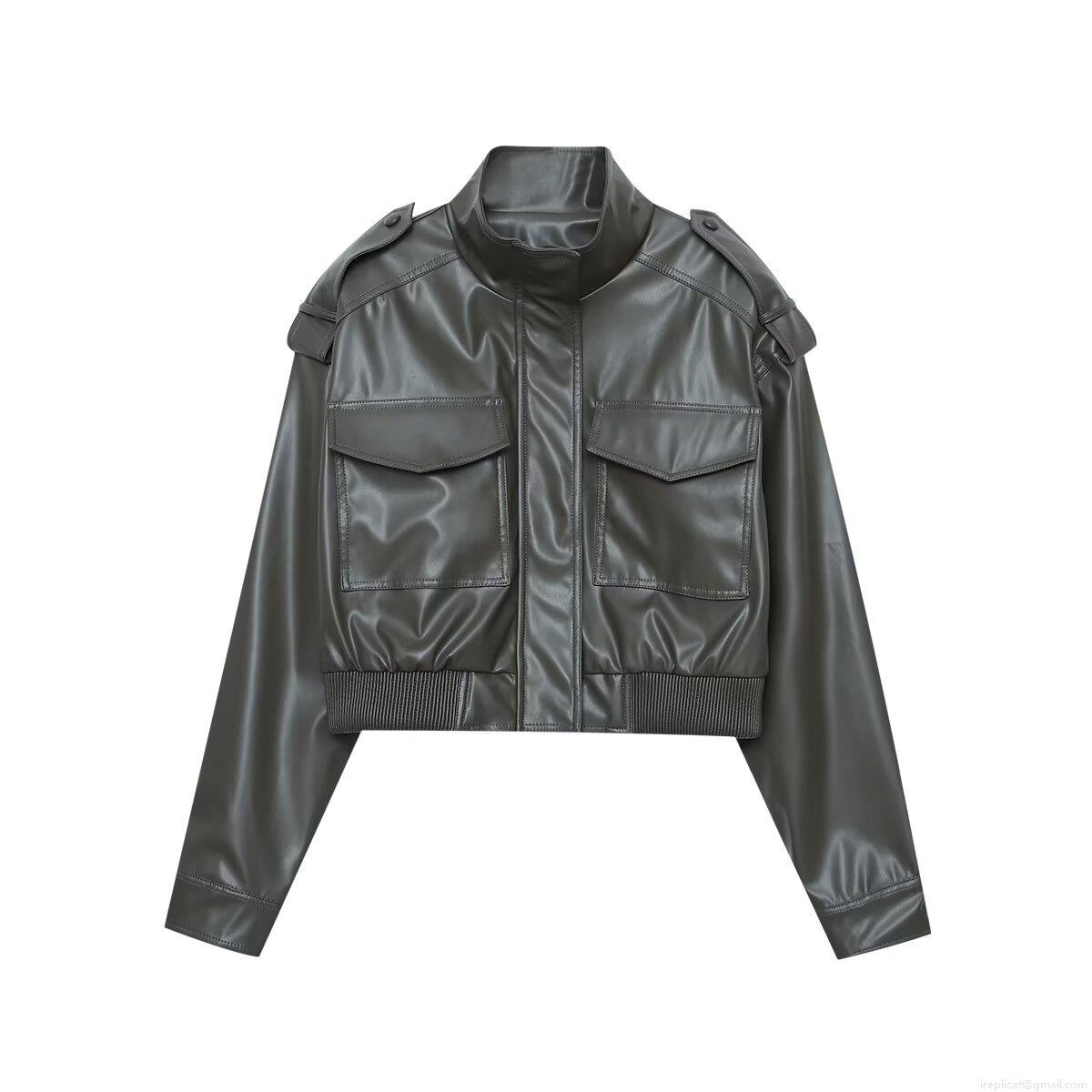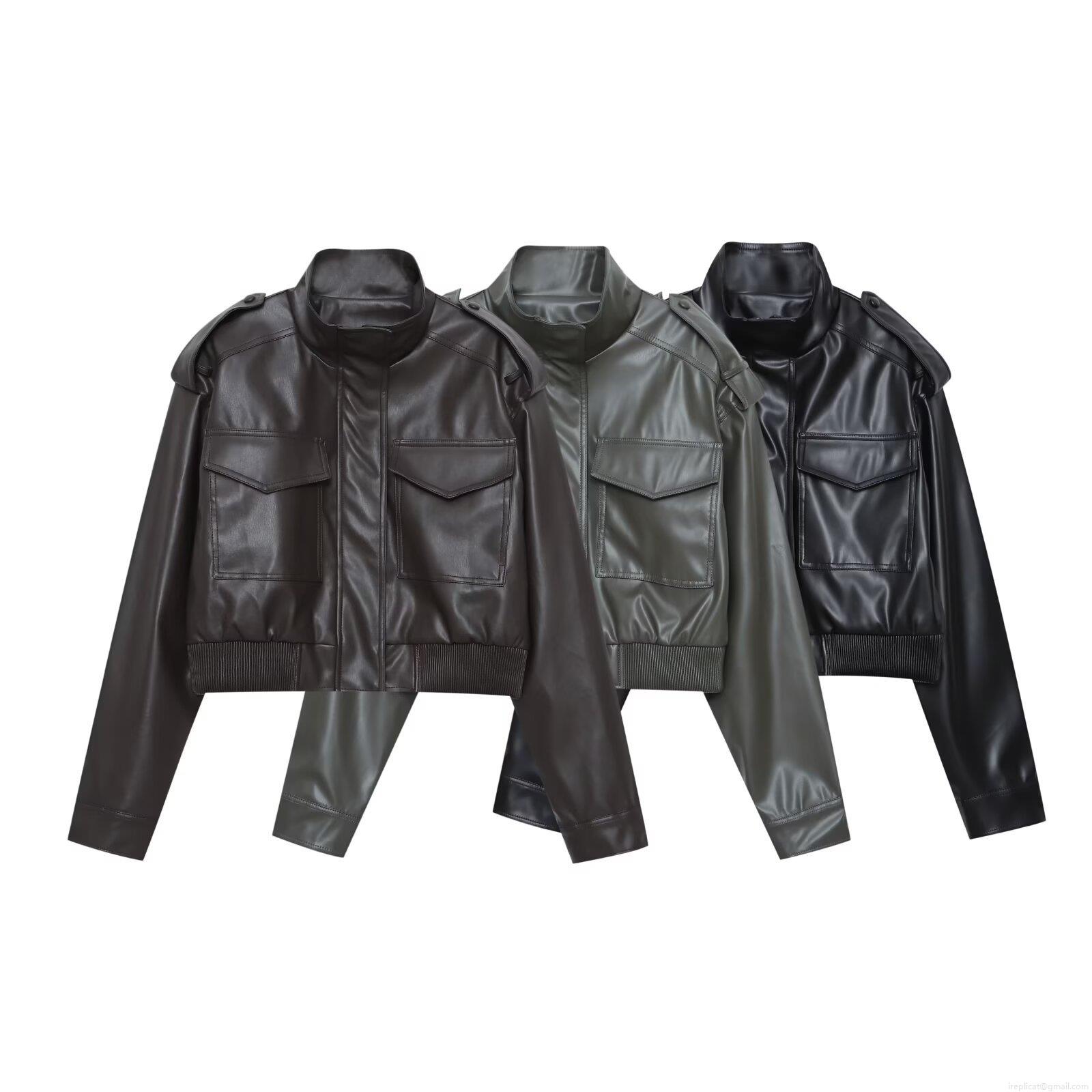 • Women's Retro PU Leather Jacket Stand Collar Loose Bomber Coat With Pockets Epaulettes Streetwear Faux Leather Solid Color Long Sleeve Zip Up Outerwear Autumn Winter