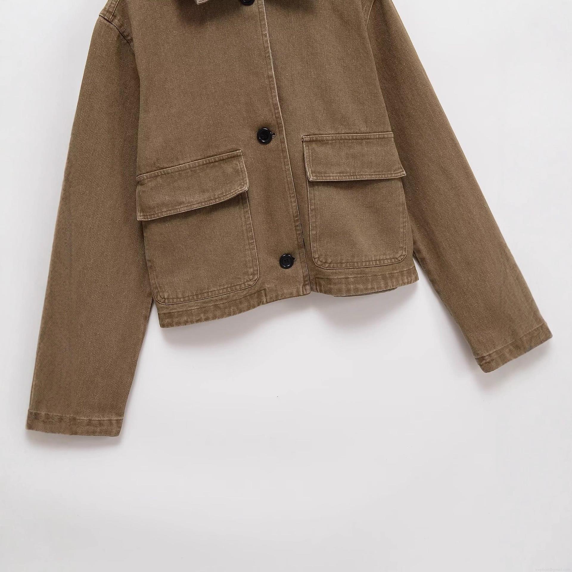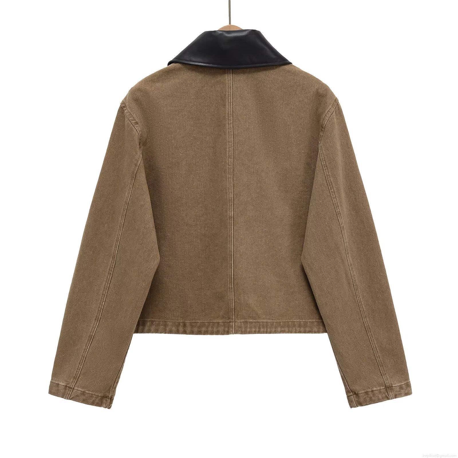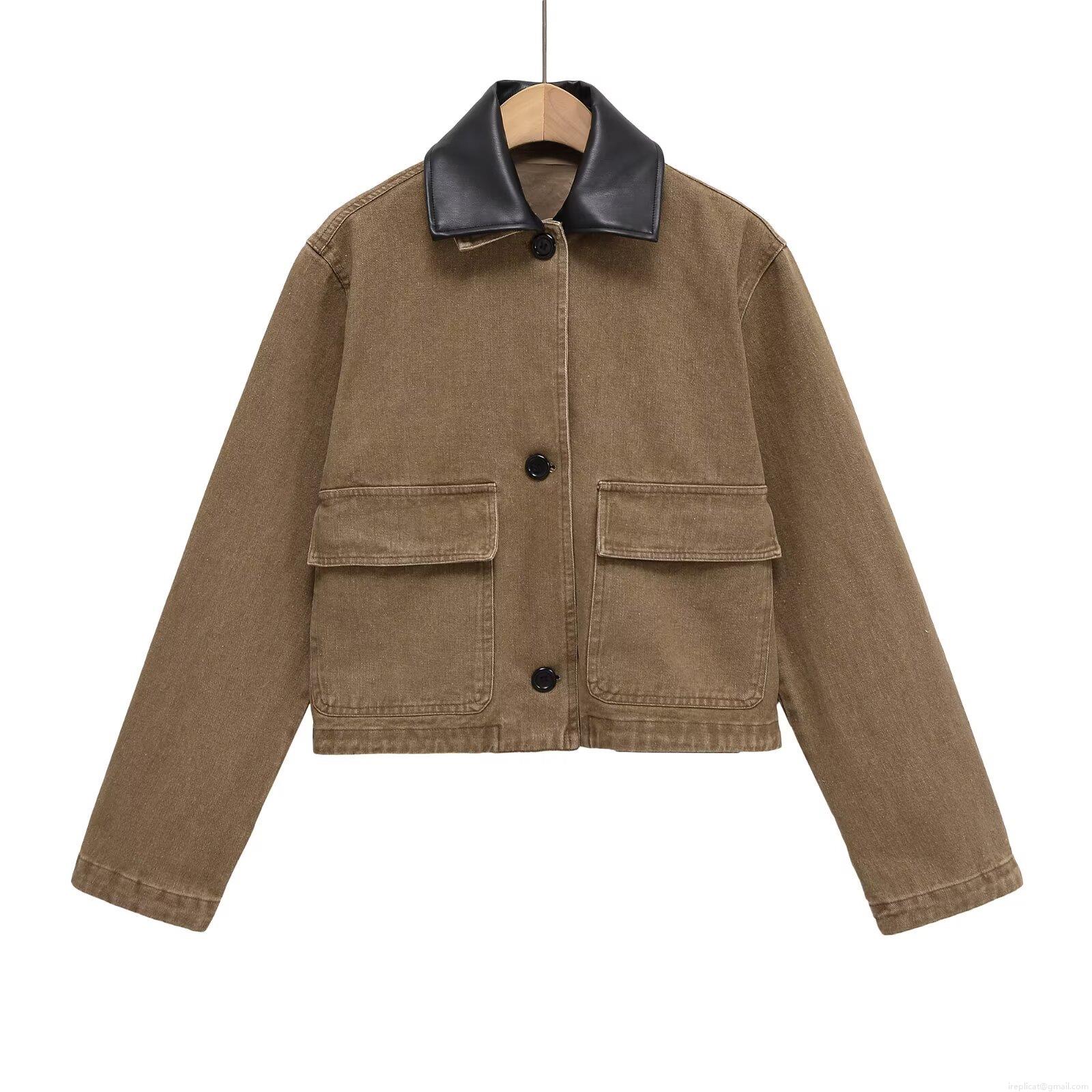 • Women's Retro Short Jacket With Spliced PU Leather Collar Long Sleeve Street Style Cotton Blend Outerwear With Flap Pockets Casual Autumn Coat For Lady