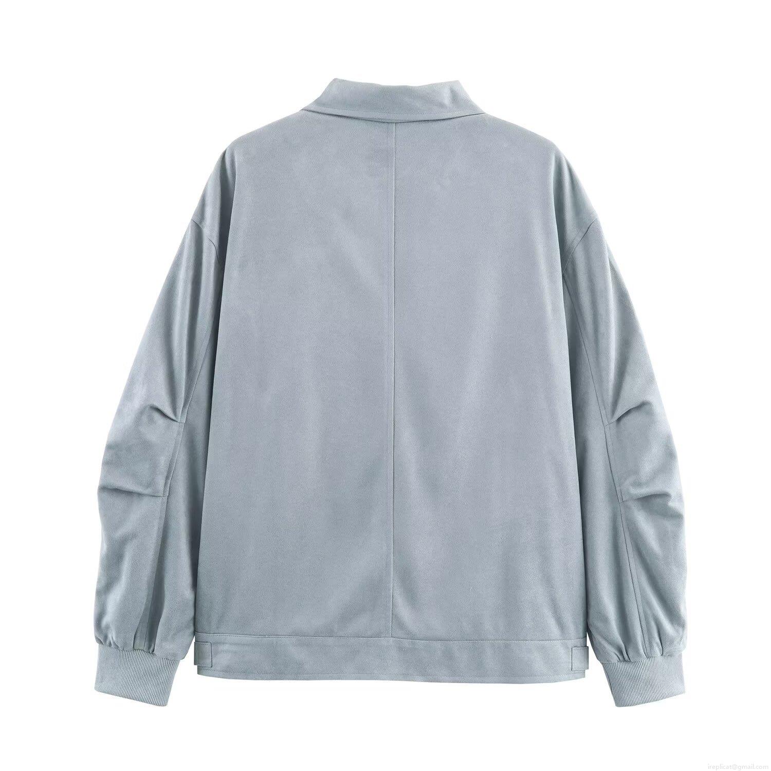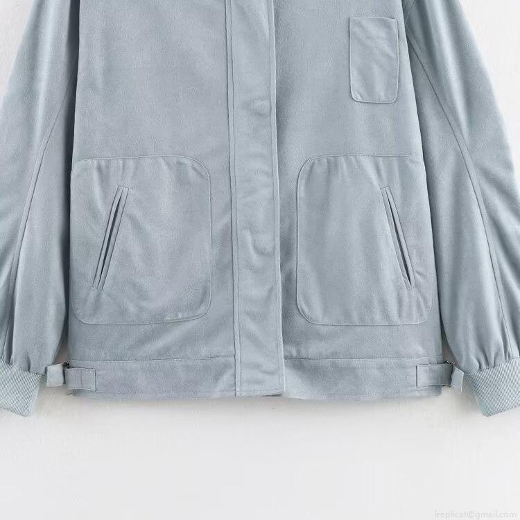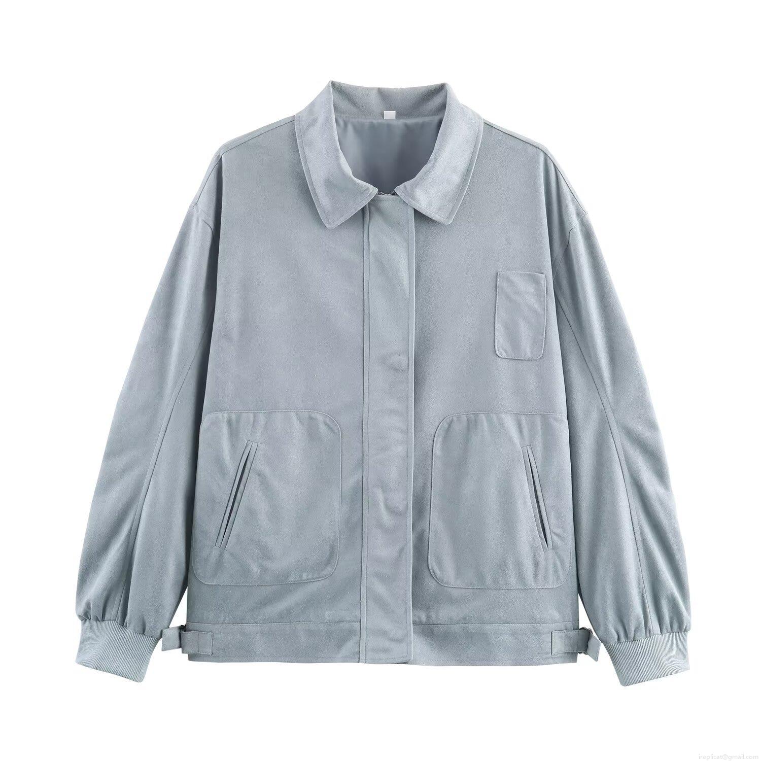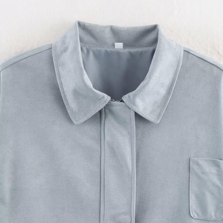 • Women's Retro Solid Color Lapel Loose Suede Jacket Casual Long Sleeve Short Coat Streetwear Utility Style Outerwear For Women Spring Autumn Light Blue Polyester Suede Fabric Jacket With Pockets