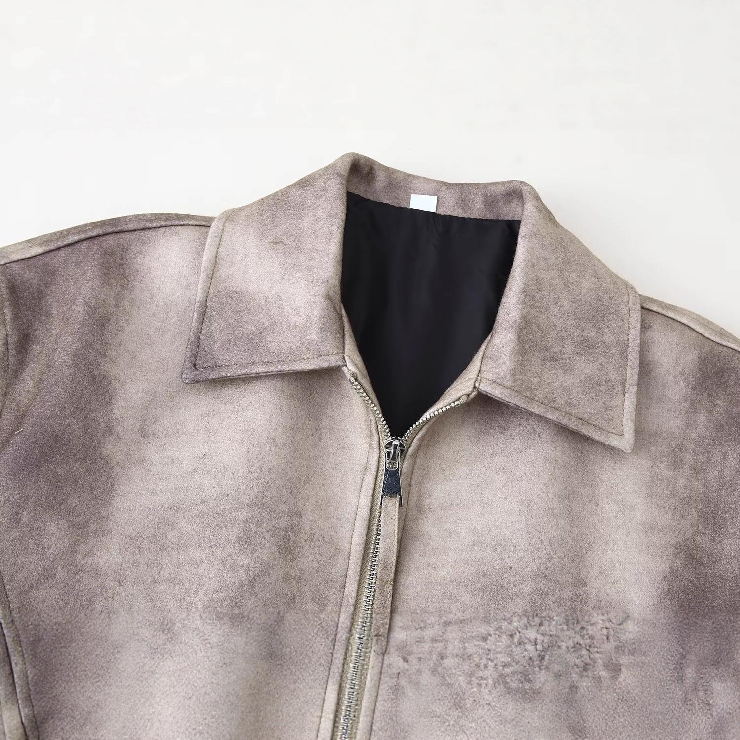 Women's Retro Washed Faux Suede Tie-Dye Short Jacket Outerwear With Lapel Zipper Long Sleeve Loose Casual Streetwear Polyester Coat For Women